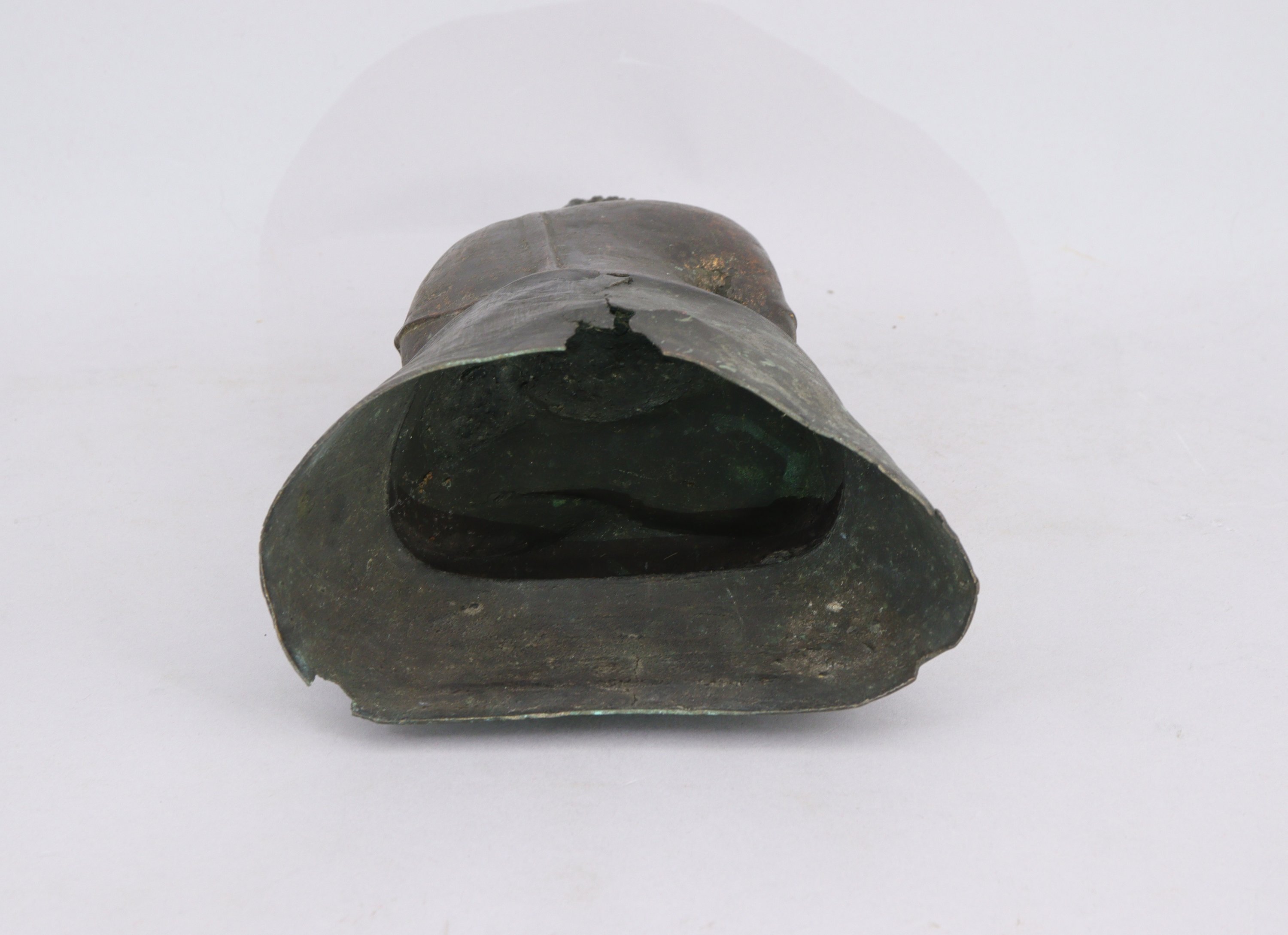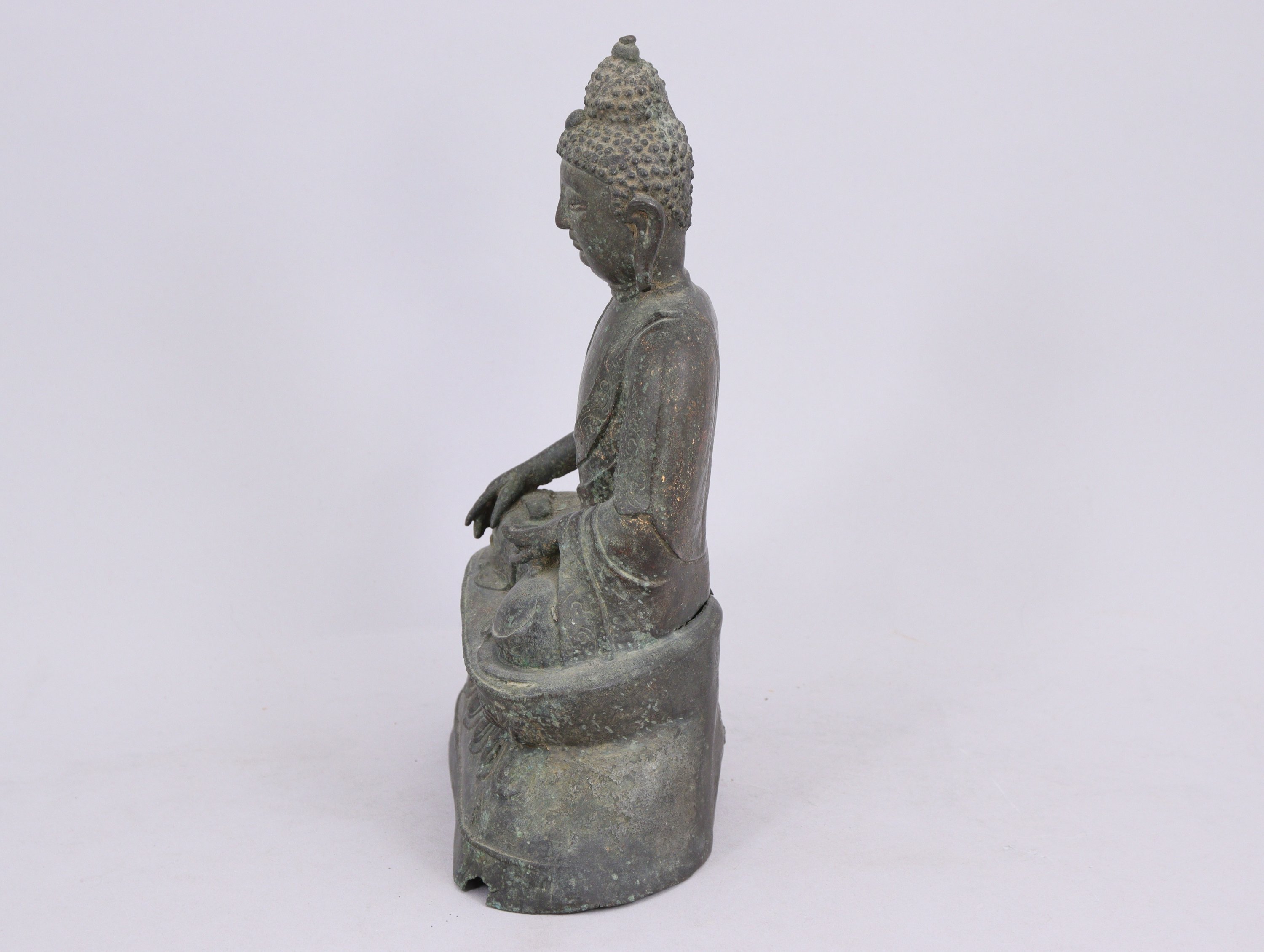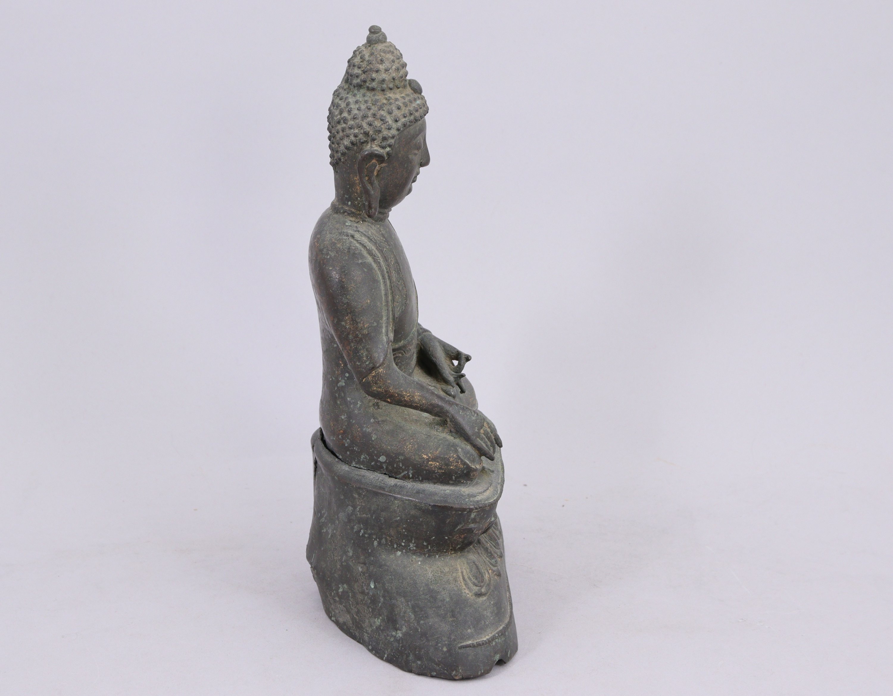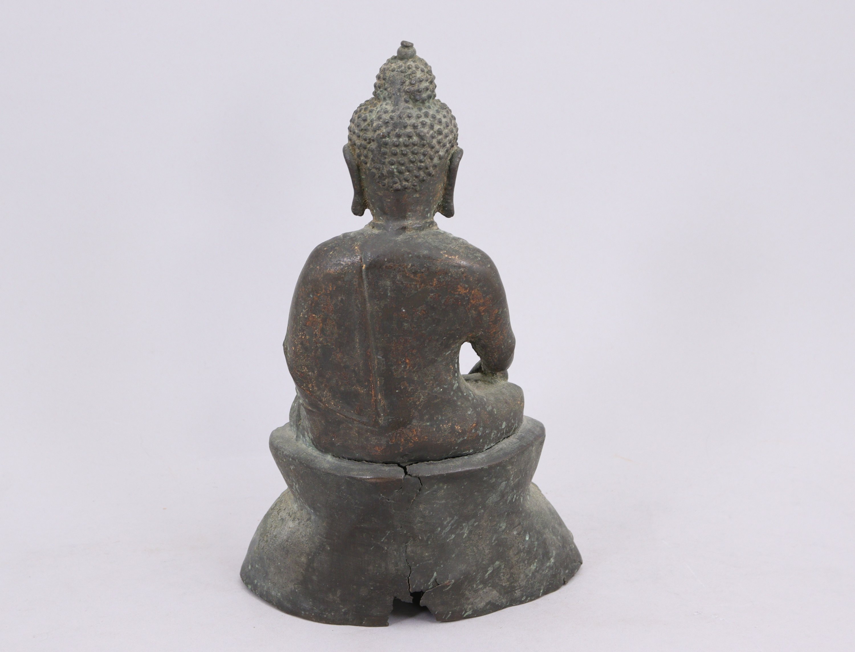 en bronze à patine brune à traces de laque or, assis en padmasana sur un double socle en forme de lotus, les mains en bhumisparsa mudra (geste de la prise de la terre à témoin).