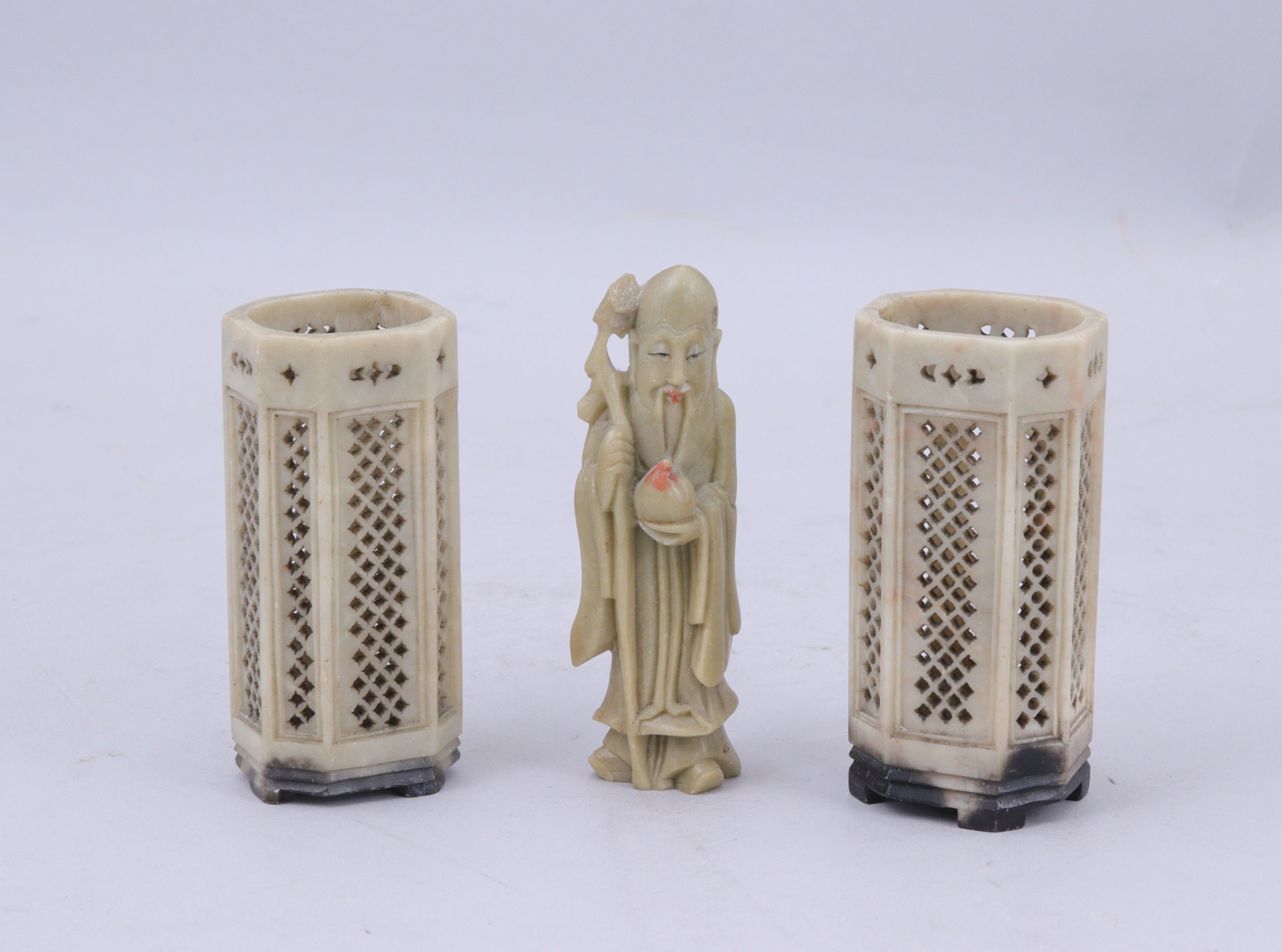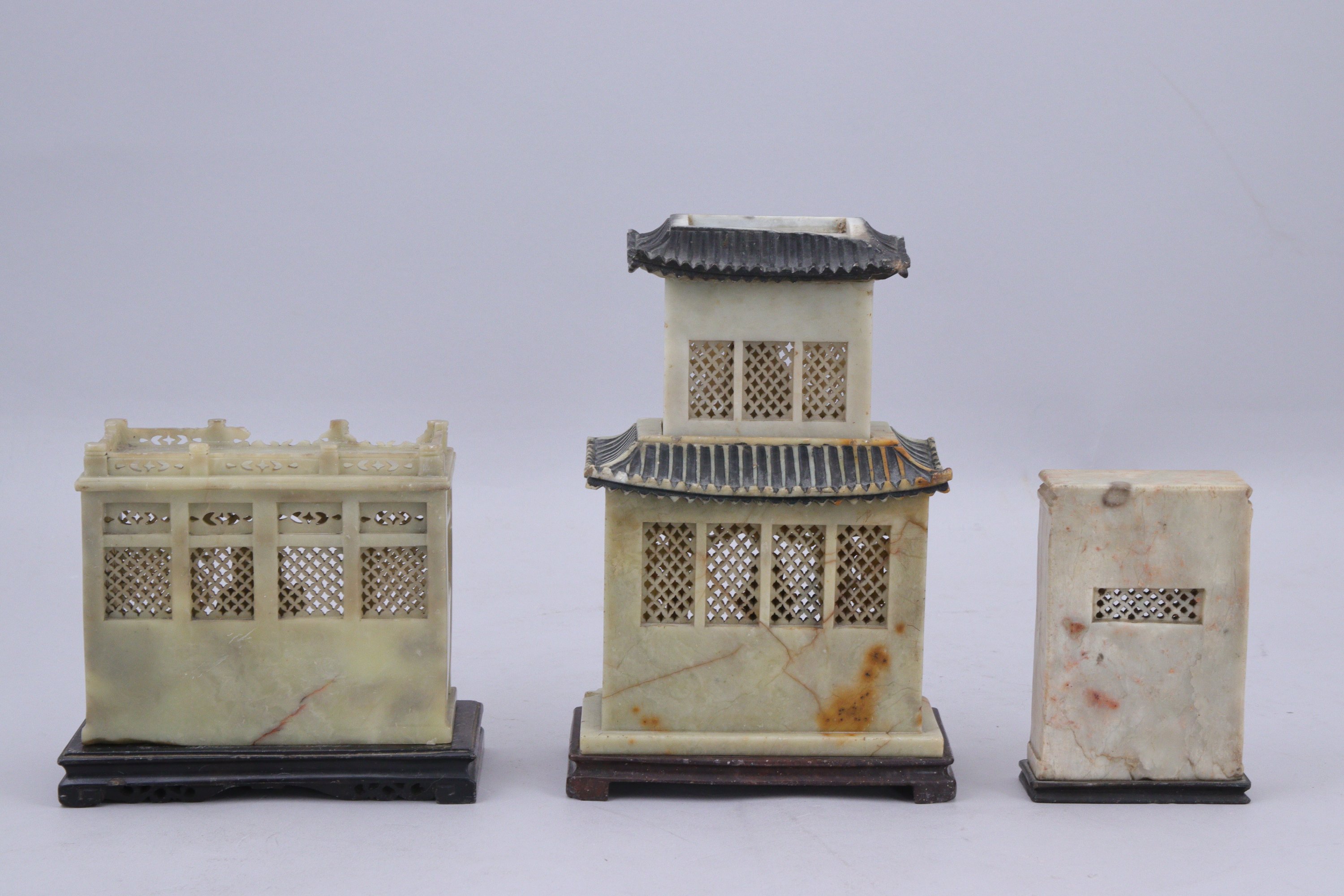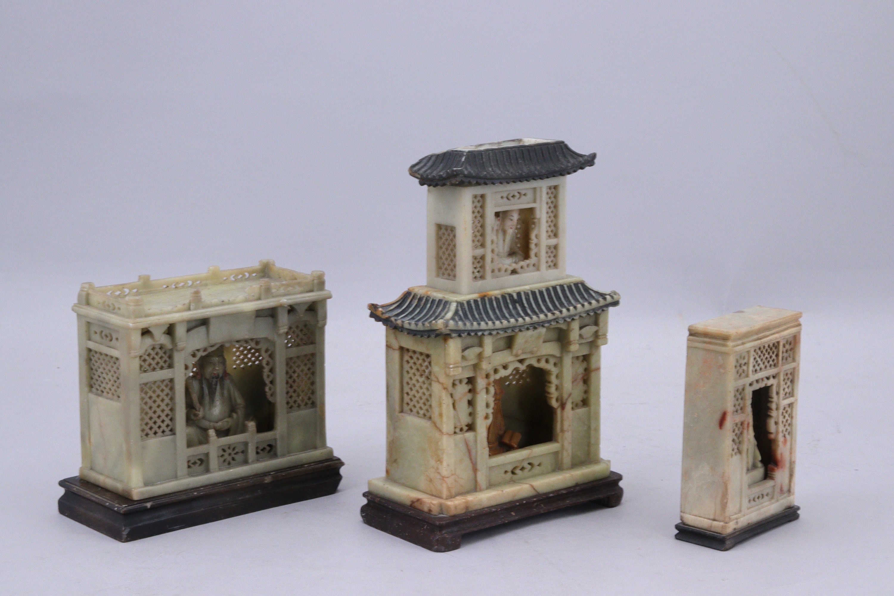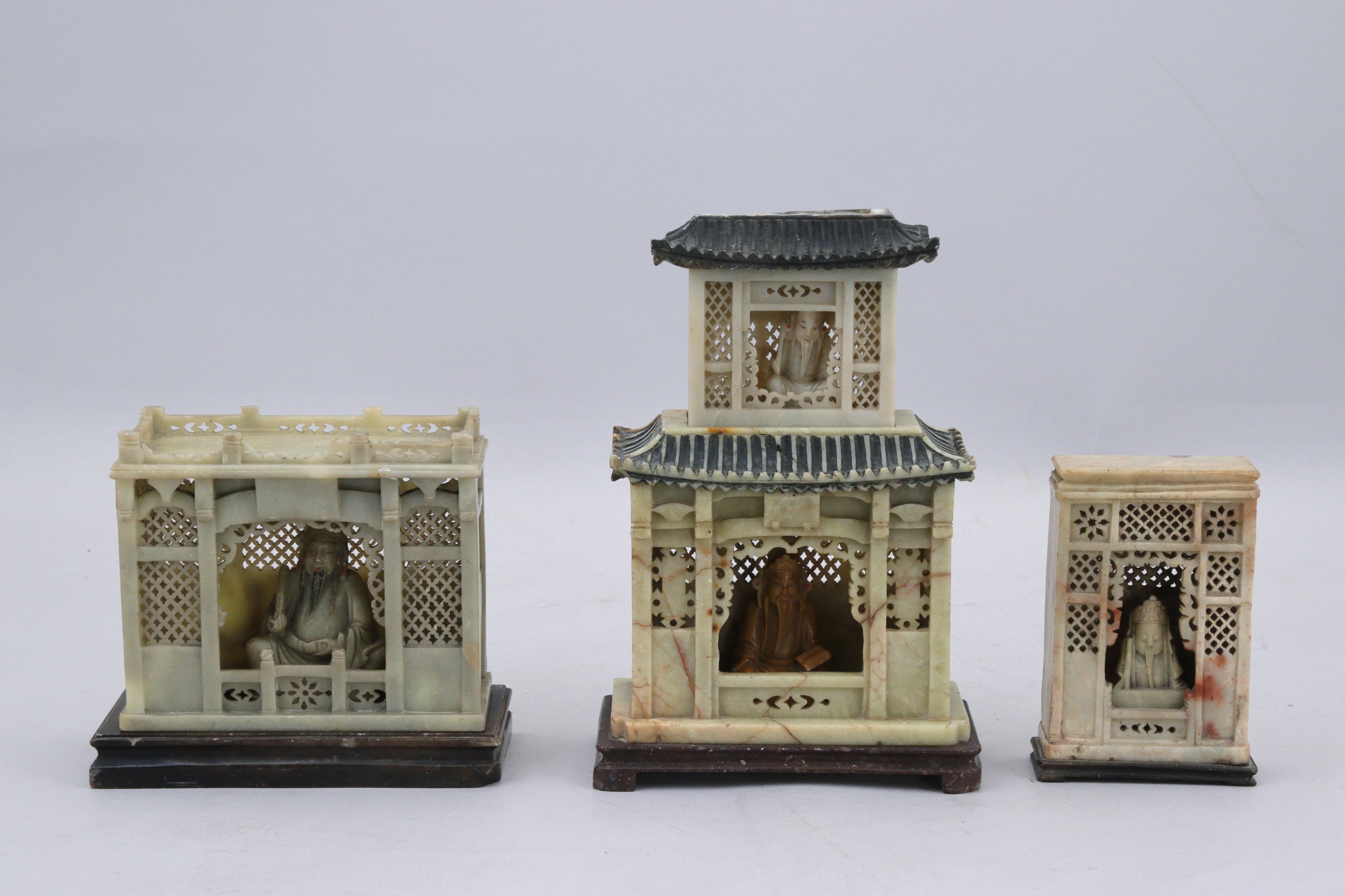 Réunion de trois temples miniatures dans lesquels siègent des sages aux longues barbes