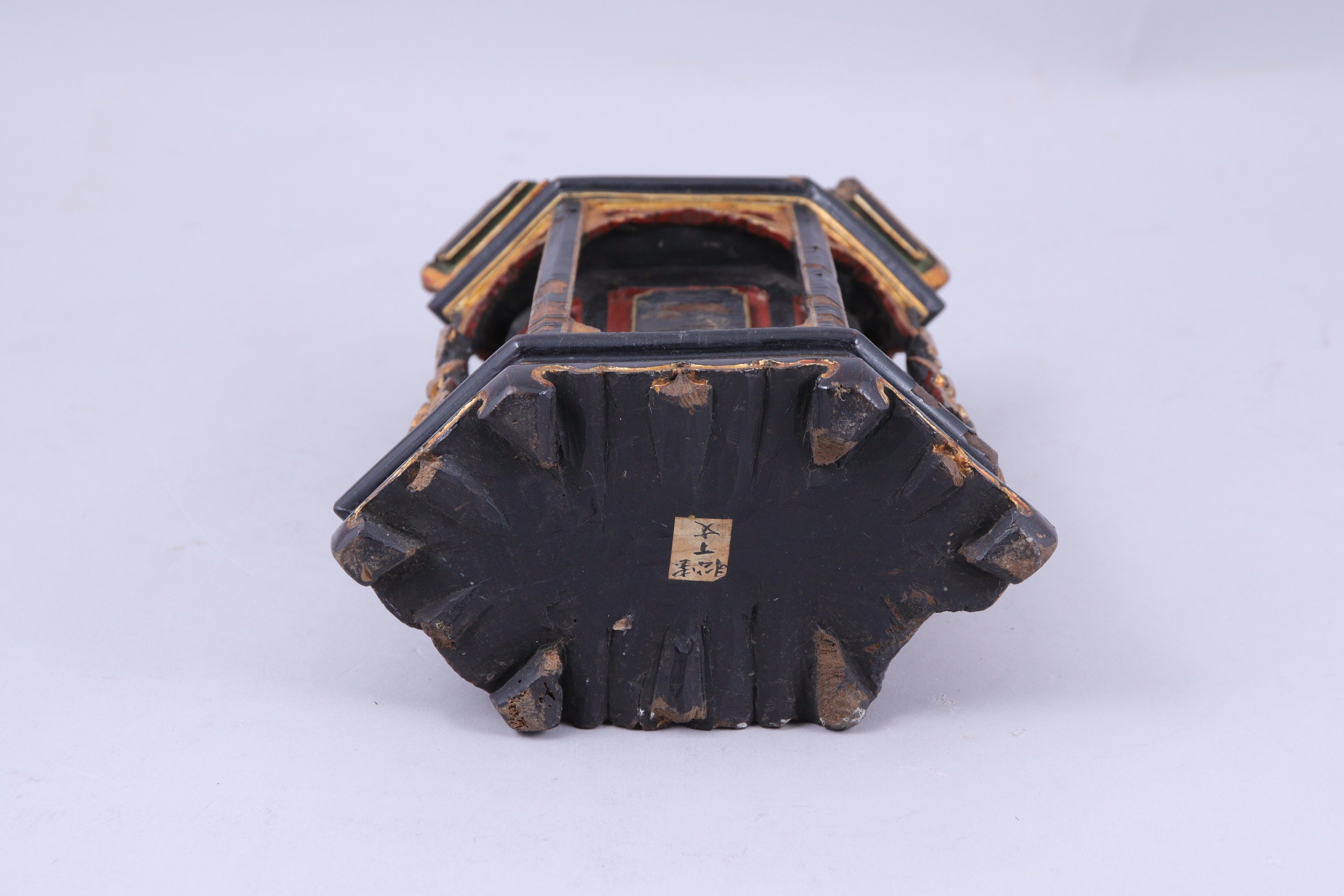 En bois sculpté doré et laqué. Une niche en partie centrale figurant en hauts reliefs des lettrés.