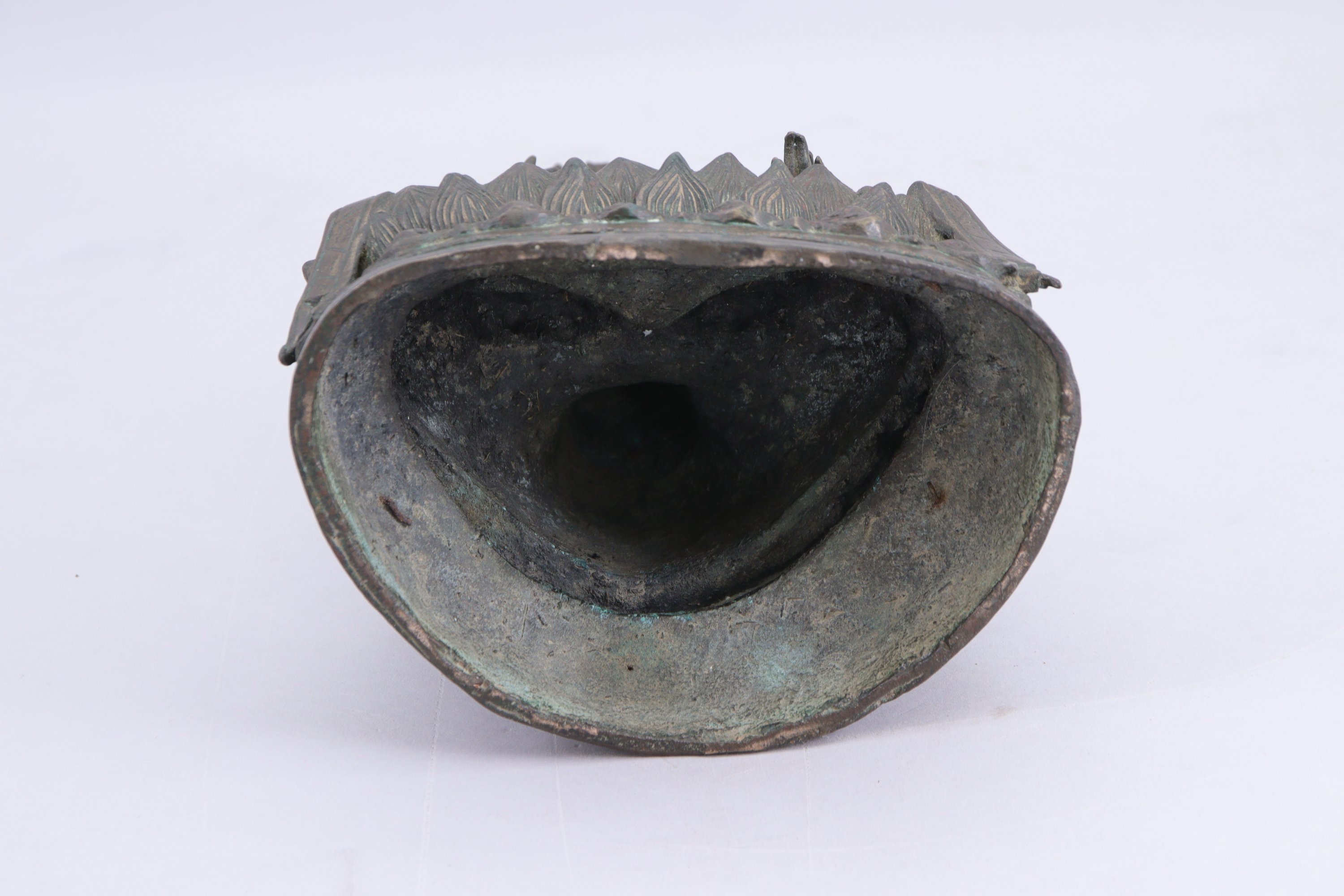en bronze à patine brune, assise sur un socle en forme de lotus, tenant dans ses mains des tiges supportant des attributs.