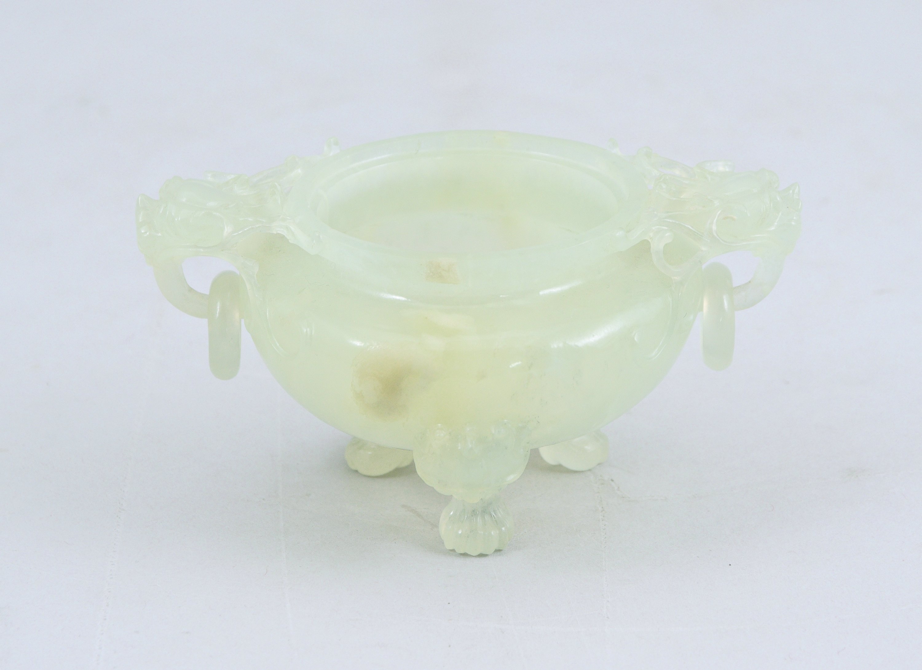 en serpentine reposant sur trois pieds, à décor de têtes de dragons et anneaux.
