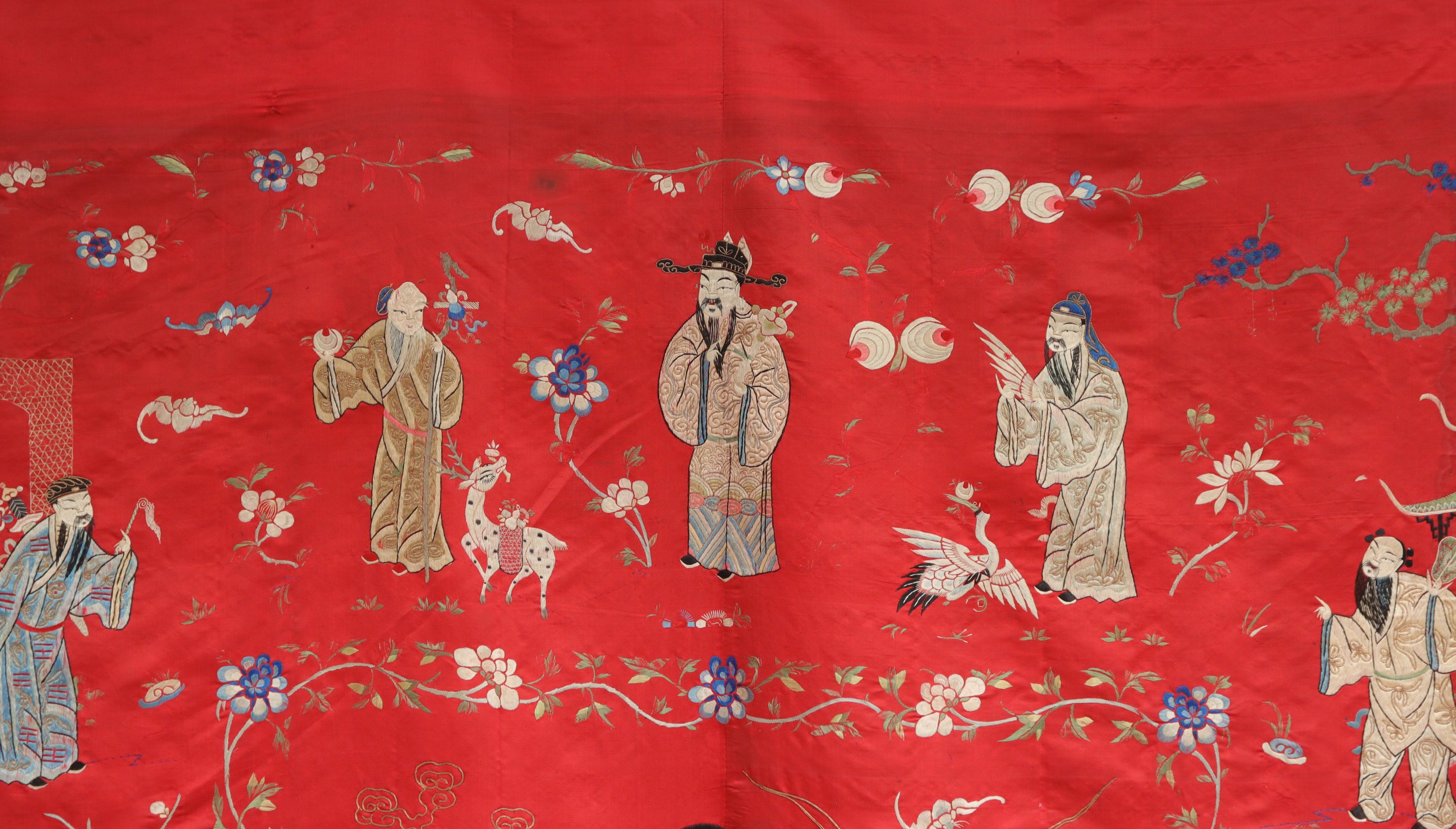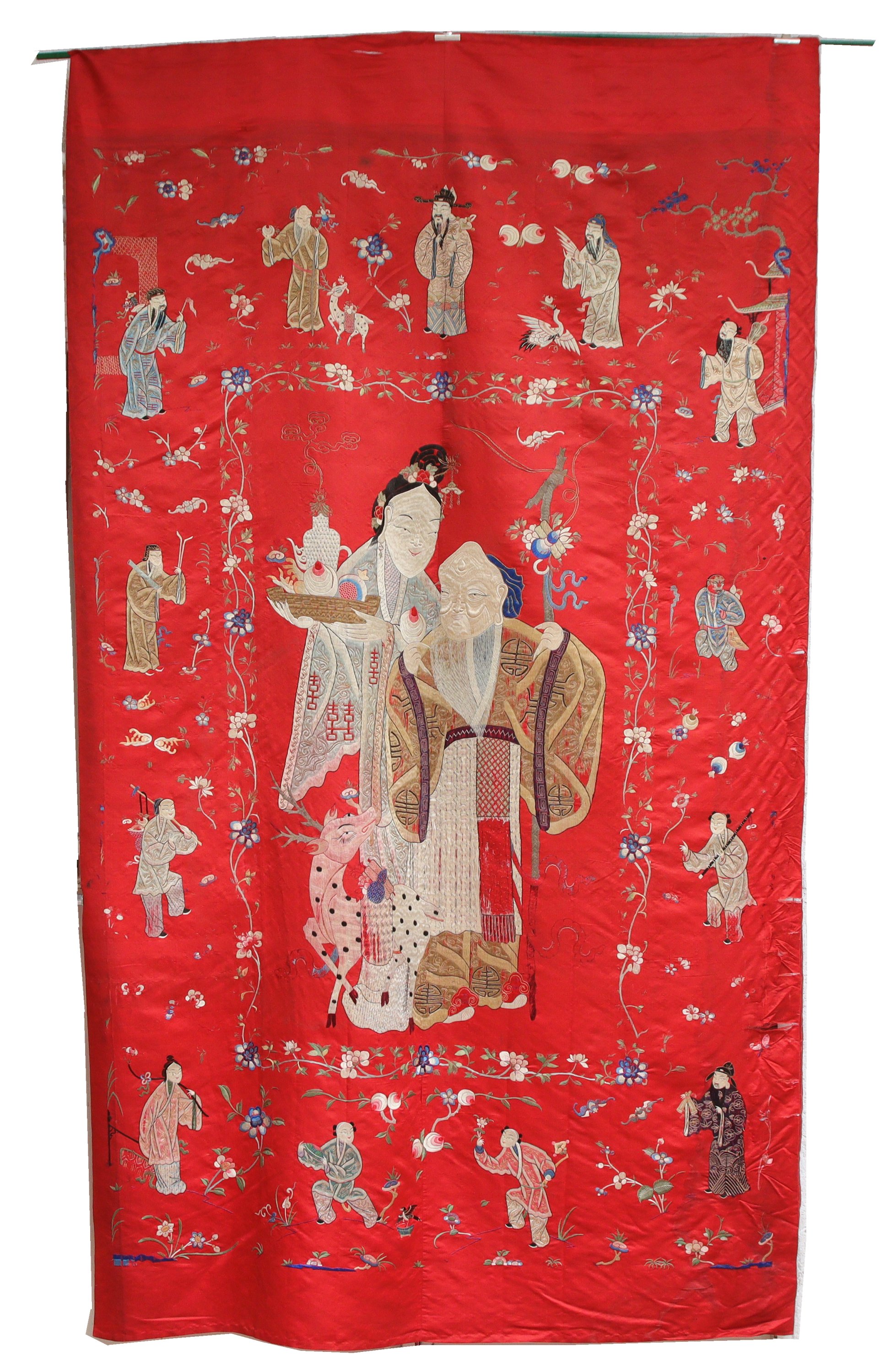 Broderie aux fils polychromes sur soie rouge, représentant une jeune femme près de lui et son daim devant lui, les côtés ornés de frises fleuries et personnages.