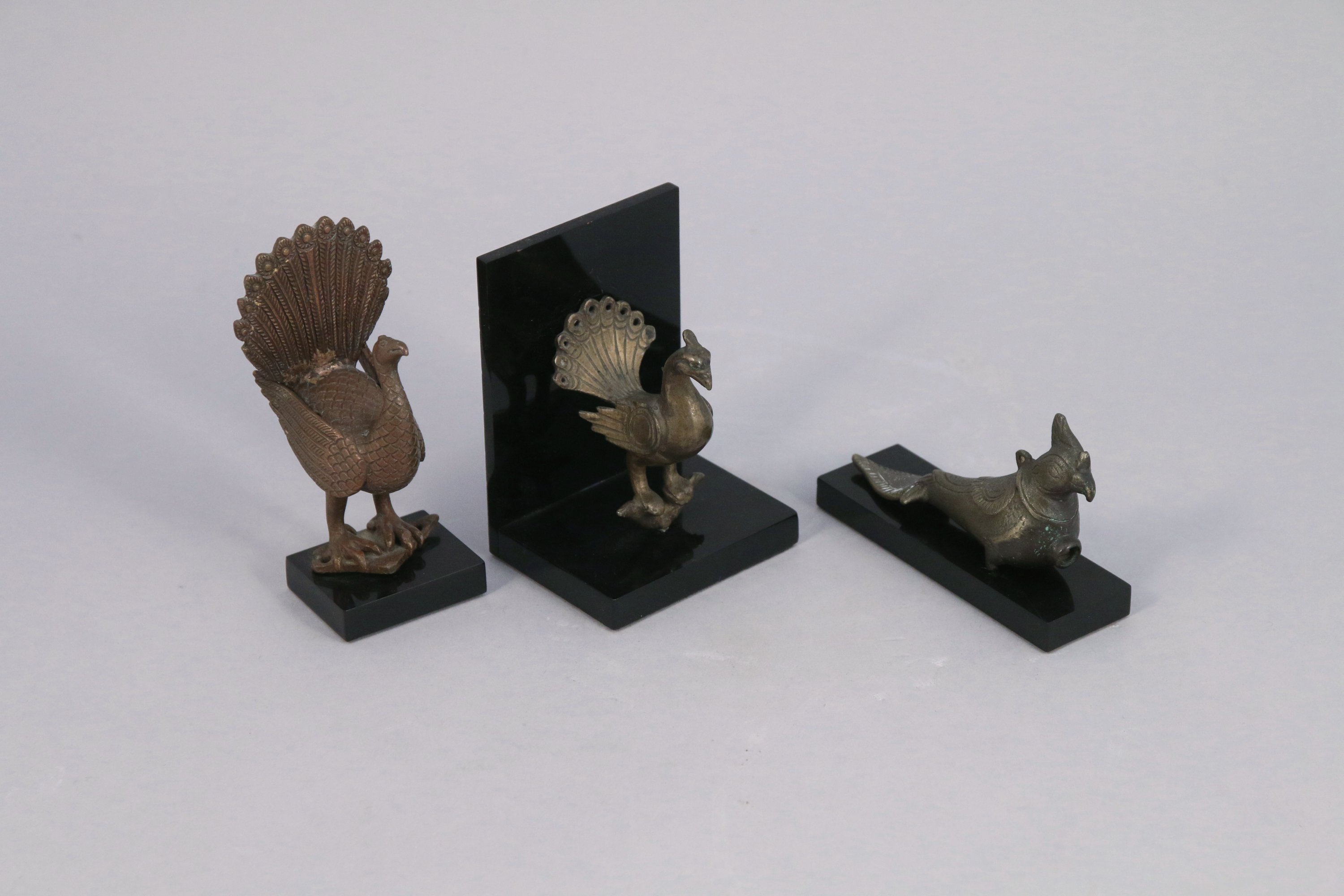 en bronze, lune à crête triangulaire et bec courbe formant un flacon pouvant être suspendu par un anneau, les deux autres représentant un paon faisant la roue. Sur socle.