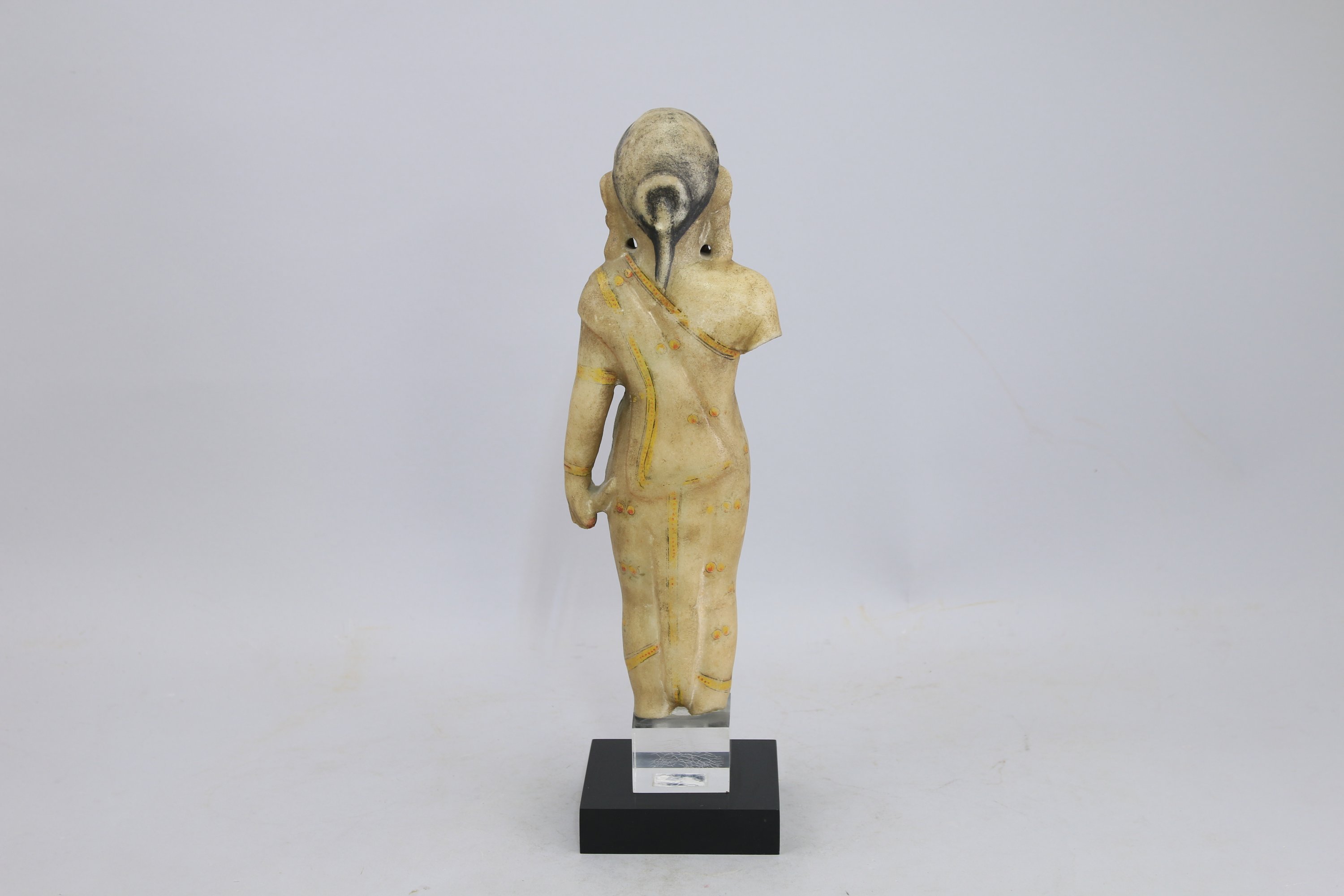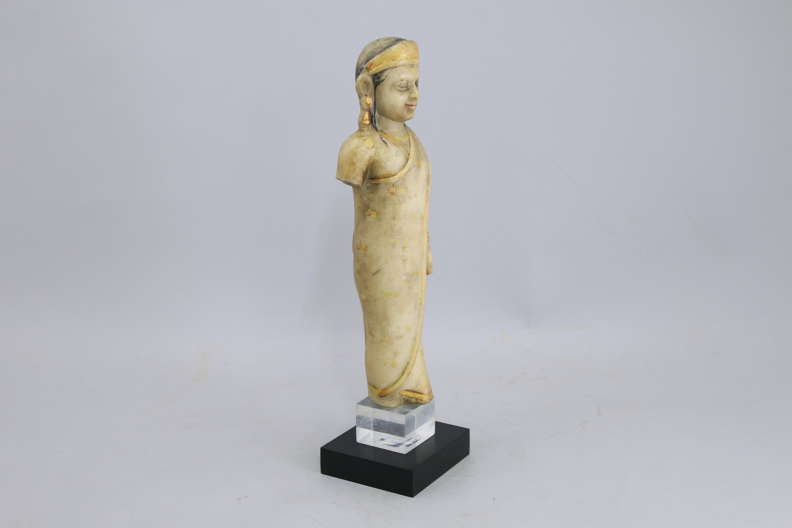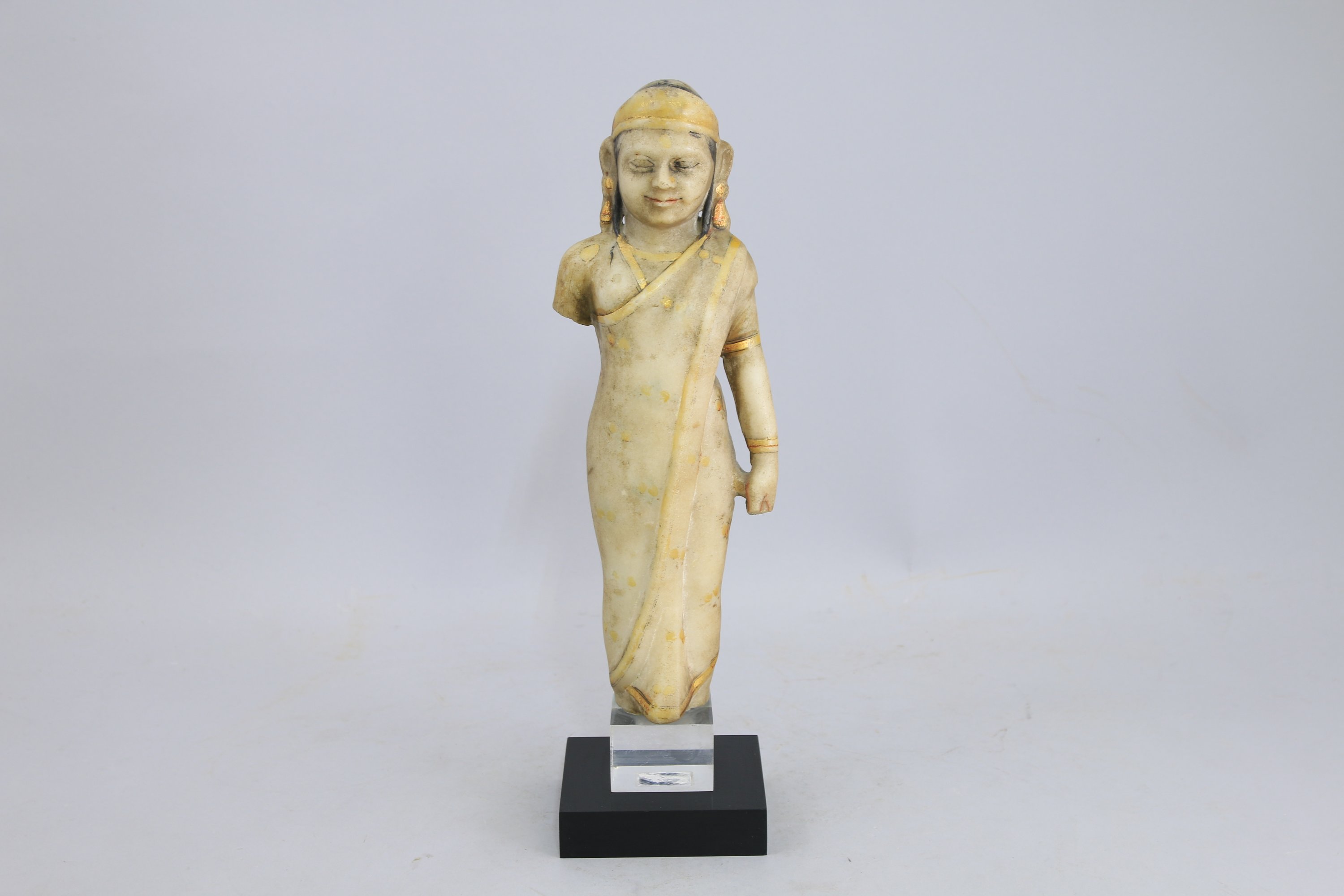 en albâtre peint à traces de polychromie et or debout, vêtue d'une longue robe, la main gauche le long de son corps.