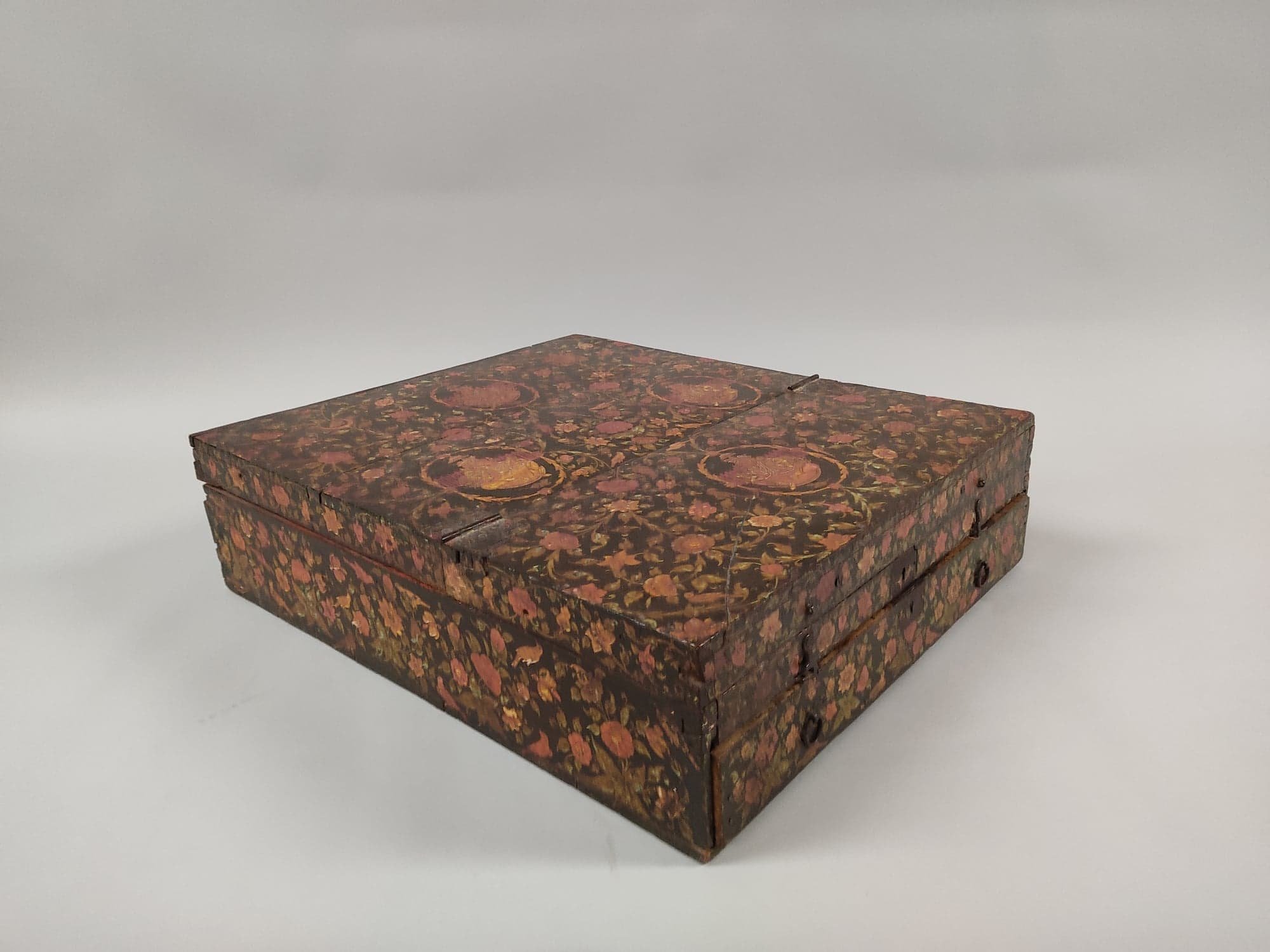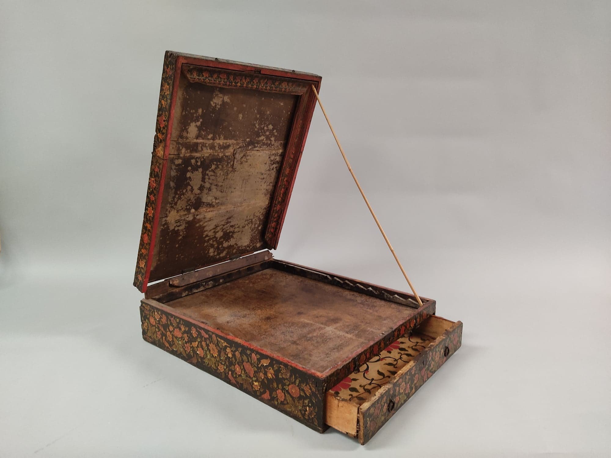 à décor peint et laqué, de forme rectangulaire, à couvercle articulé et tiroir, et posé sur quatre pieds métalliques. En bois peint en polychromie rehaussée de dorure d’un décor de rinceaux floraux intégrant des figures de Ganesh dans des médaillons.