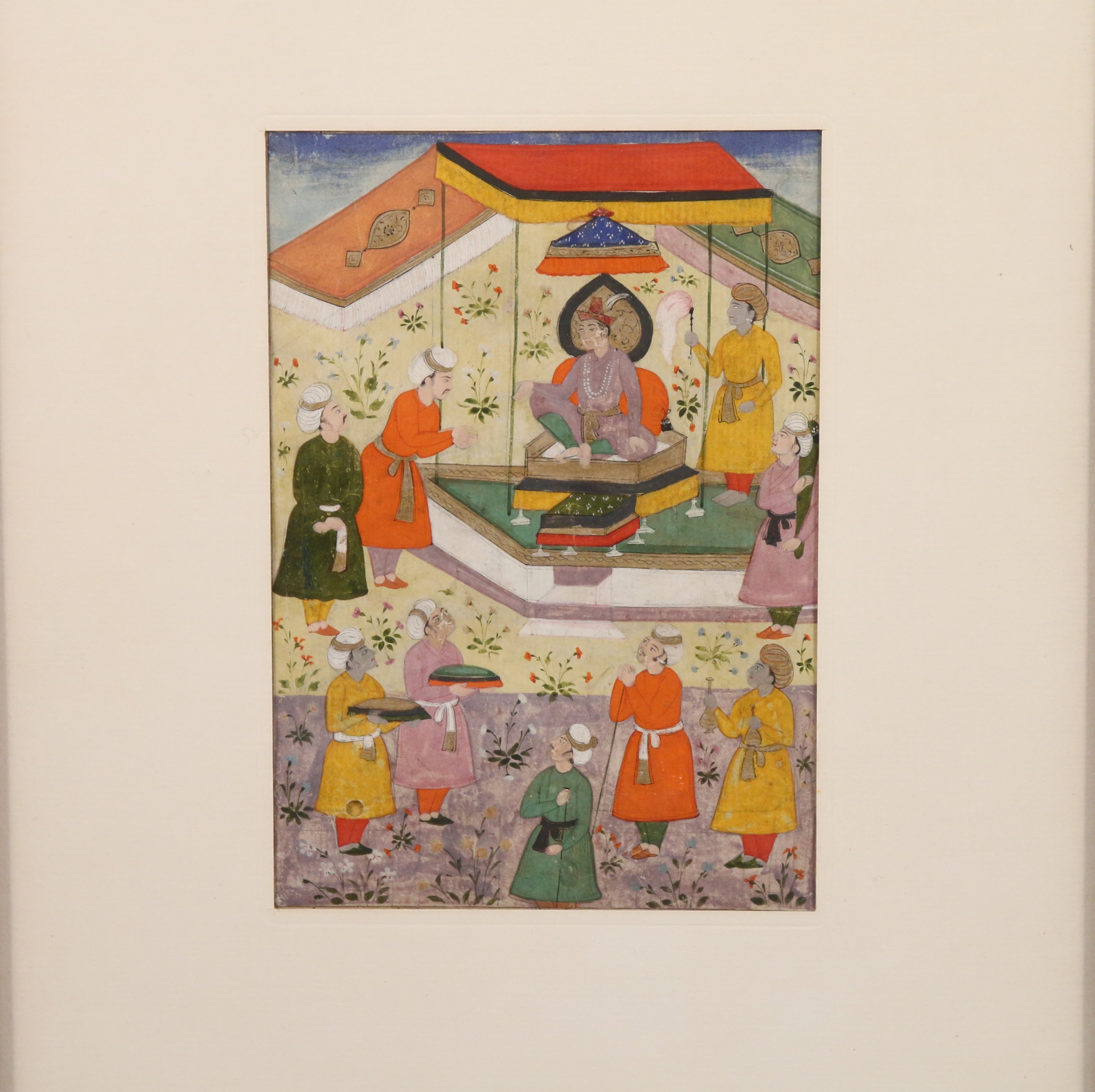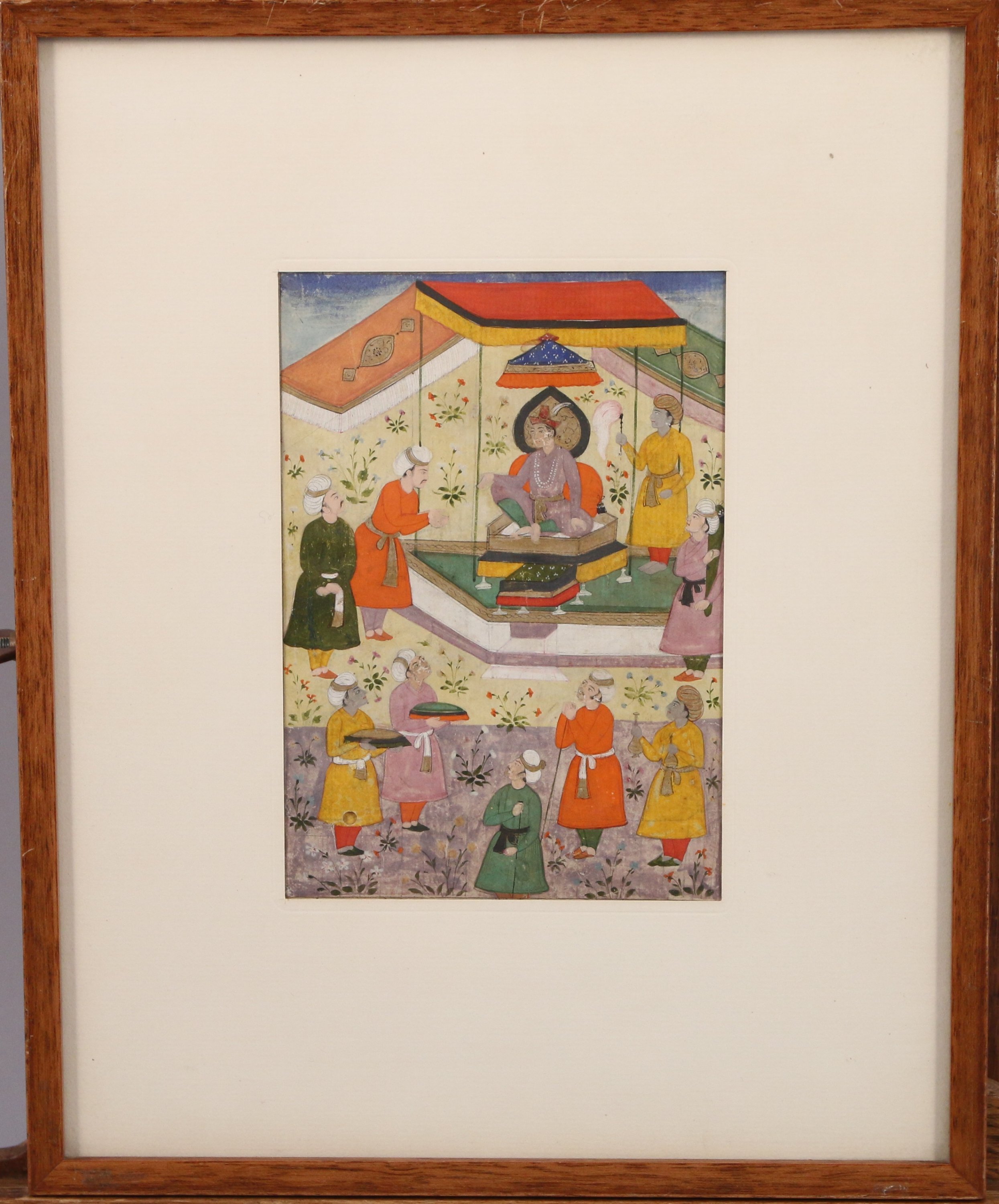 Page de manuscrit illustrée d'une scène où un roi, assis sur un trône et entouré de deux serviteurs, reçoit deux dignitaires tandis que des serviteurs apportent des mets devant trois courtisans.