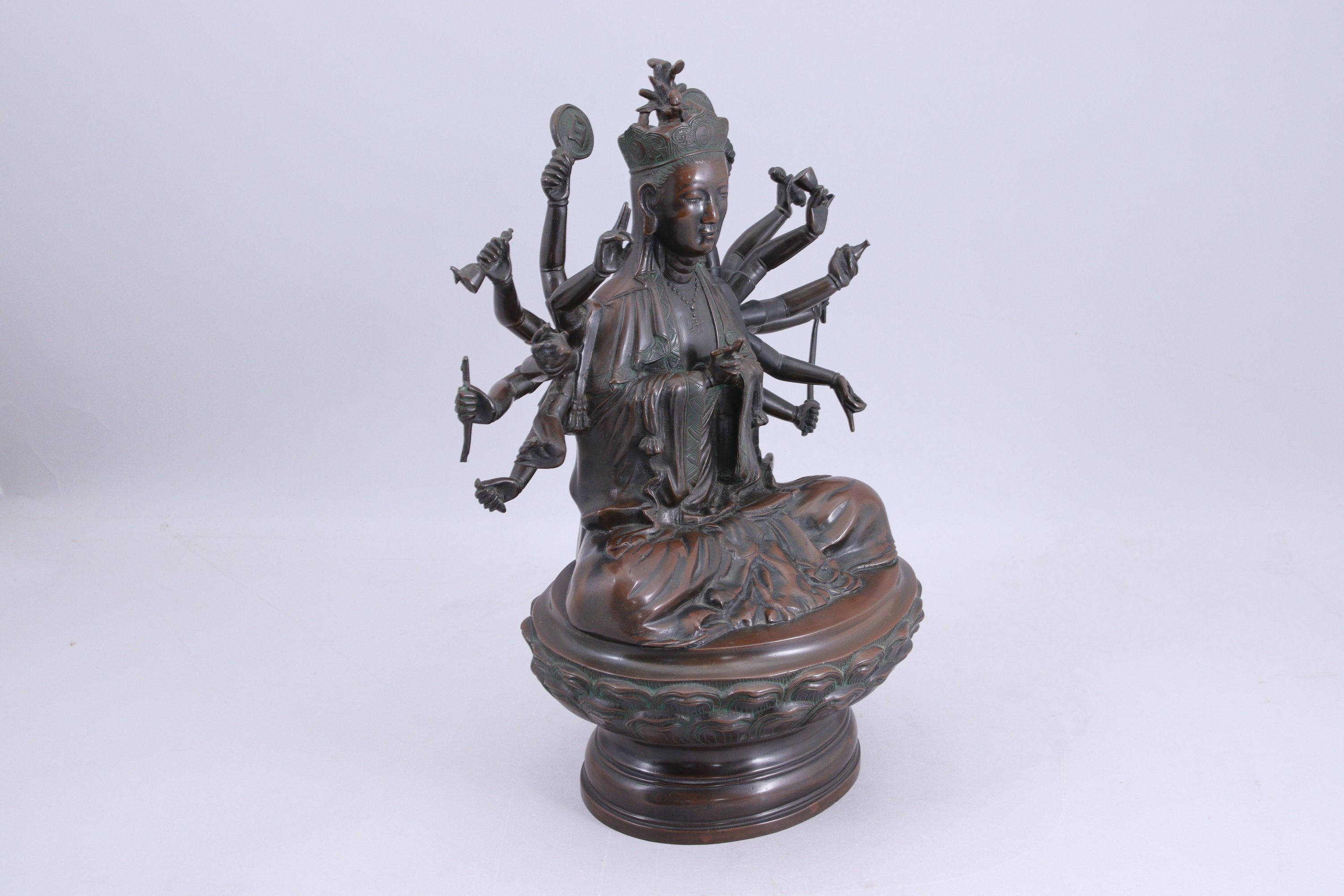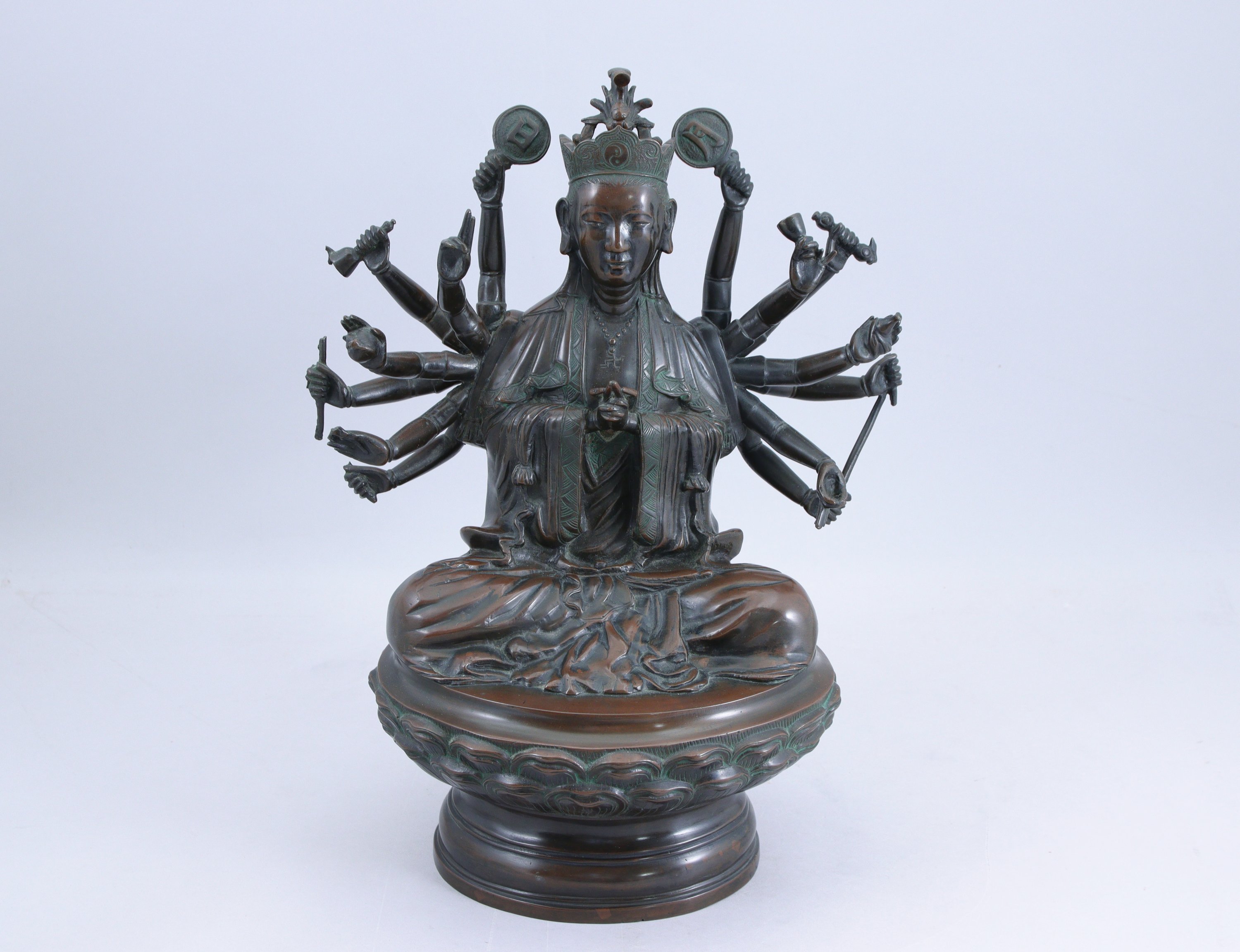 Statue de Guanyin à seize bras assise en padmasana et tenant ses attributs.