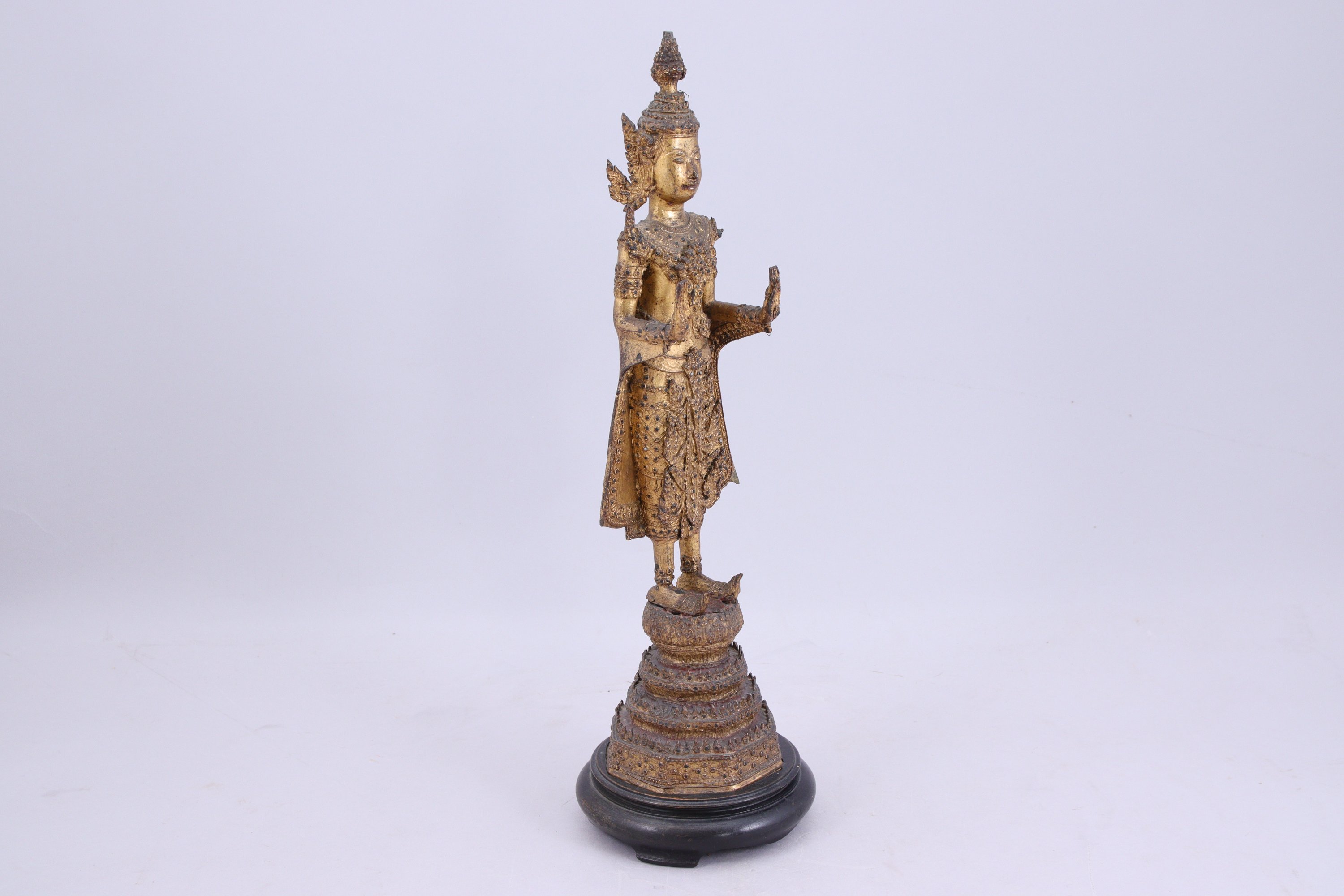 Statuette de Bouddha en bronze laqué or, debout sur une haute base, les mains en abhaya mudra (geste de l'absence de crainte).