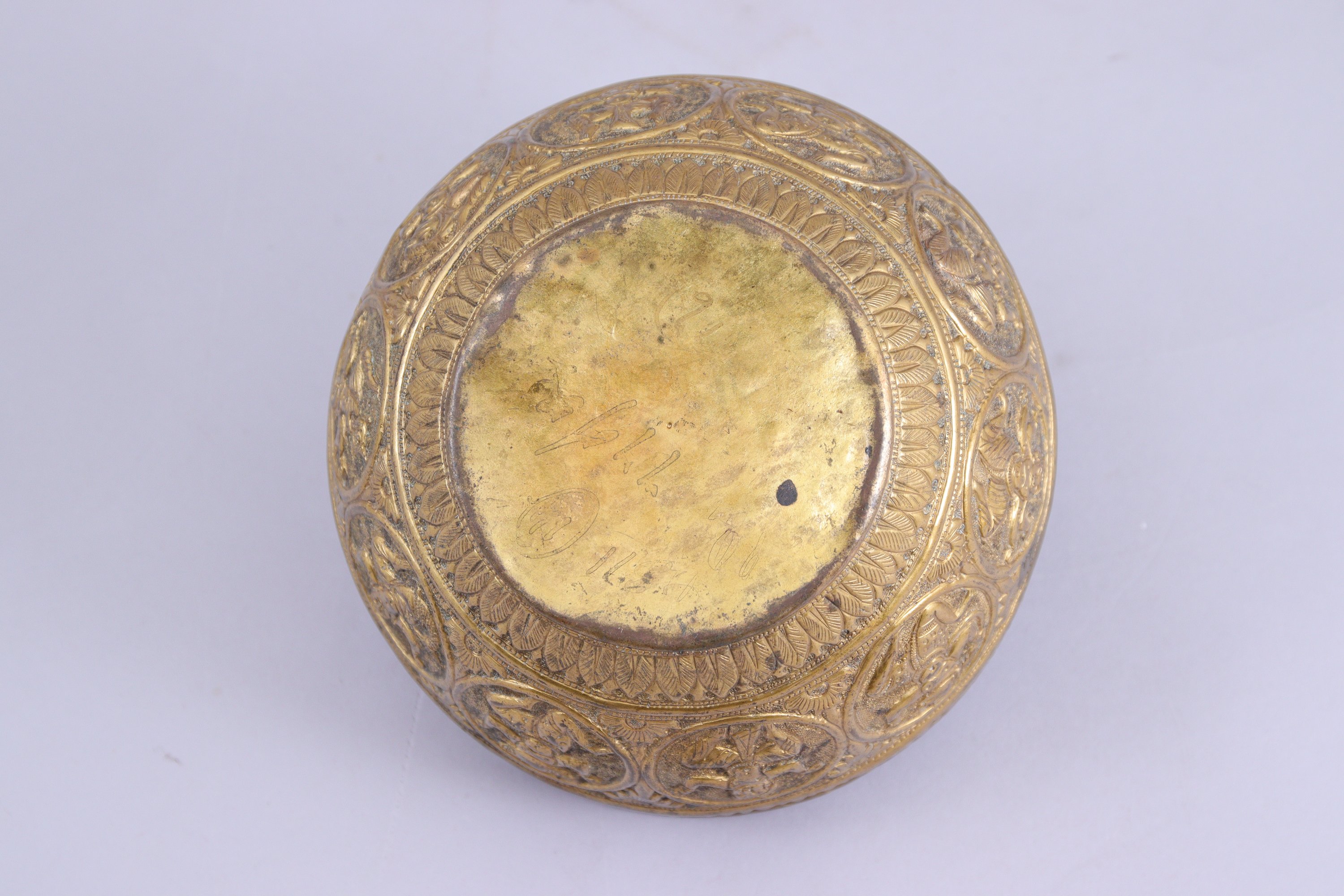 en cuivre repoussé et doré à décor de kinaree et personnages zoomorphe dans des médaillons ronds.