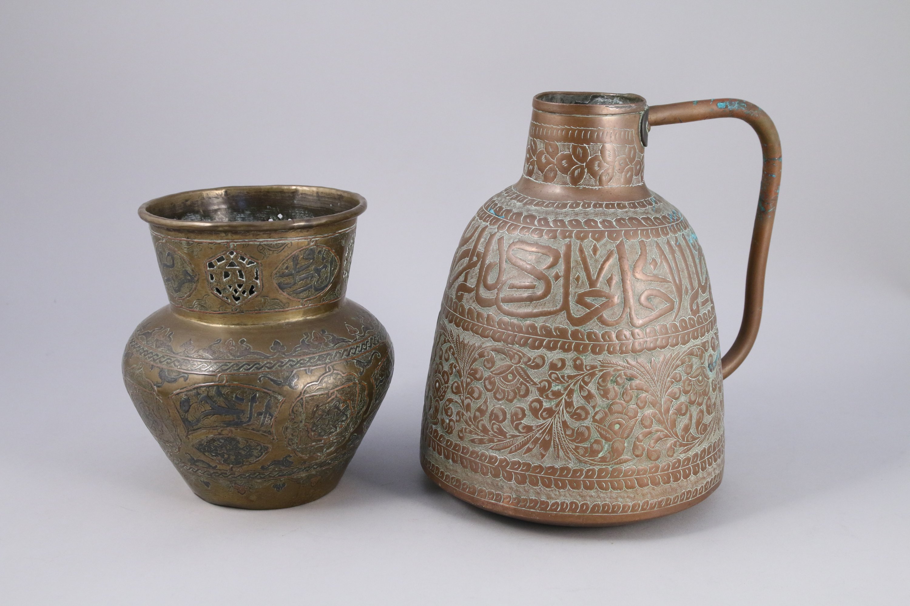 JOINT: IRAN - XIXe s. BROC en cuivre à décor épigraphique et végétal gravé. Haut. 25 cm. (Incrustations d’argent oxydées)