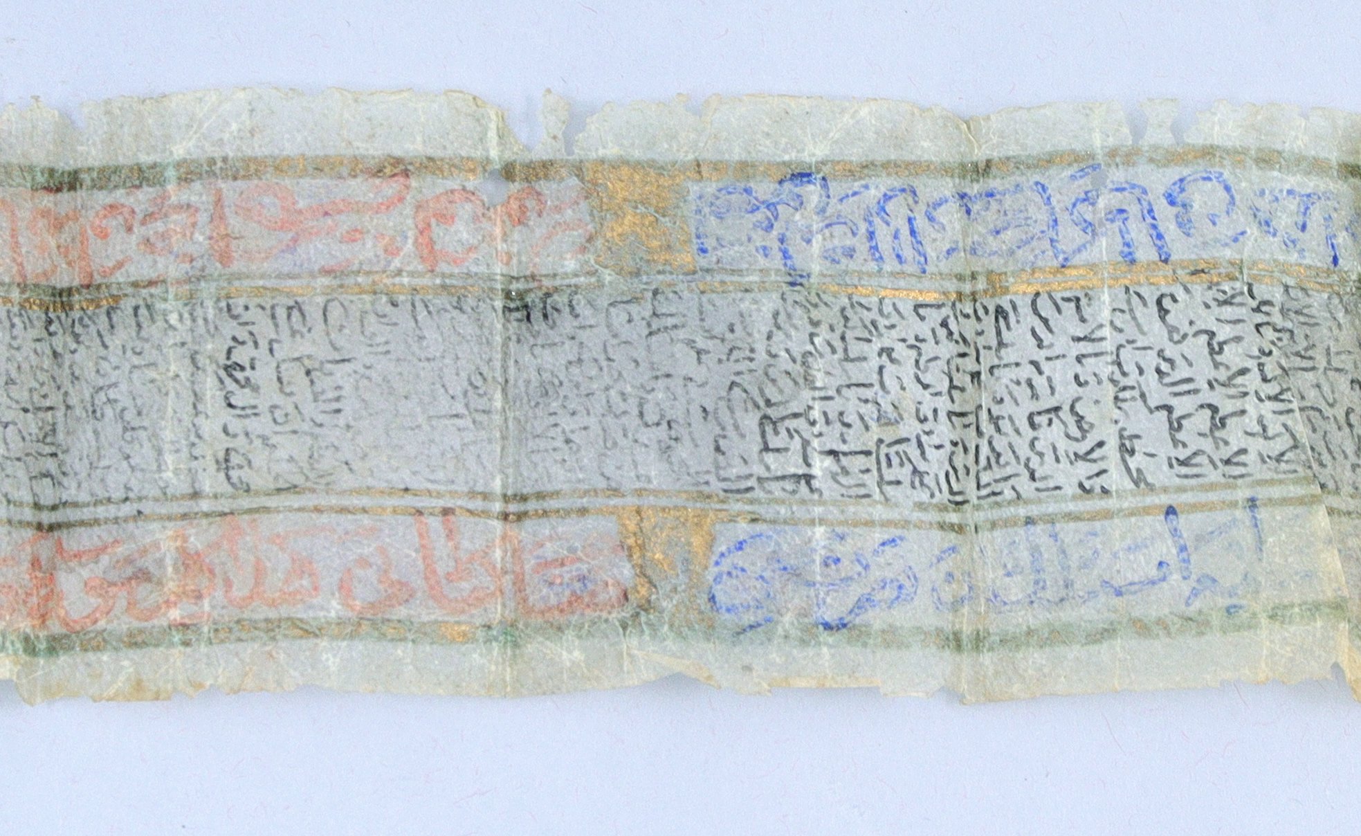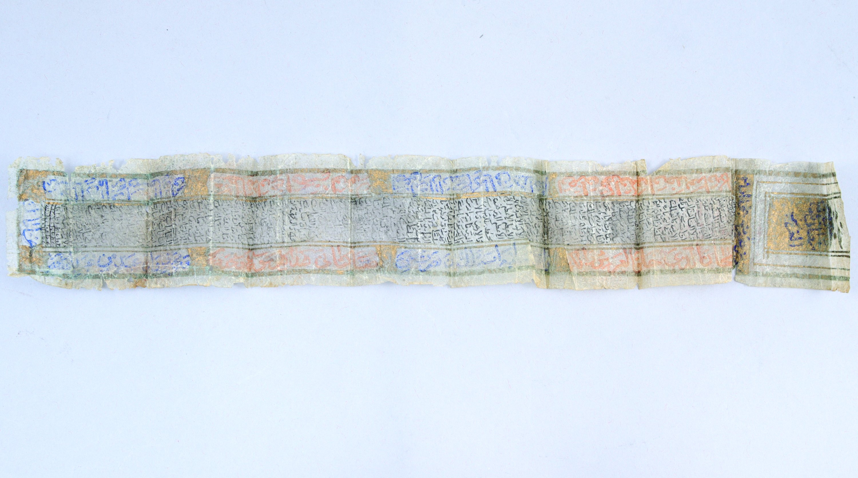 Rouleau sur peau de bovidé, écrit à lencre rouge, noire et bleue dinscriptions Coraniques.
