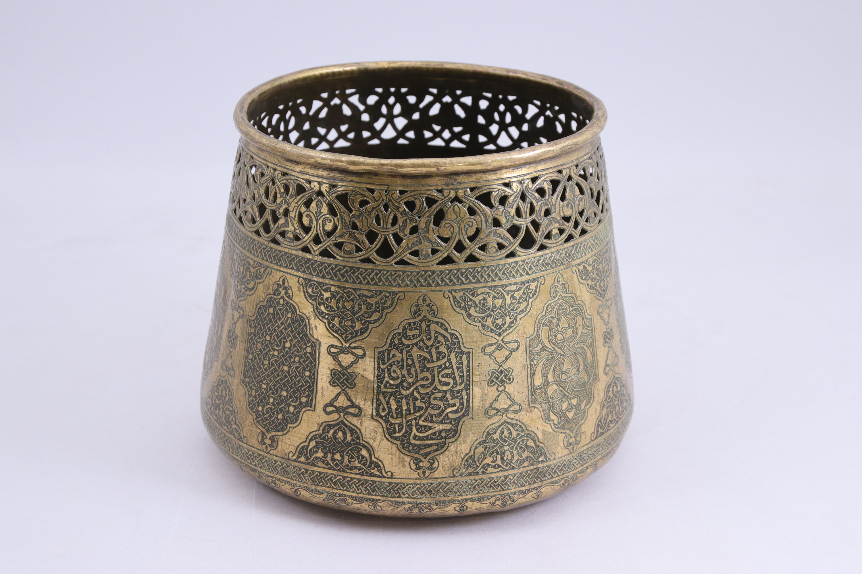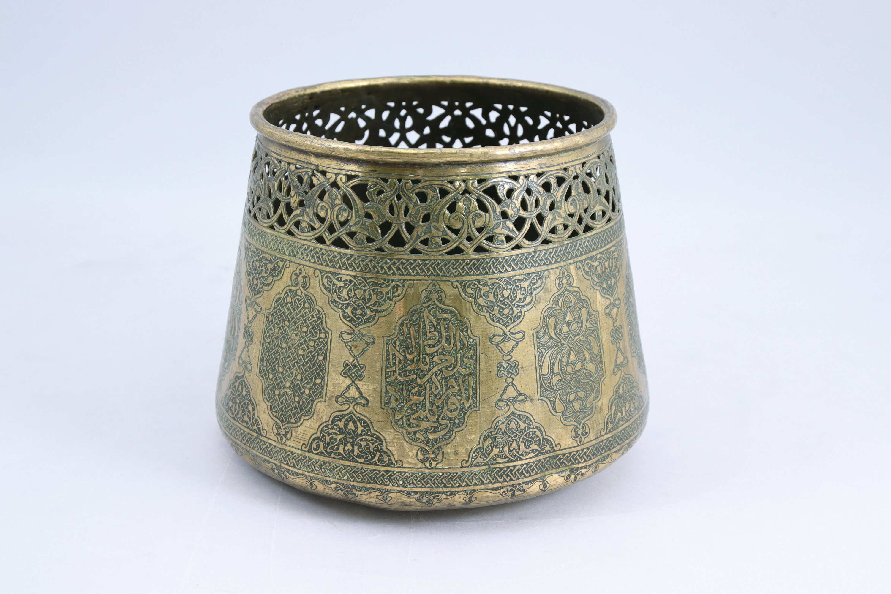 finement ciselé et ajouré au sommet. Riche décor de calligraphies arabe et d'entrelacs arabisants.