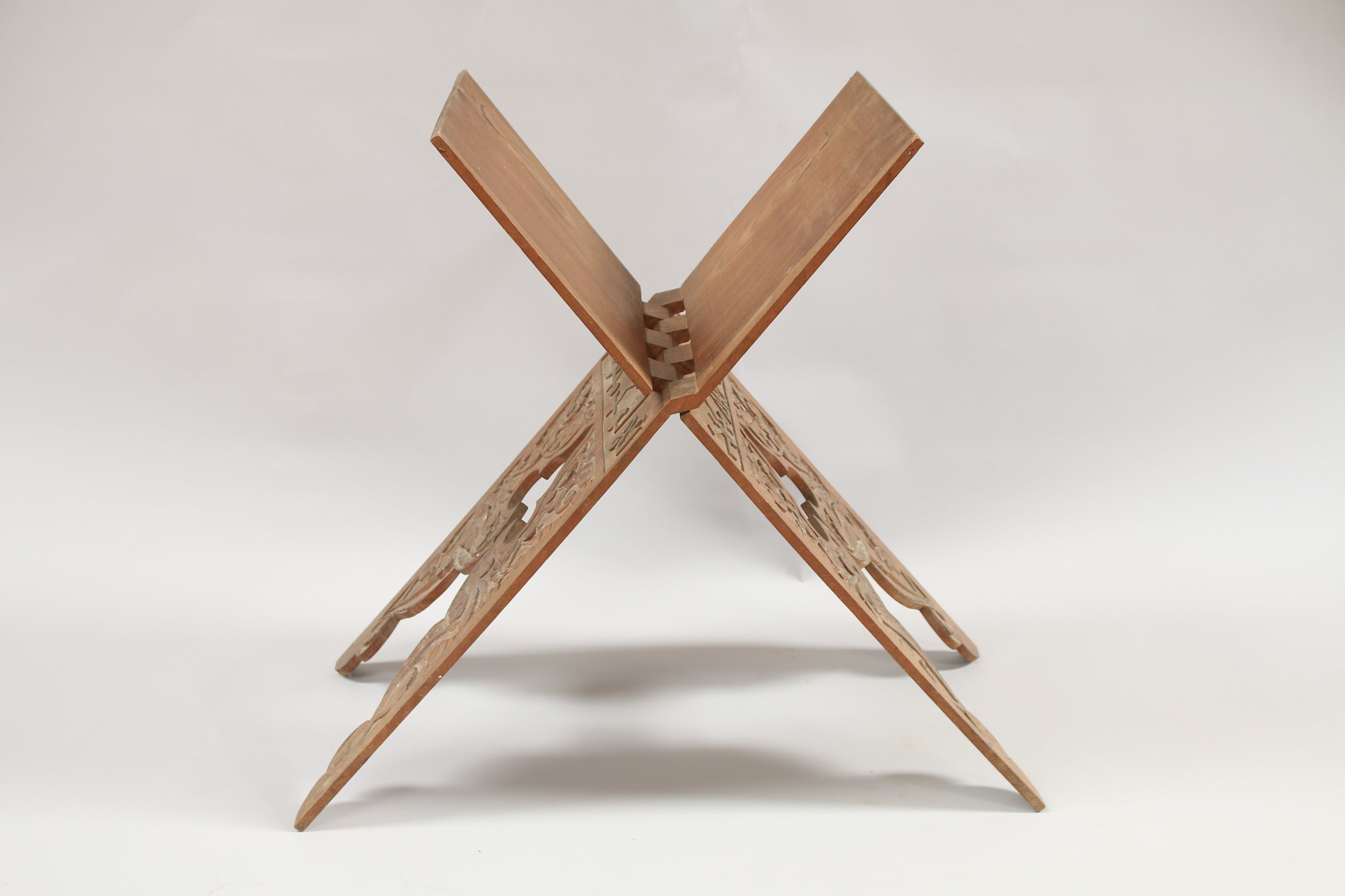 Porte-Coran kursi à décor de palmettes et d’inscription en bois sculpté d’un décor de palmettes autour d’une arcature fleuronnée et surmonté d’une inscription en arabe coufique fleuri rehaussée de dorure.