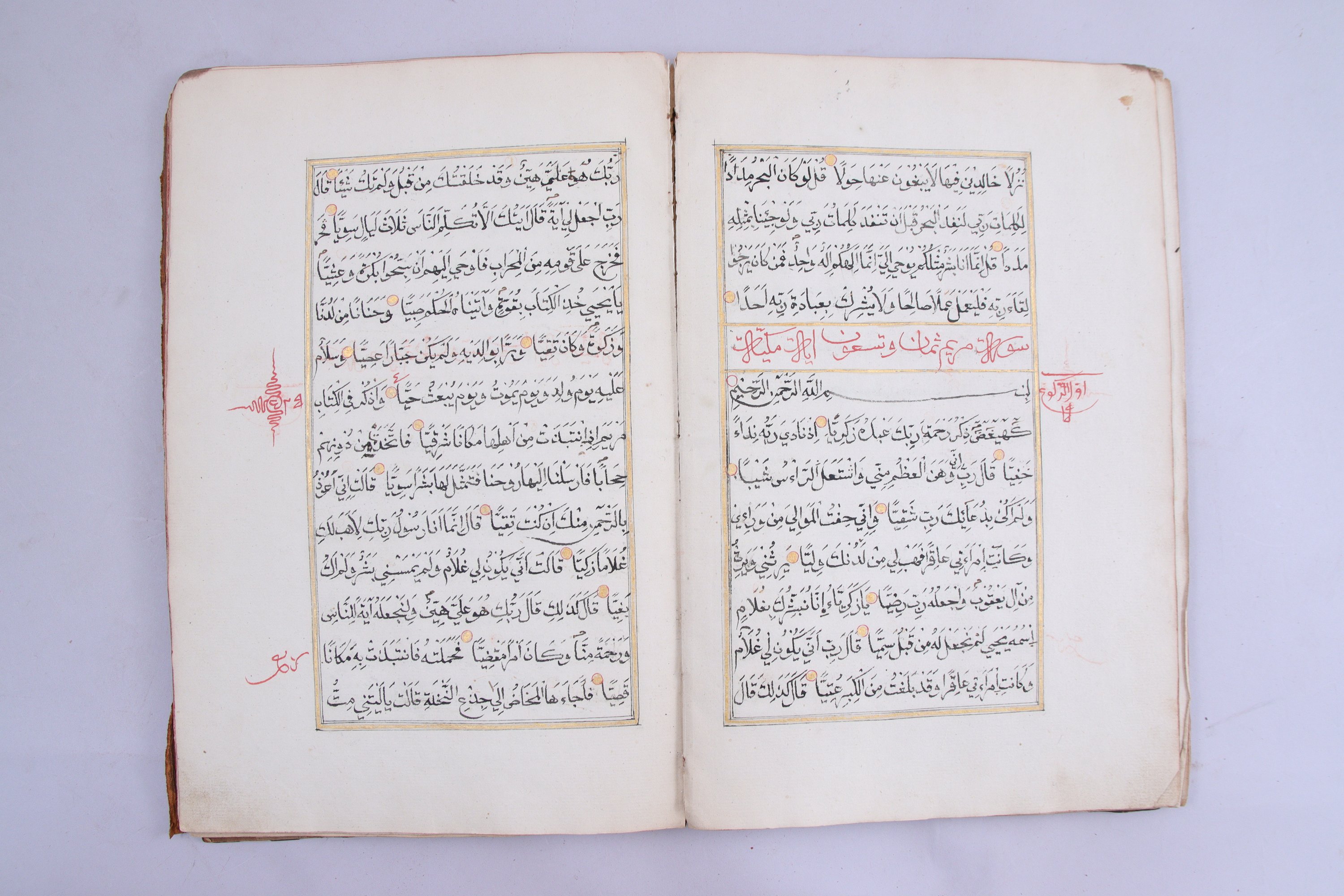 Manuscrit incomplet sur papier de 13 lignes par page en arabe, en écriture cursive, à lencre noire, titres de sourates et inscriptions marginales à lencre rouge. Quelques enluminures à lor telles que le cadre doré autour du texte ou les points de séparation de versets. Egalement un demi-médaillon marginal à décor de branchages peints à la gouache et cerclé dor. Le texte sétend de la Sourate XVII, verset 13 à la Sourate XX, verset 95. Reliure à rabat en maroquin brun à décor estampé dun médaillon et de quatre écoinçons à décor de rinceaux floraux ; intérieur des plats en papier marbré.