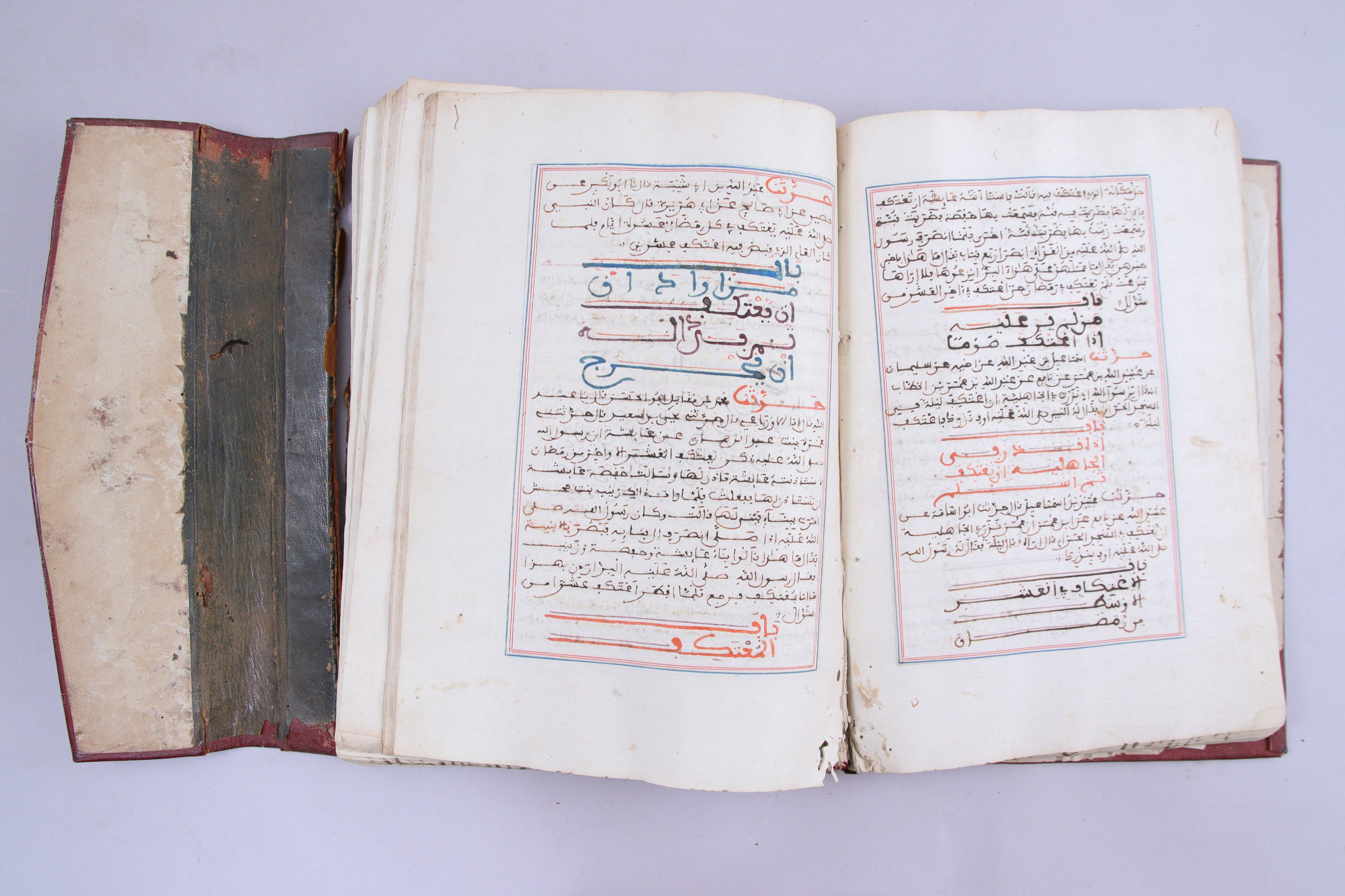 Manuscrit incomplet sur papier de 25 lignes par page en arabe, en écriture maghribi, à lencre brune, quelques termes aux encres rouge, bleue, mauve. Titre inscrit à lencre sur la tranche. Reliure à rabat en maroquin grenat à décor estampé puis rehaussé dor dun médaillon garni de rinceaux et de fleurons dans les écoinçons et sur le dos du rabat.