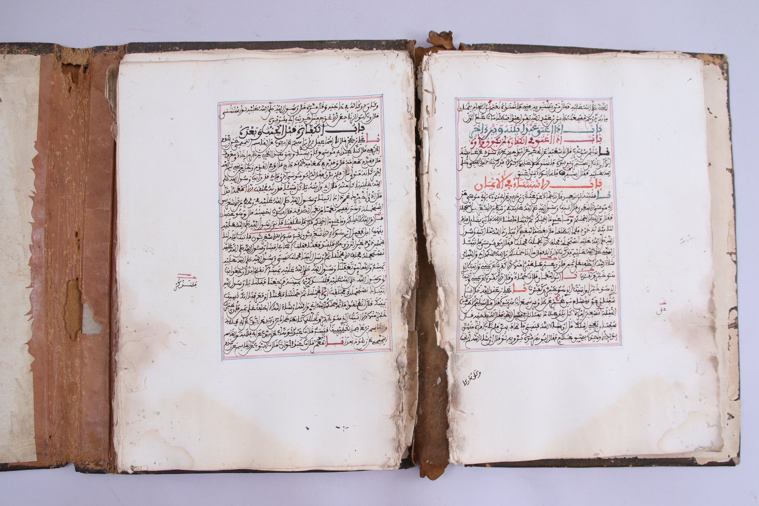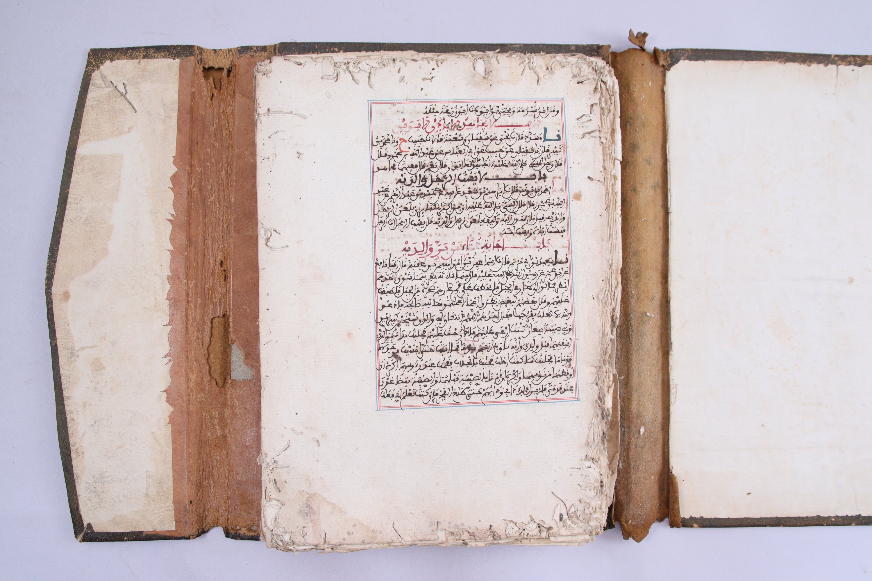 Manuscrit incomplet sur papier de 21 lignes par page en arabe, en écriture maghribi, à lencre noire, titres et quelques termes aux encres polychromes. Reliure à rabat en maroquin vert à décor estampé dun médaillon rehaussé de rouge et cerclé de lignes dorées.