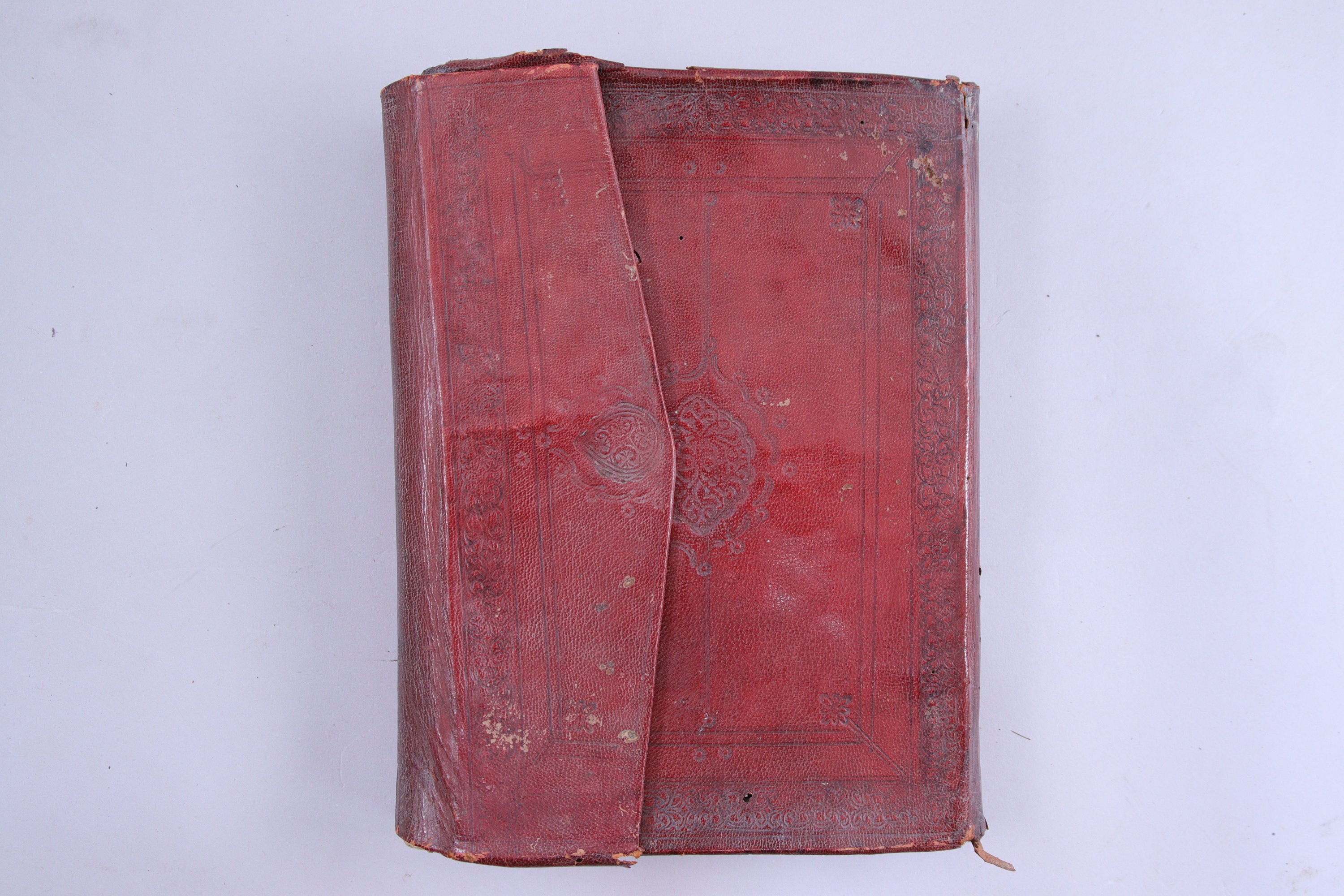 Manuscrit incomplet sur papier de 15 lignes par page en arabe, en écriture maghribi, à lencre noire, quelques termes aux encres polychromes. Nom du copiste donné dans le colophon final [?] ibn Ibrahim [?]. Reliure à rabat en maroquin rouge à décor estampé dun médaillon et de bordures de palmettes.