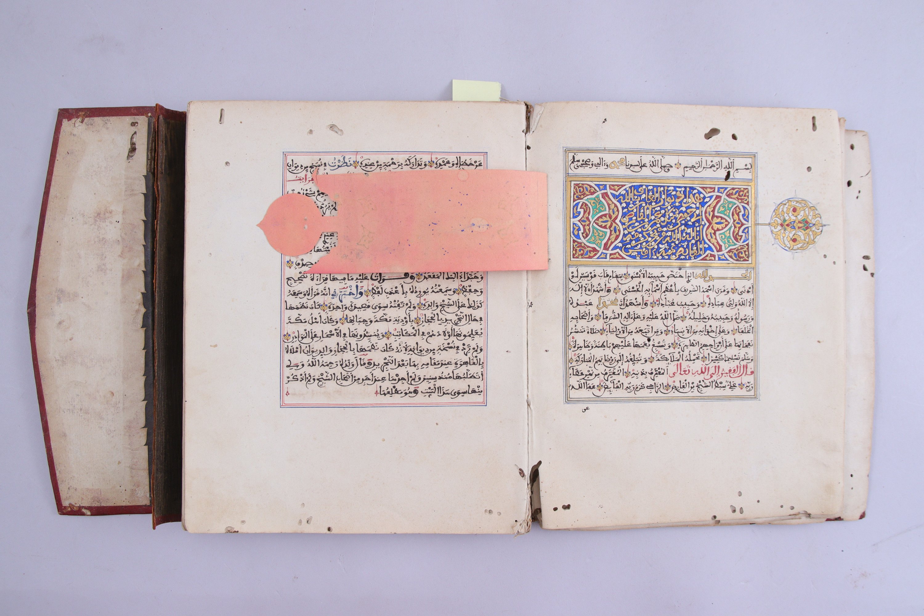 Manuscrits composites de plusieurs mains, sur papier denviron 15 lignes par page en arabe, en deux colonnes sur certaines sections, en écriture maghribi, à lencre noire, quelques termes aux encres polychromes. Quelques enluminures à lor et en polychromie. Le premier manuscrit est le Diwan al-Arif Billah au titre donné dans un cartouche à appendice marginal et enluminé dor et de polychromie ; le second au titre également enluminé à la gouache est un écrit du Shaykh Abd al-Rahman. Dans une même reliure à rabat en maroquin rouge à décor estampé dun médaillon rehaussé de vert et cerclé dor.