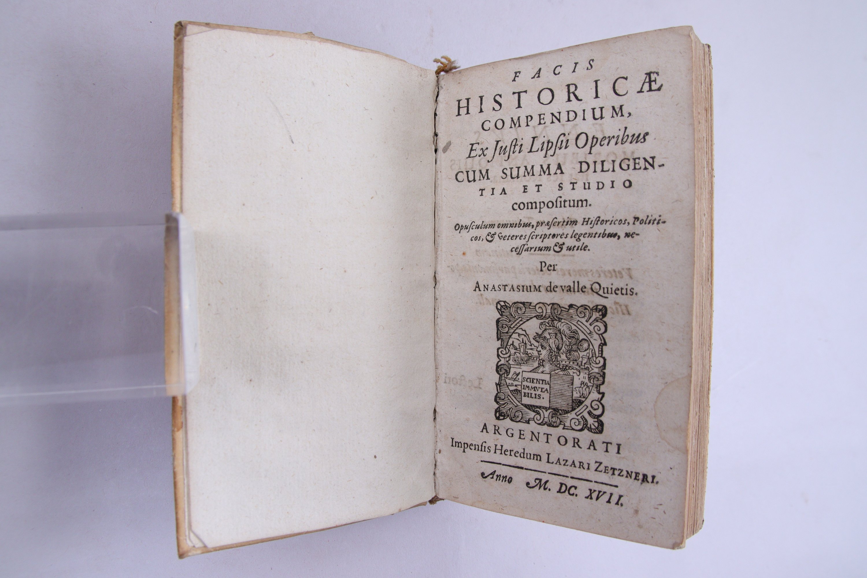 - Anastase de Valle, Focis historicae compendium ex Justi Lipsi compendium. Strasbourg, Lazare Zetener, 1617. In-16, vélin rigide.