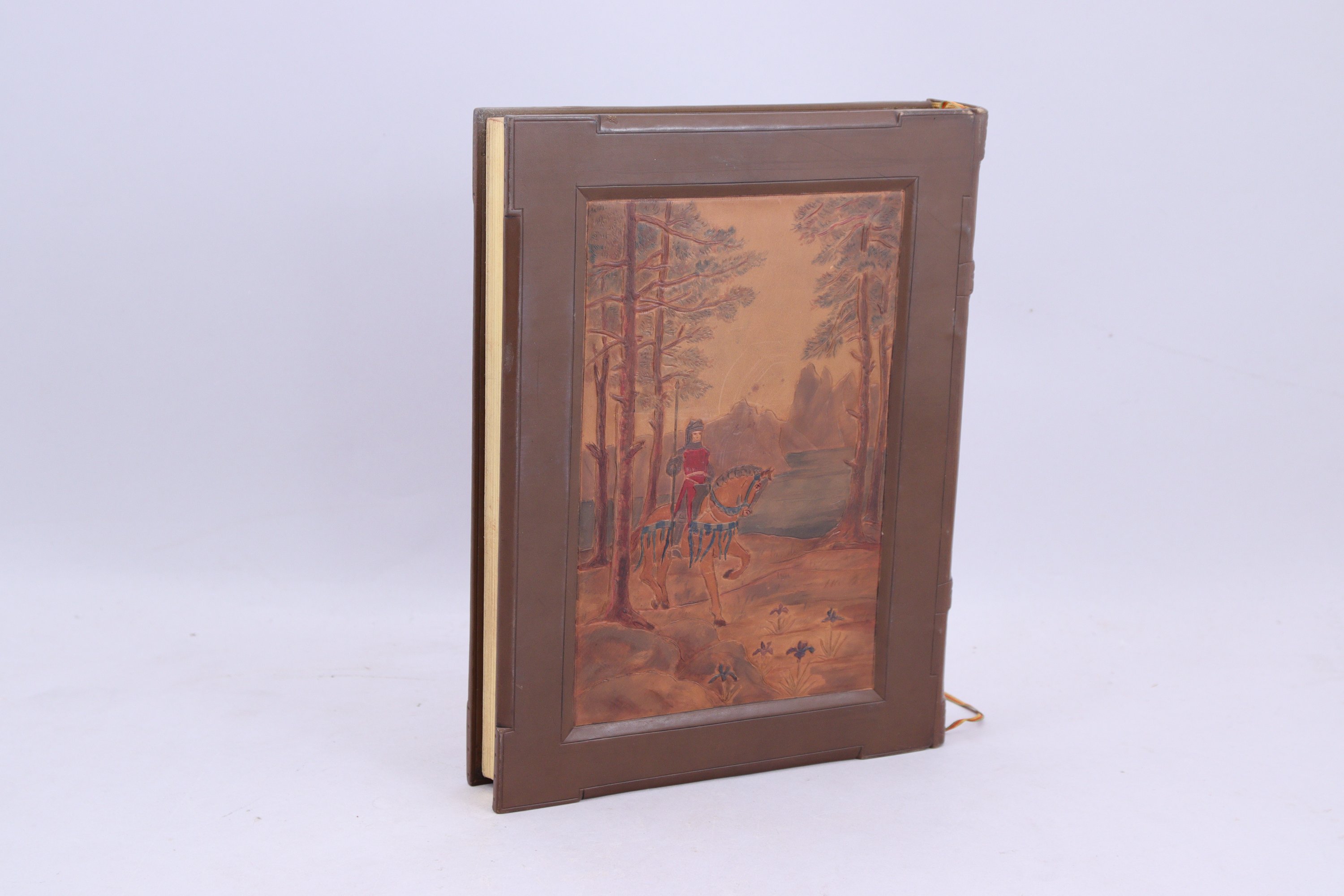 Petit in-4°, plein veau avec décor embouti en couleurs imitant une page enluminée, avec un dragon dans l'encadrement, un roi et une princesse au centre des plats. Curieuse reliure du temps, non signée.