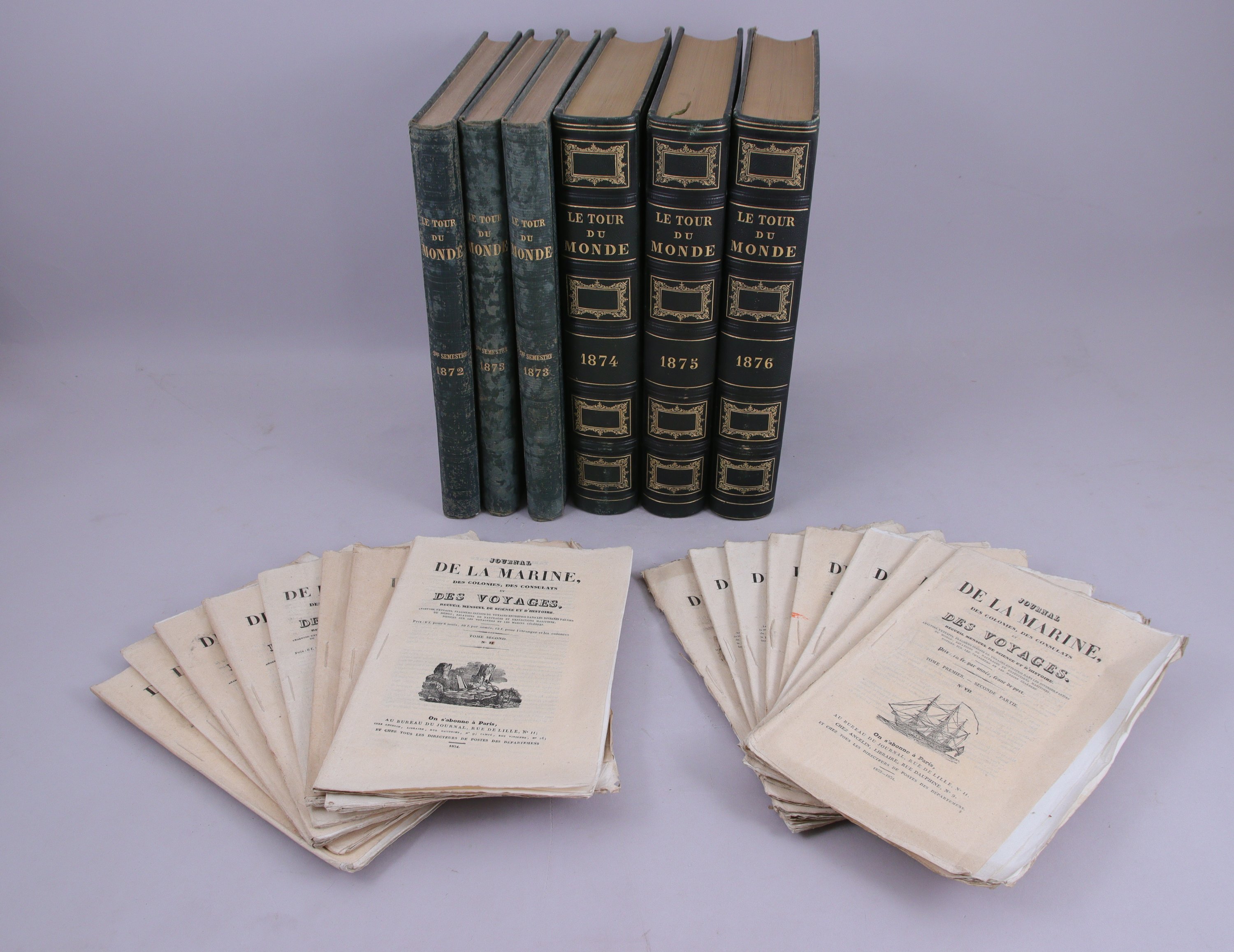 Lot regroupant 16 livraisons in-8, brochées, du Journal de la Marine, des Colonies, des Consulats et des Voyages (Années 1833-1834) ; et 6 volumes in-4°, en 1/2 chagrin ou toile éditeur de la revue Le Tour du Monde, Nouveau Journal des Voyages. (1872 à 1876).