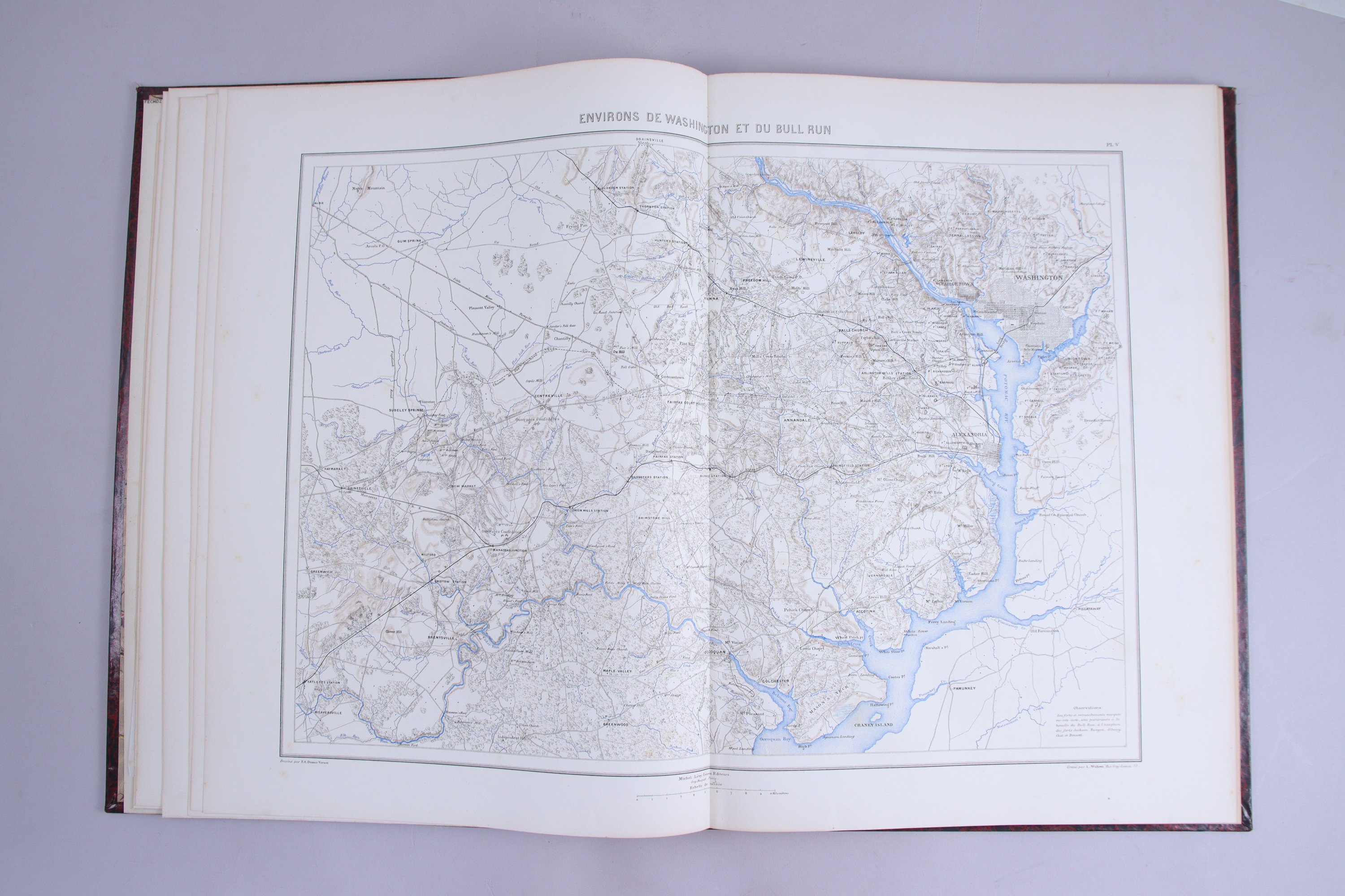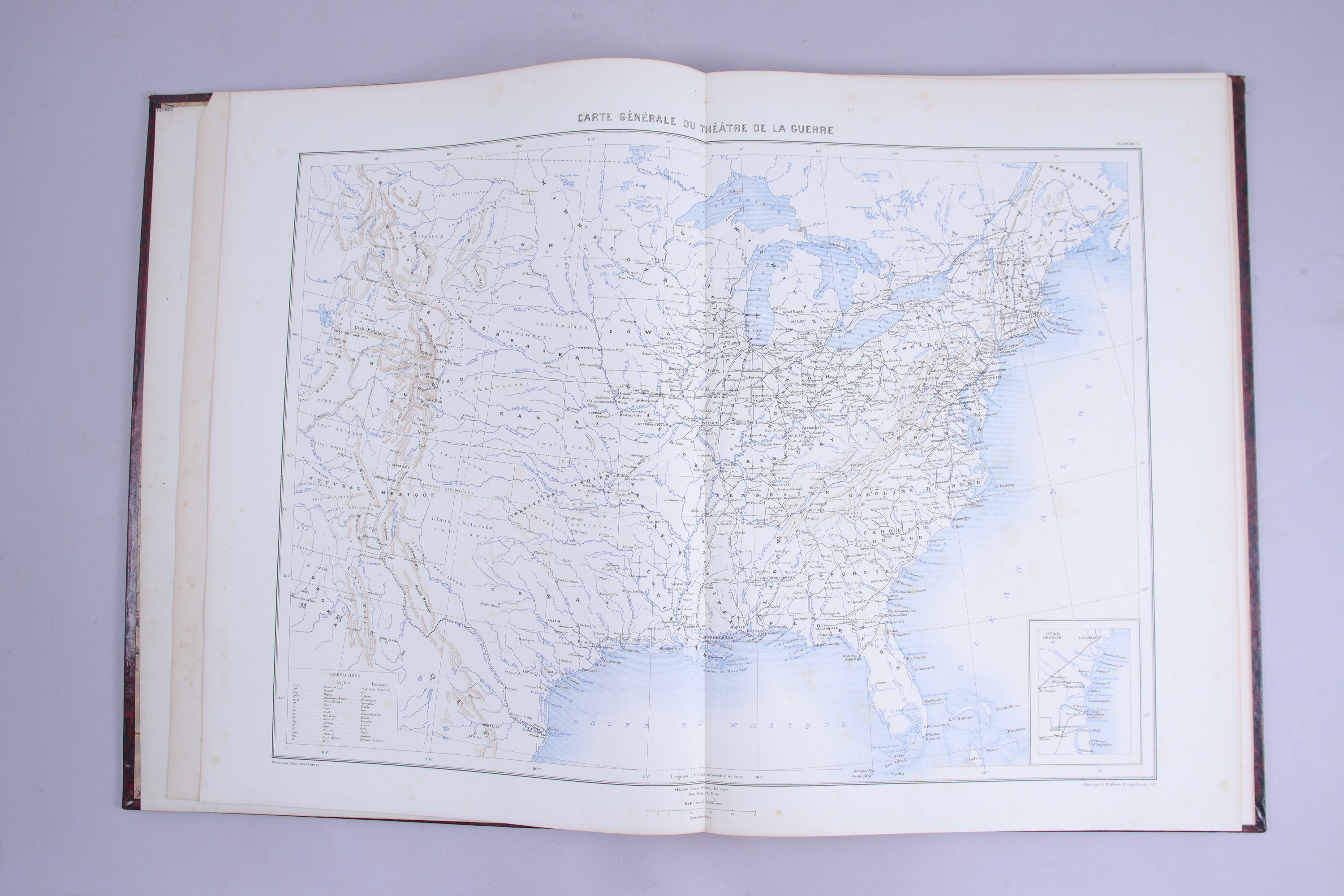 30 planches: Carte générale du théâtre de la Guerre (pl.1), Virginie et Maryland (pl.2), Kentucky et Tennessee (pl.3), Missouri et Arkansas (pl.4), Environs de Washington et du Bull Run (pl.5), Pamlico Sound (pl.6), Sea Island (pl.7), Belmont Pea Ridge Hampton Roads Ile n°10 (pl.8), Fort Henry Fort Donelson Shiloh (pl. 9), Yorktown et Williamsburg (pl. 10), Mississipi et Nouvelle Orléans (pl. 11), Environ de Richmond (pl. 12), Environs de Corinth Winchester Suffolk (pl.13), Charleston (pl.14), Environs de Warrenton (pl.15), Cedar Mountain Harpers Ferry - South Mountain - Antietam (pl.16), Iuka - Murfresborough - Chickasaw (pl.17), Brashear city - Nashville et Galveston (pl.18), Les champs de bataille du Rappahanock (pl.19), Cours du Mississipi (pl.20), Environs de Vicksburg (pl.21), Champion Hill - Port Hudson - Big Black River (pl.22), Vicksburg (pl.23), Vallée de Monacacy (pl.24), Gettyburg (pl.25), Vallée du Shenandoah (pl.26), Bristow Station - Brandy Station (pl.27) Carnifex Ferry - Mill Spring - Logan Cross Roads - Pea Ridge (pl. 28), Perryville - Iuka (pl.29), Cours inférieure du Mississipi (pl.30).