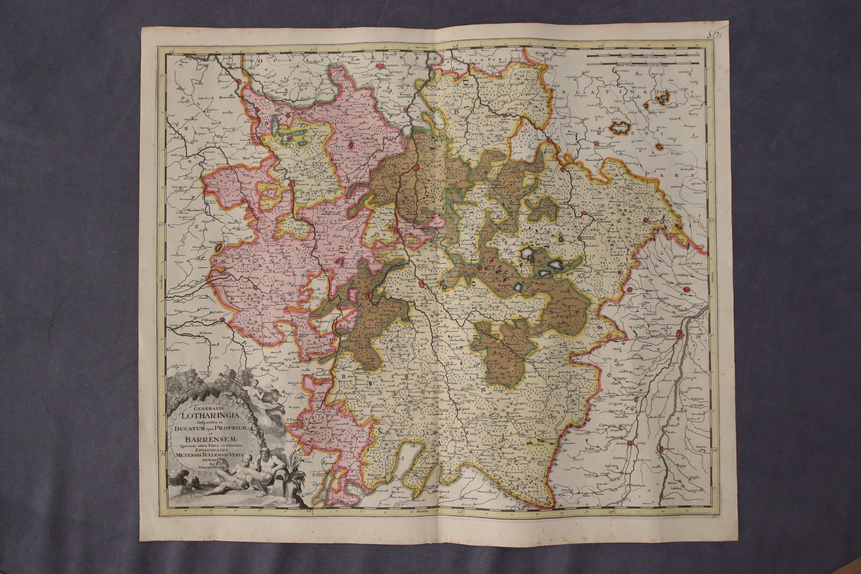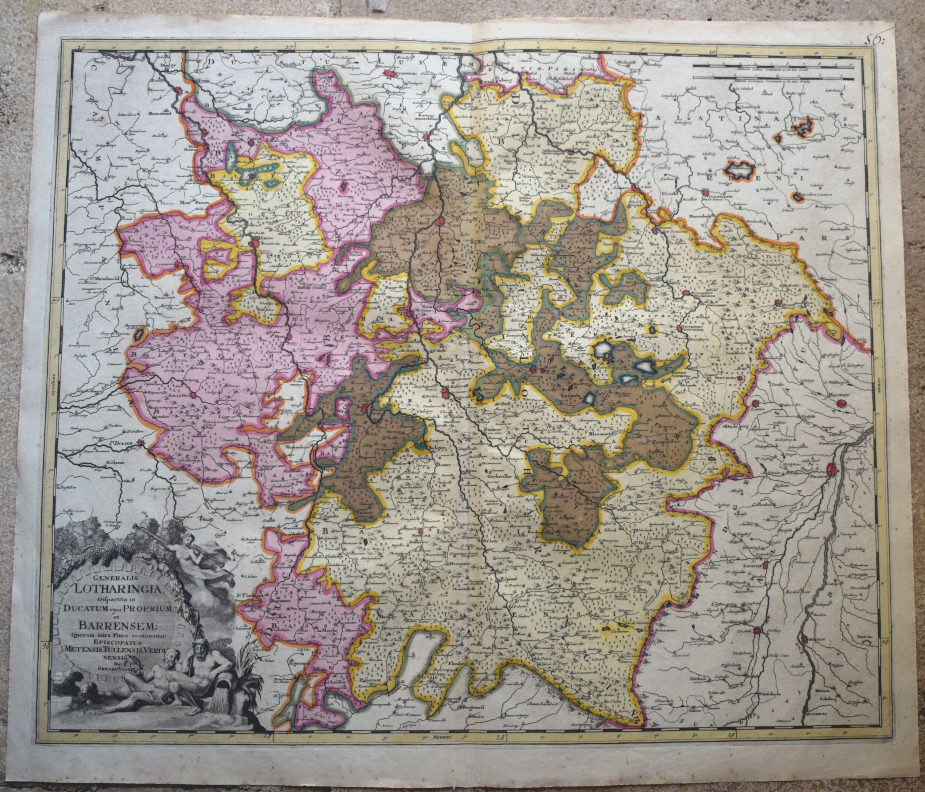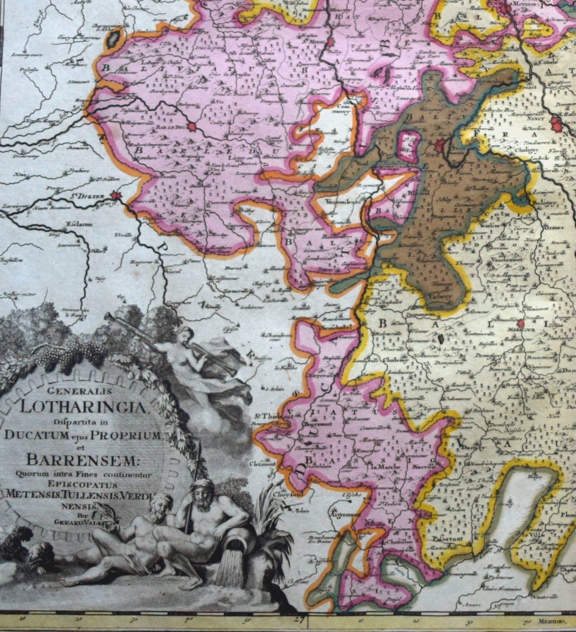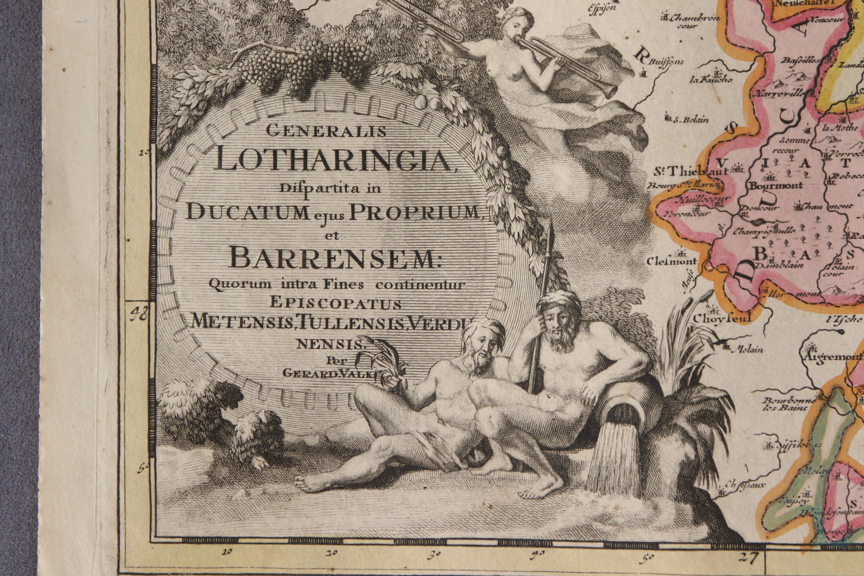 Carte géographique des duchés de Lorraine et de Bar, et des évêchés de Metz, Toul et Verdun, publiée par Gerard Valk vers 1710, en coloris du temps.