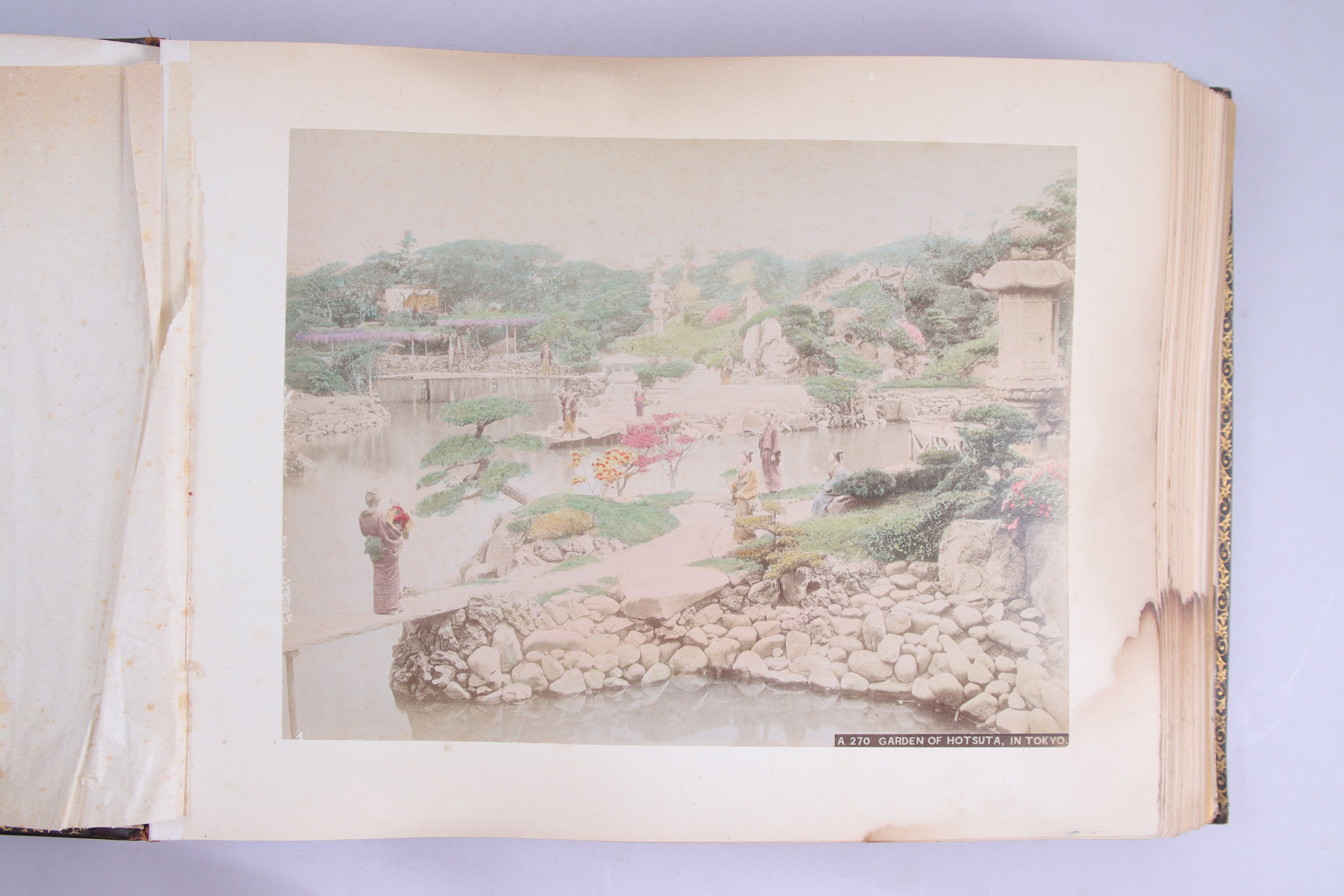 50 photographies la plupart colorisées, situées ou titrées: Jardin d'Hotsuta à Tokyo, Grand hôtel Hokohama, Cascade près du Mont Fuji, Temple à Nagasaki, Combats, Danse, Jardins Okano, Femmes japonaises, Femmes chantant, Le bain, Maison de thé, Fabricants d'ombrelles, Médecin, Marchand de légumes, deux vues doffrandes aux vautours, Paysages, scènes de rue, palais, vie quotidienne, village flottant, fumerie d'opium.