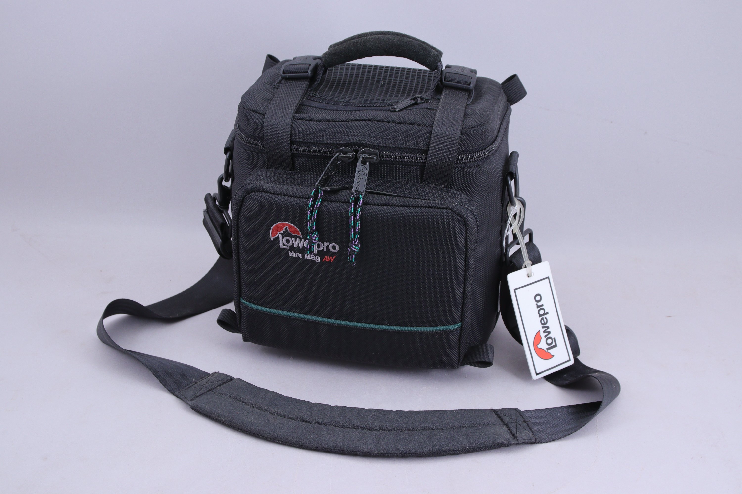 Lensemble dans une sacoche de la marque Lowepro, modèle Mini Mag AW.