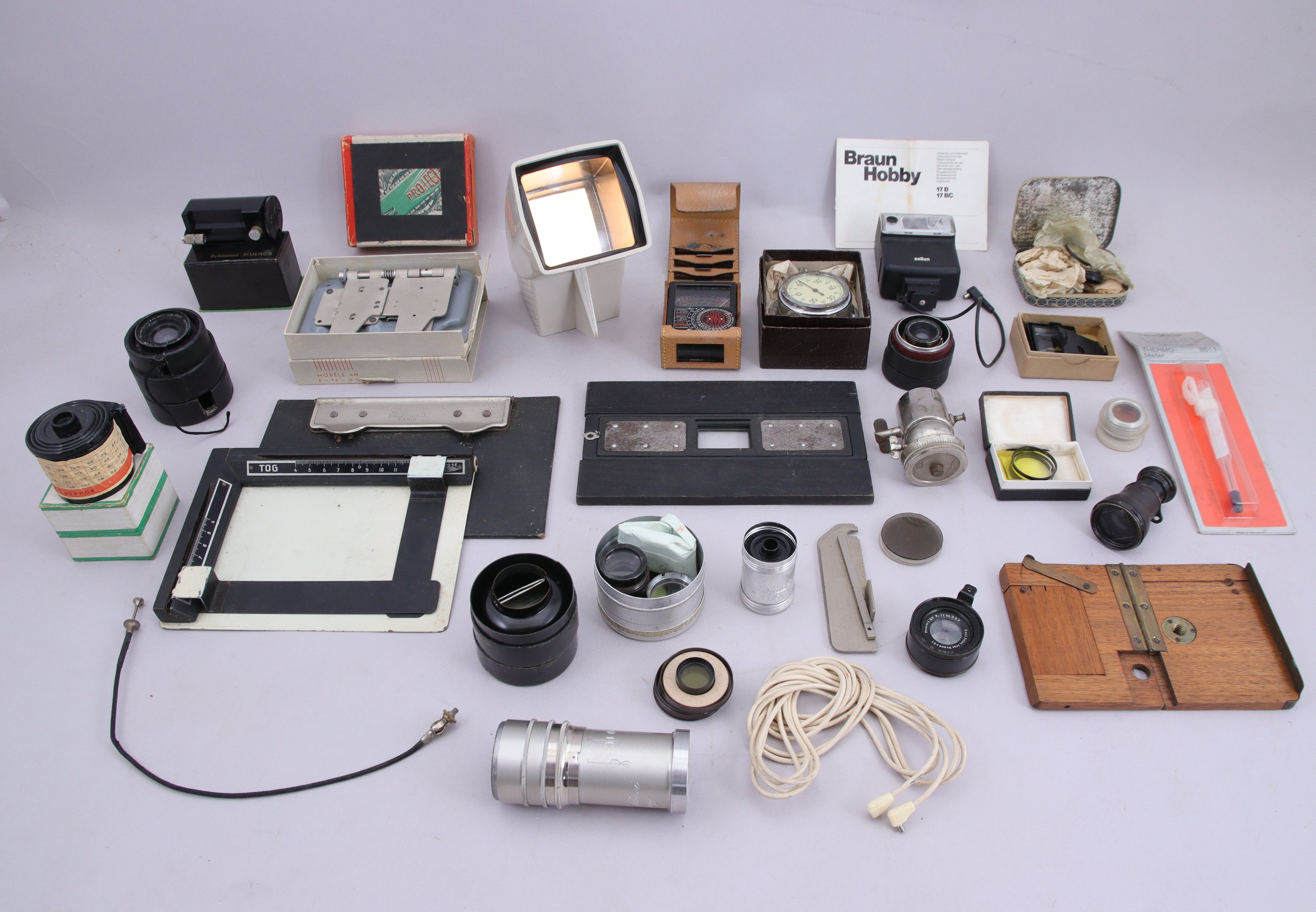 Visionneuse Panavue I, flash Braun, Bobineuse Sommor, colleuse Marguet Tri-film semi-automatique, Posemètre Réalt. photo avec système poirette breveté, thermomètre Hama photoservice.