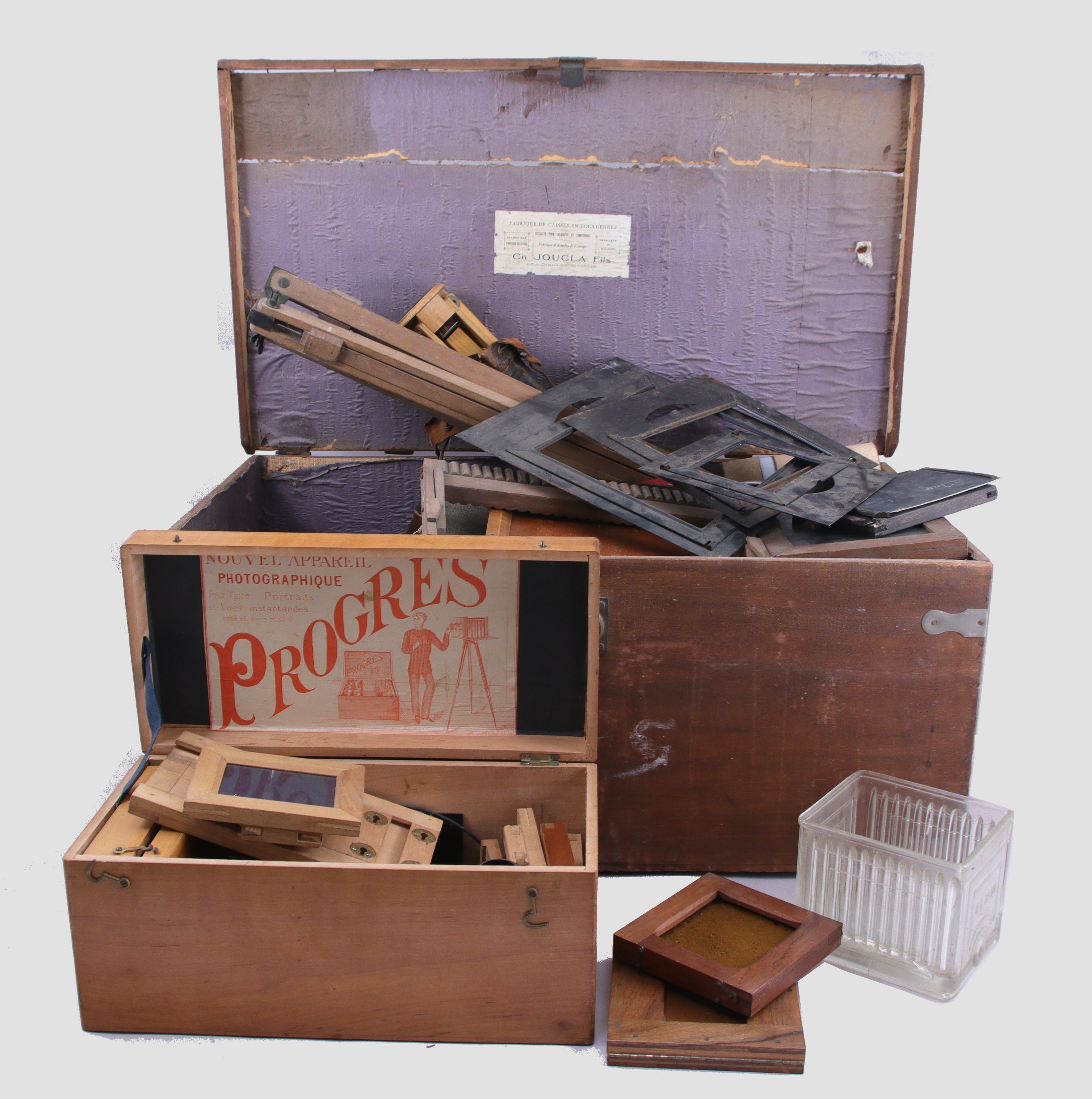 "Nouvel appareil photographique Le Progrès" avec son trépied, un trépied, diverses ampoules de couleurs, bac de développement en céramique, massicot Kodak.