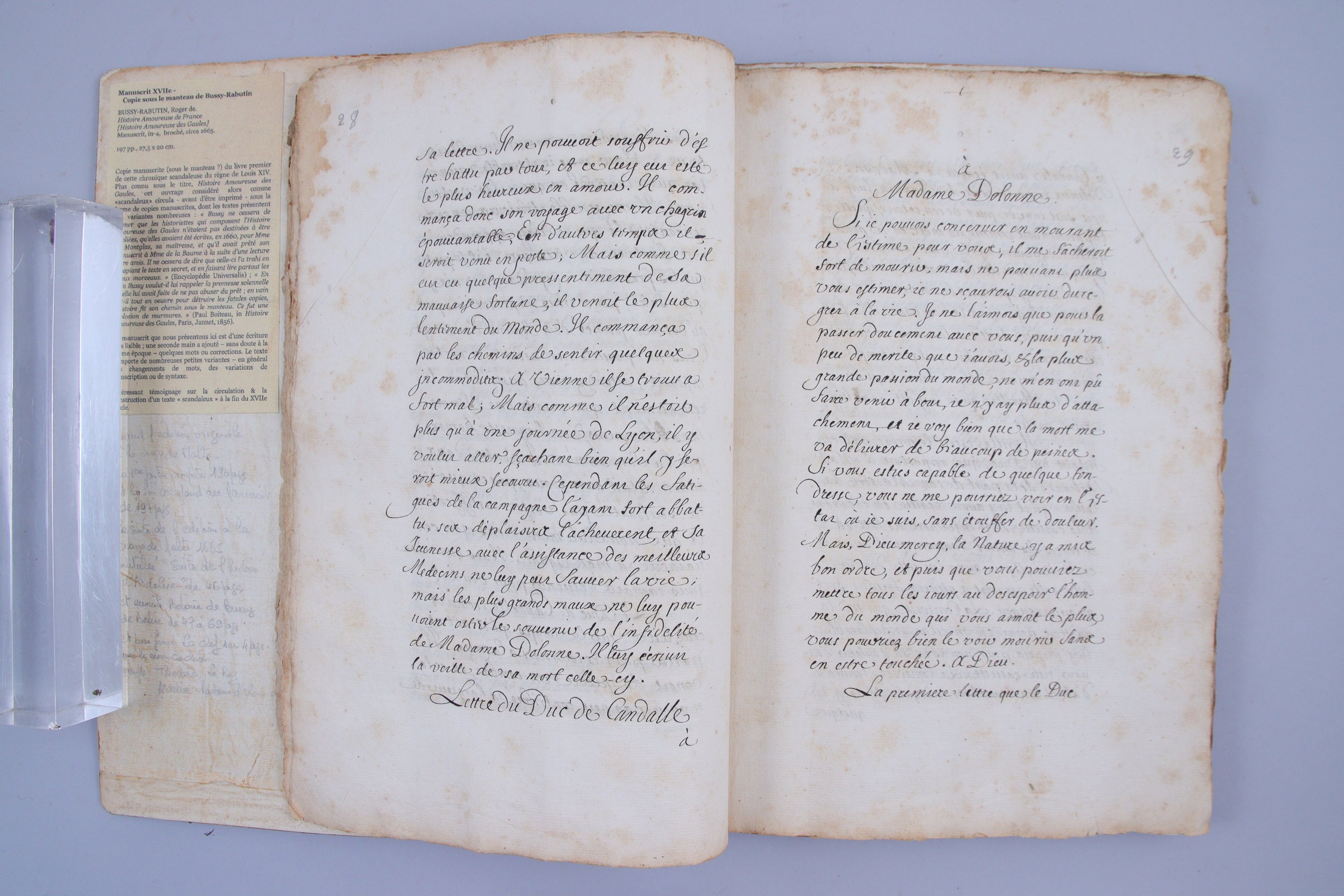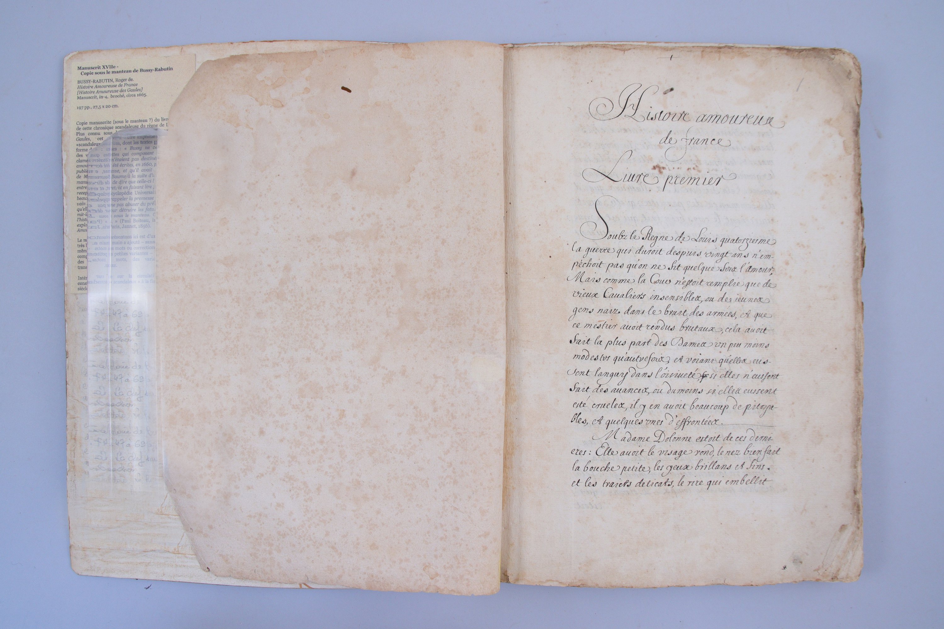 Copie manuscrite du temps, très lisible, de l'Histoire Amoureuse de Bussy-Rabutin, sans la Suite de l'Histoire d'Ardélise, qui constitue le dernier quart de l'ouvrage.