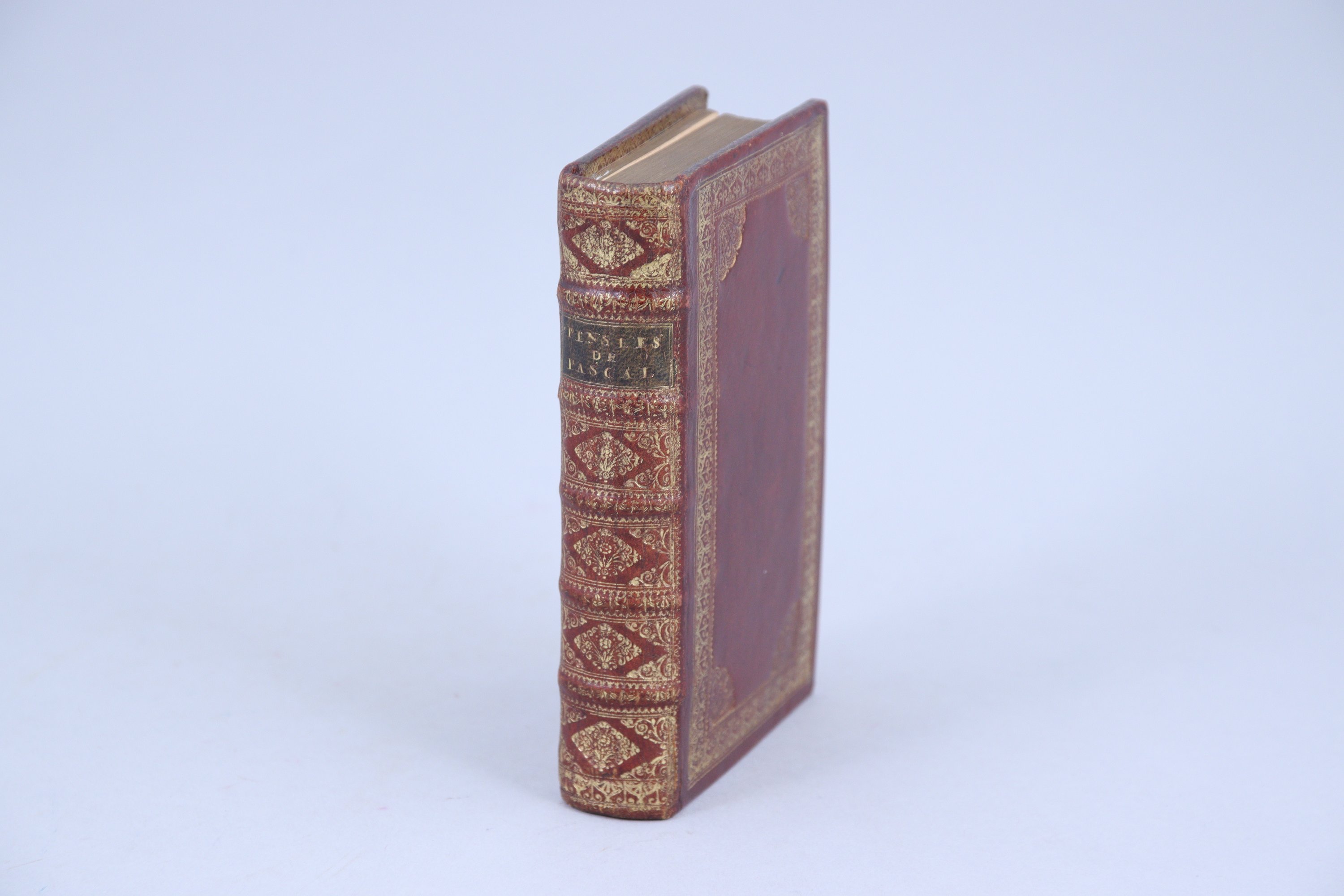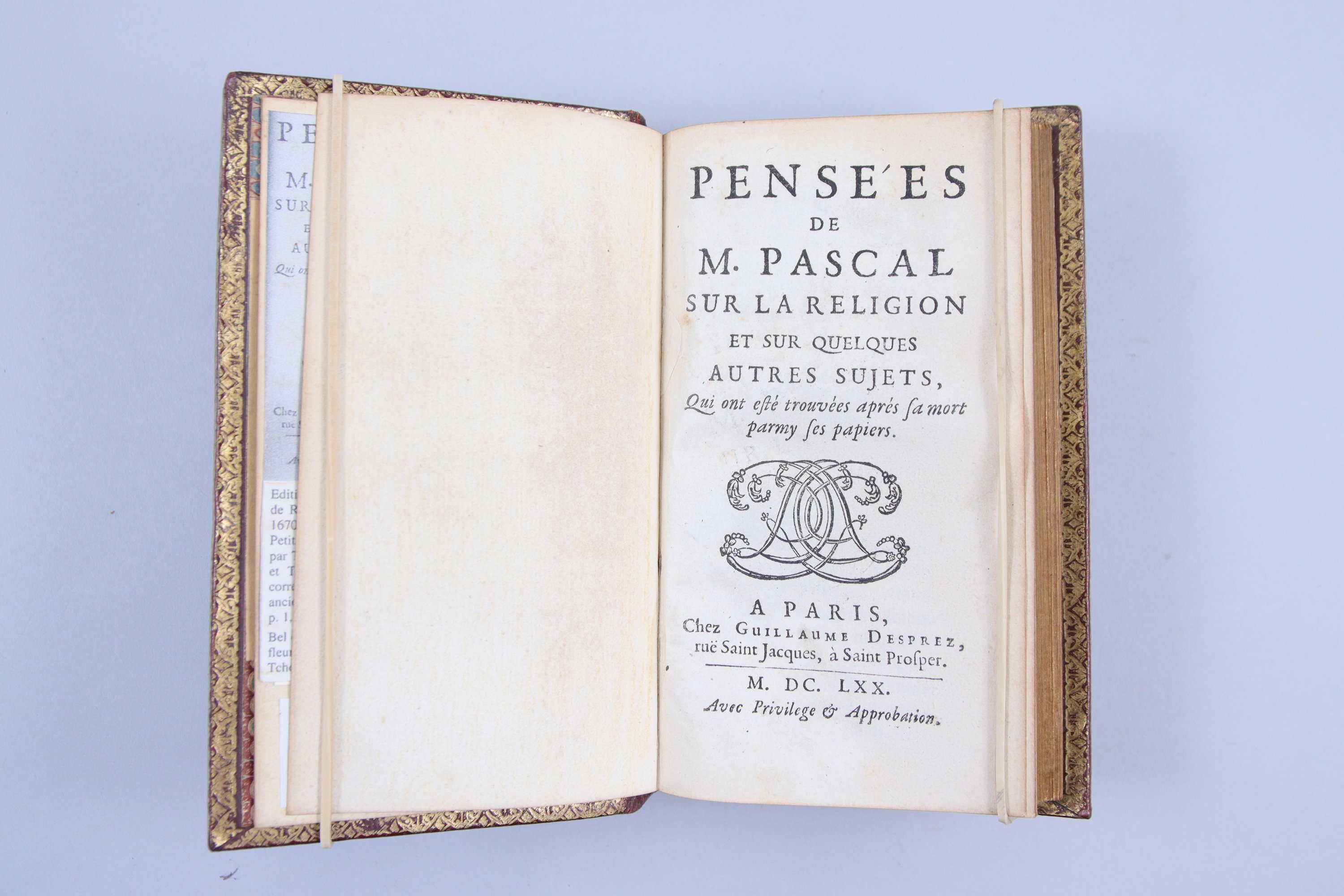 "Véritable seconde édition des Pensées, avec les fautes corrigées" (Tchemerzine). Le bandeau de la page 1 représente le Collège Parisien des Quatre Nations, avec la devise "Pendent opera interrupta" tirée de l'Eneide. Le Privilège est daté du 27 décembre 1666, et l'Achevé d'imprimer du 2 janvier 1670.