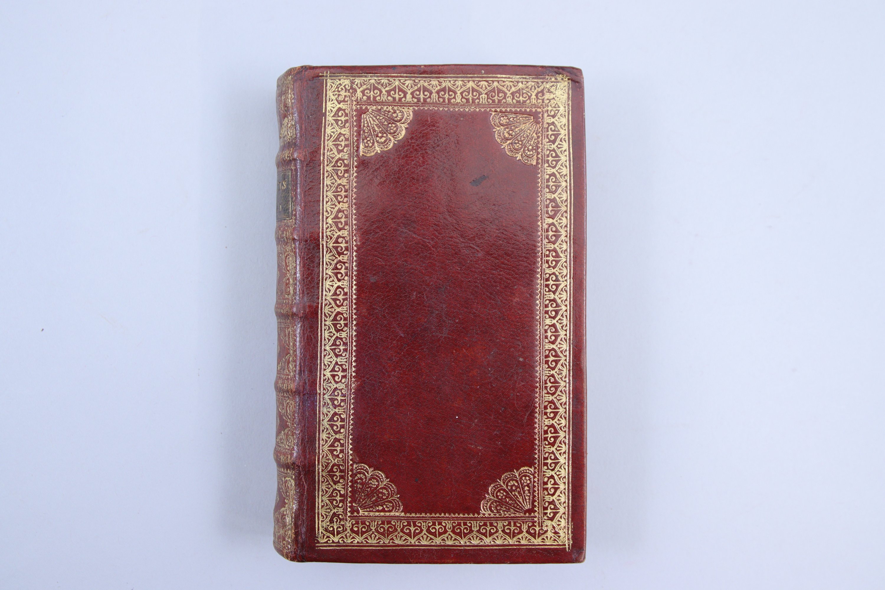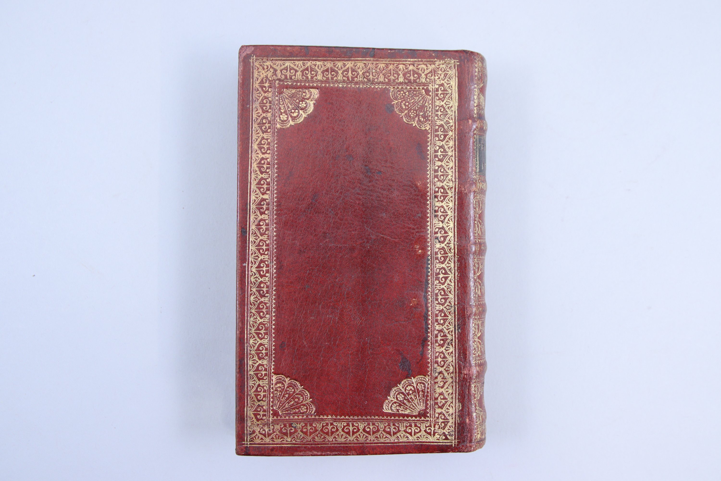 In-12 . Dimensions intérieures 147 X 85 mm. (40 ff), 358 pages chiffrées 334, et (10 ff). Exemplaire placé dans un plein maroquin rouge de la fin XVIIème, large roulette d'encadrement, petits fers à l'éventail dans les angles, dos très orné. Toutes tranches dorées. (Le titre est monté sur onglet. Nombreuses coupures de catalogues de ventes publiques ou de libraires collées sur les gardes blanches)