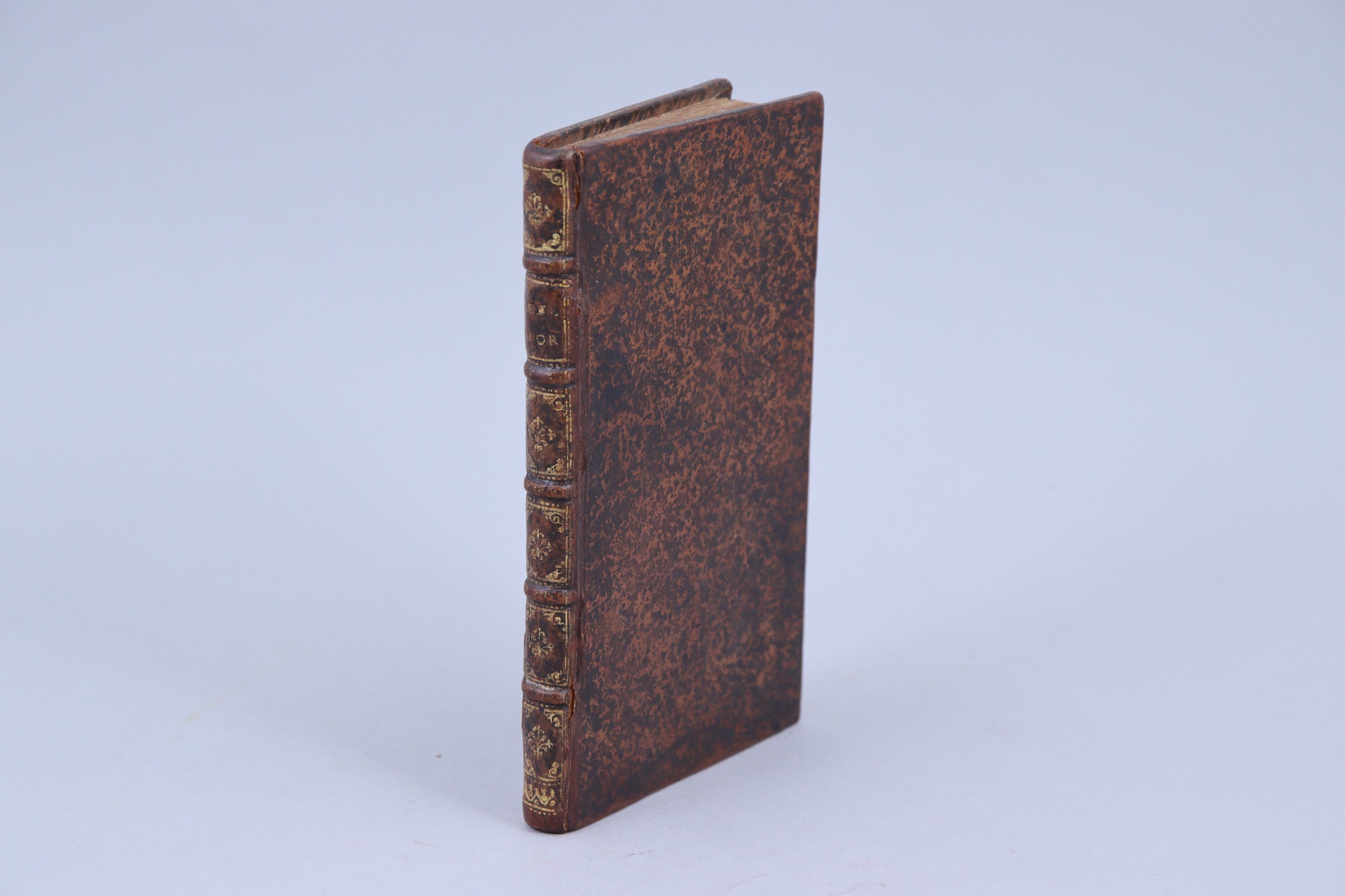 In-12, (4 ff), 76 pages, (6 ff), le dernier blanc. Veau granité. Reliure du temps.