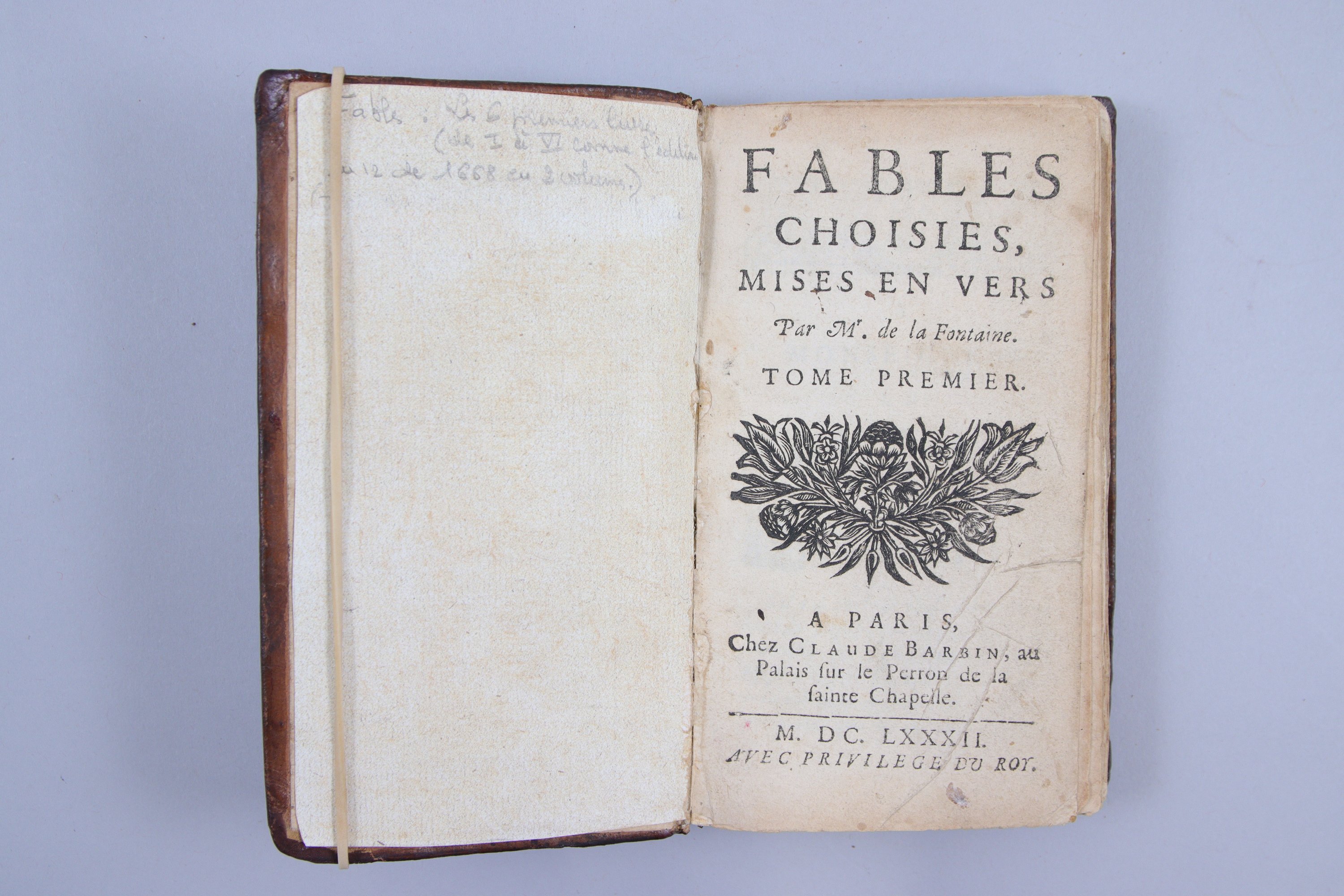 Nous joignons, dans une reliure différente et émoussée du temps, les "Fables choisies mises en vers par Mr de La Fontaine, tome premier", Claude Barbin, 1682, avec la même collation que le volume de 1679. La coquille du titre courant de l'Epistre est corrigée, et le titre porte "tome premier". La "Table des Fables " est devenue "Table des Fables contenues en cette Première partie". Le bois "au panier fleuri" qui figure sur le titre en 1679, est remplacé sur le titre daté 1682 par un bouquet de tulipes et d'artichauts ; le bois "au panier fleuri" est placé à la fin de La Vie d'Esope.