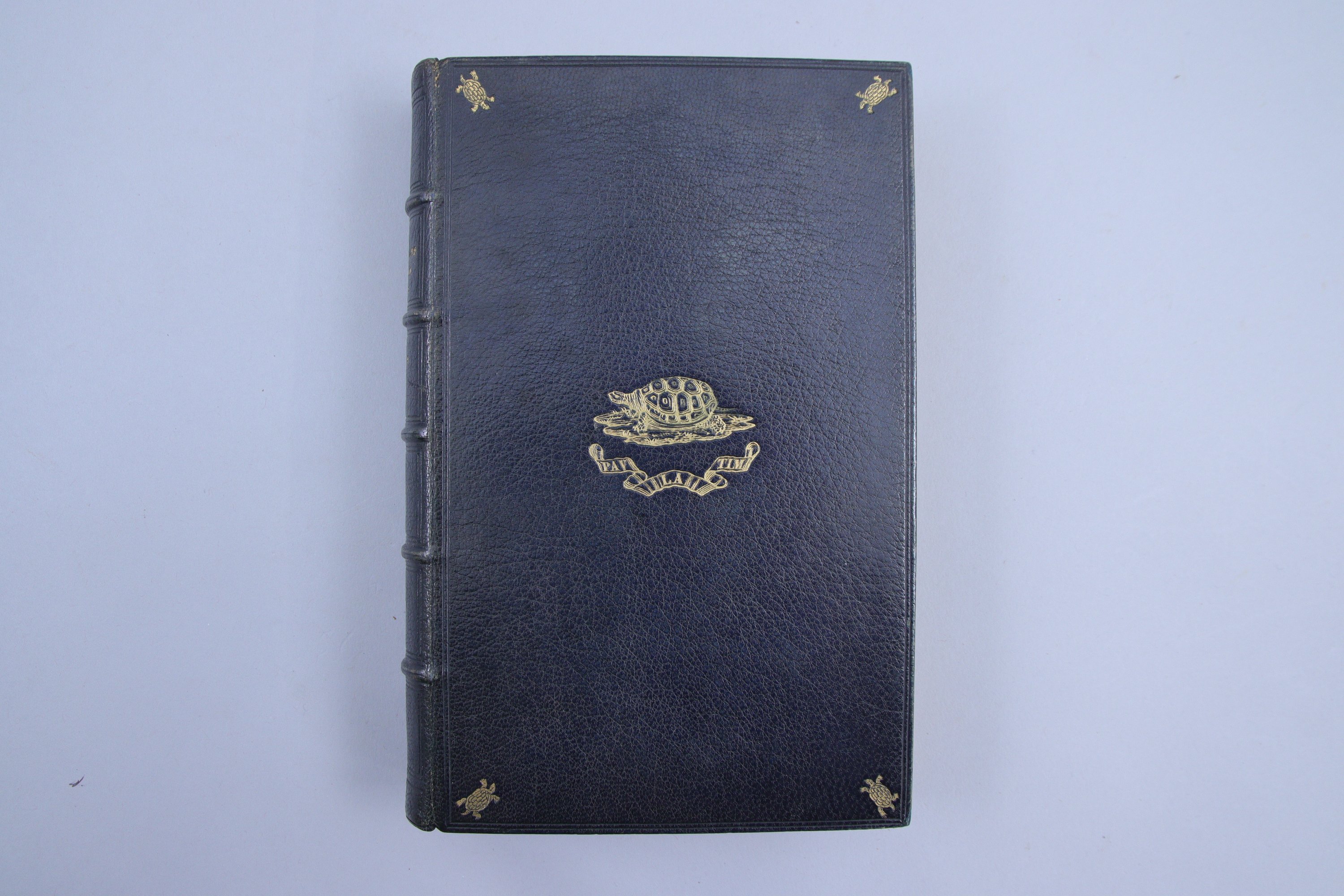 In-8, (20 ff), 613 pages. Plein maroquin bleu nuit, fers "à la tortue" dans les angles, grand fer "à la tortue" au centre des plats, avec la devise de Victor Luzarche "Paulatim". Dos à 5 nerfs. Deux filets sur les coupes. Roulette et filets intérieurs. Toutes tranches dorées. Reliure du milieu du XIXème, signée H. Duru.