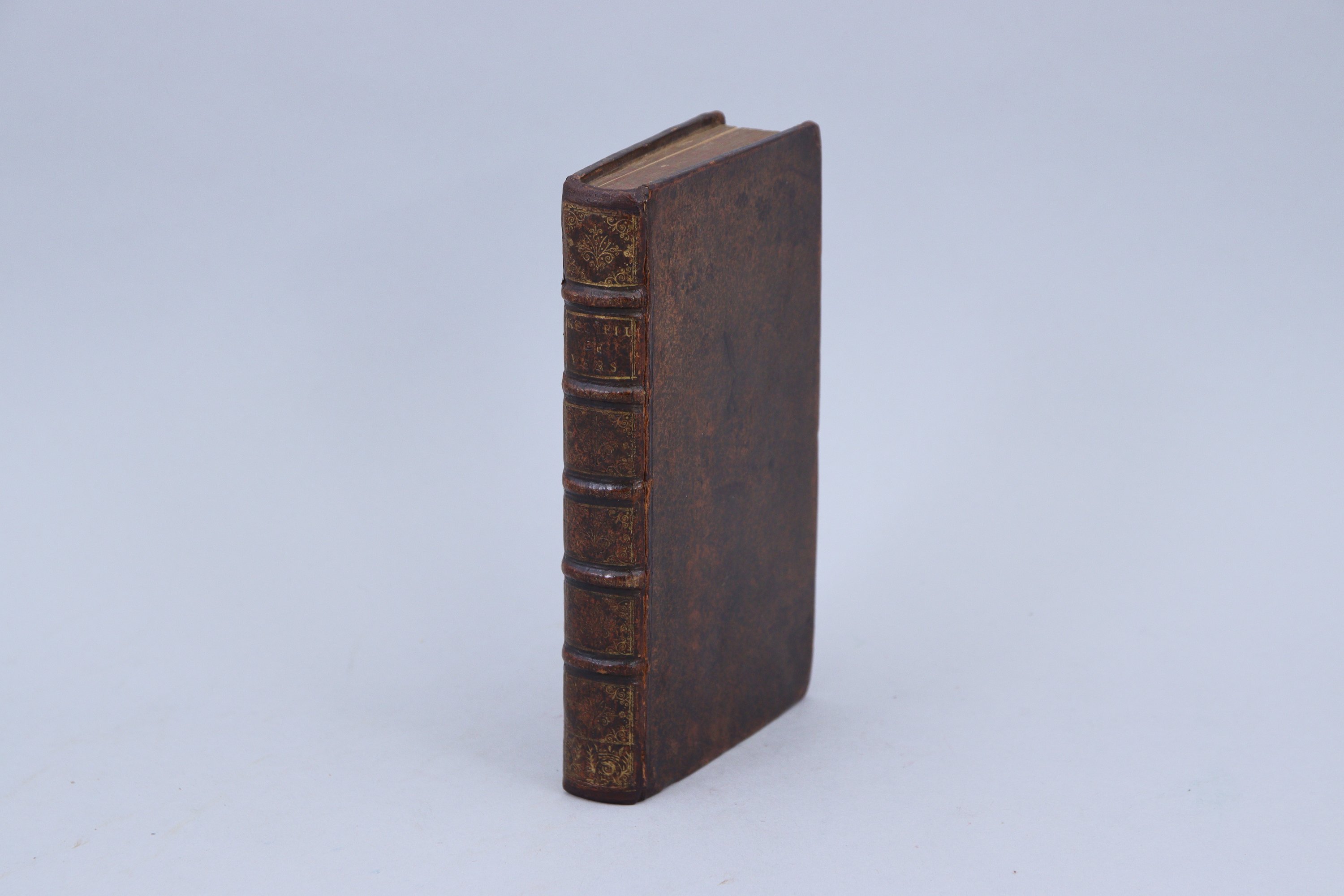 In-12, (3 ff), 330 pp, (7 ff). Plein veau du temps.