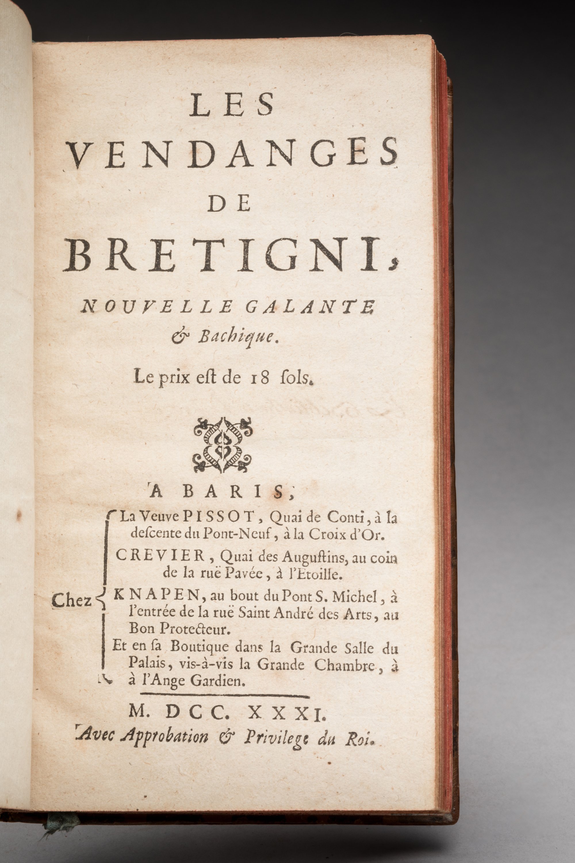 Seule et très rare édition de ce récit de vendanges festives à Brétigny sur Orge, dont le vignoble était réputé. L'ouvrage est entrecoupé de chansons bachiques, entonnées par les vendangeuses (charmantes) et les vendangeurs (grivois).