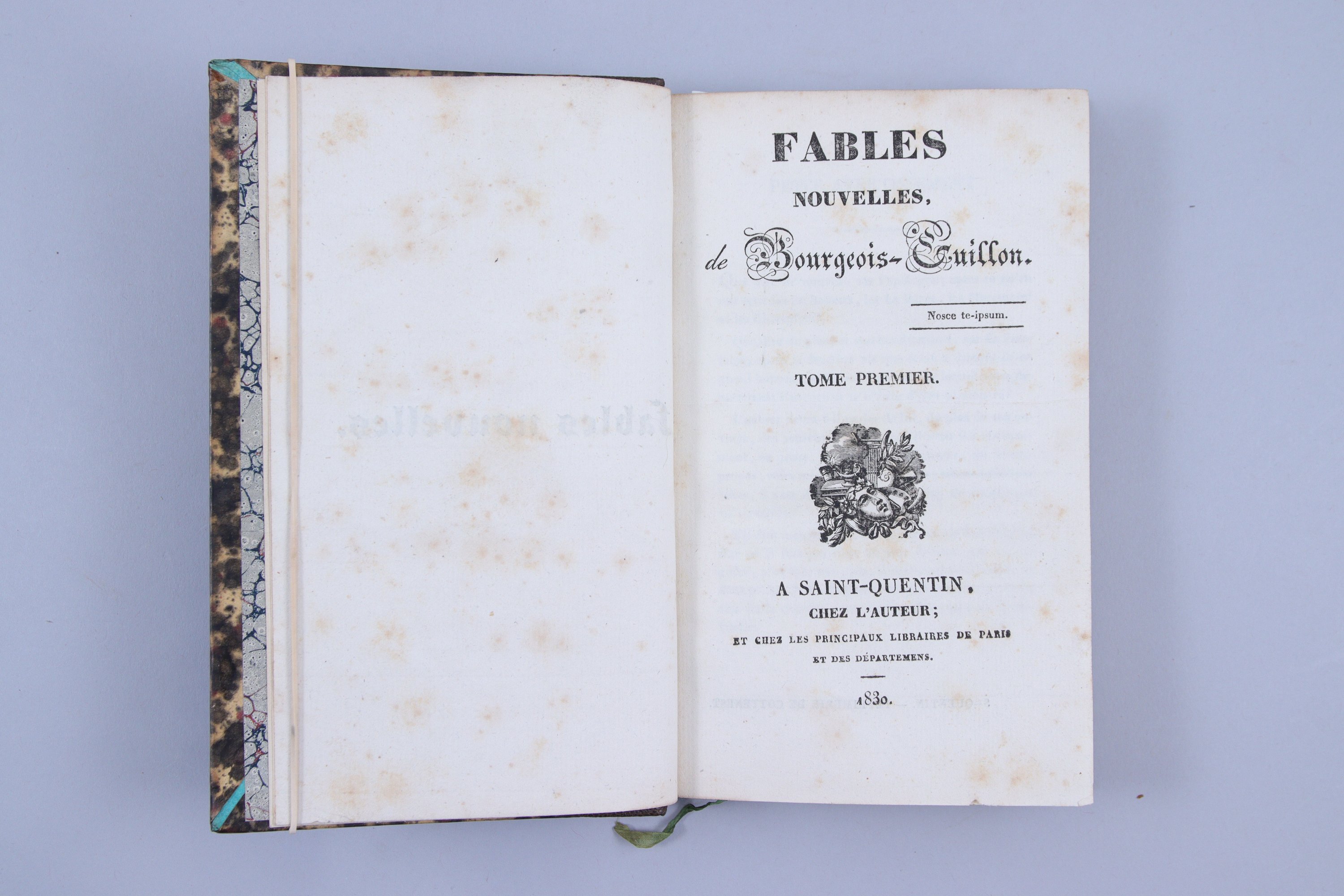 - Bourgeois-Guillon: Fables nouvelles. A Saint-Quentin, chez l'auteur. 1830. 2 tomes en 1 vol. in-12, 1/2 chagrin du temps. L'ouvrage commence par un poème intitulé:"A la ville de Saint Quentin, le fabuliste reconnaissant".