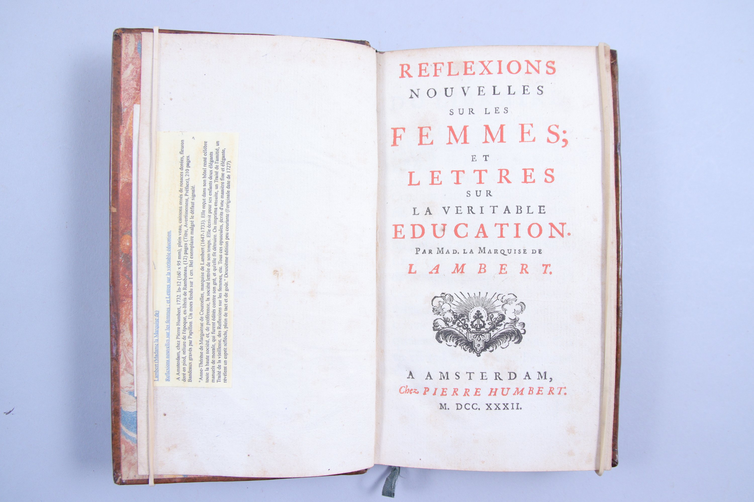 Bel exemplaire de l'édition originale. L'ouvrage avait été publié une première fois à Paris, en 1727, sans le consentement de l'autrice, et amputé de quelques passages. Le texte de cette édition imparfaite, dont Madame de Lambert avait fait acheter une grande partie pour la détruire, fut traduite en anglais sous le titre de The Philosophy of Love.