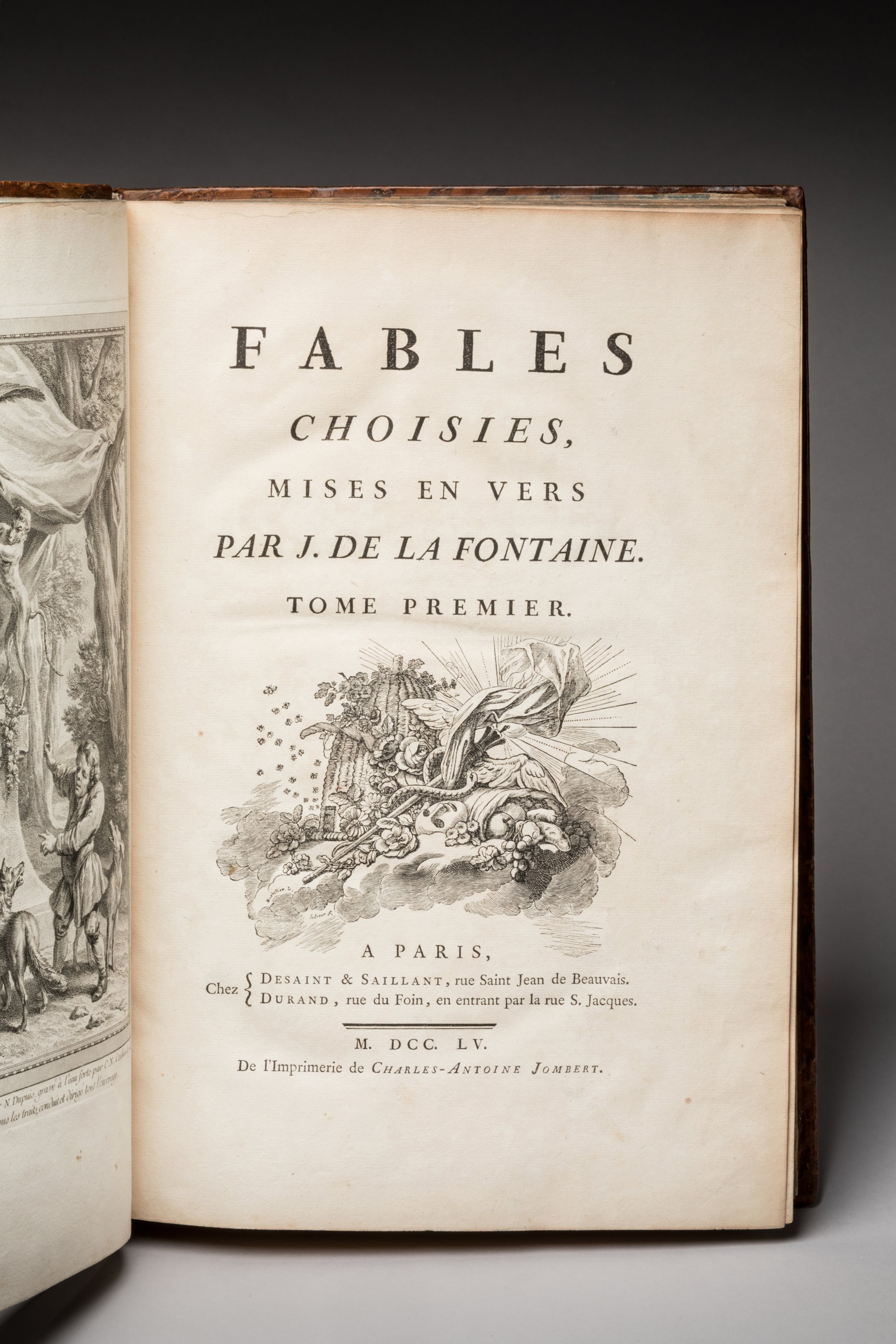 "On doit signaler ... un premier état de la 2ème gravure de la fable "Le Singe et le Léopard": la banderole fixée à la cage du Léopard ne porte aucune inscription. Les exemplaires contenant cette épreuve [tome III, page 113] sont très recherchés, comme étant de premier tirage. " (Rochambeau). Cest le cas ici.