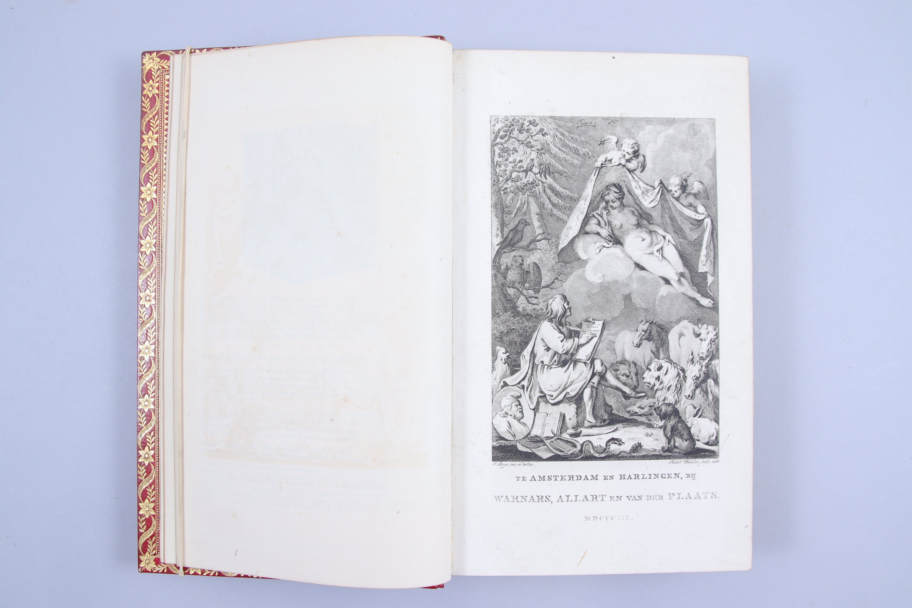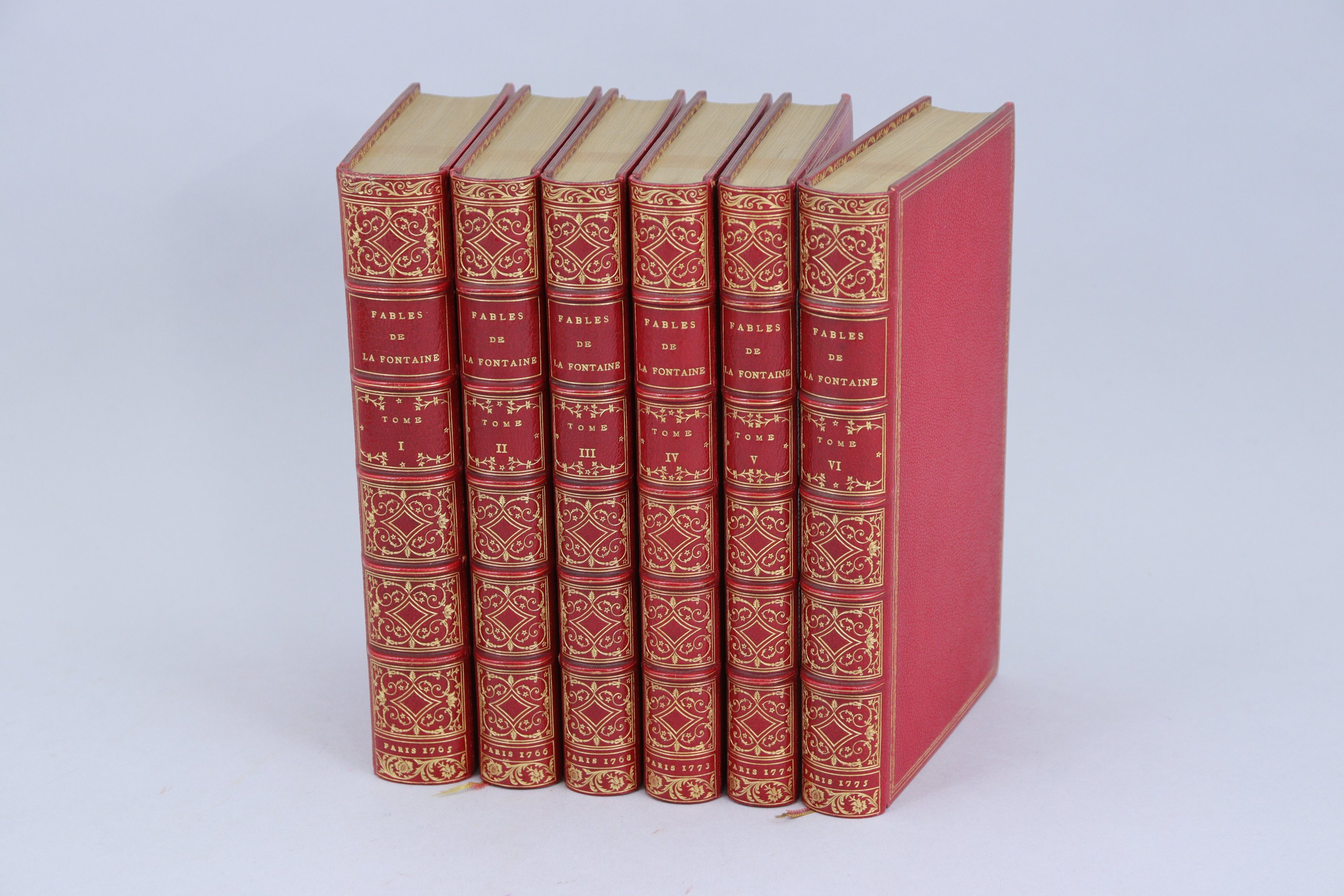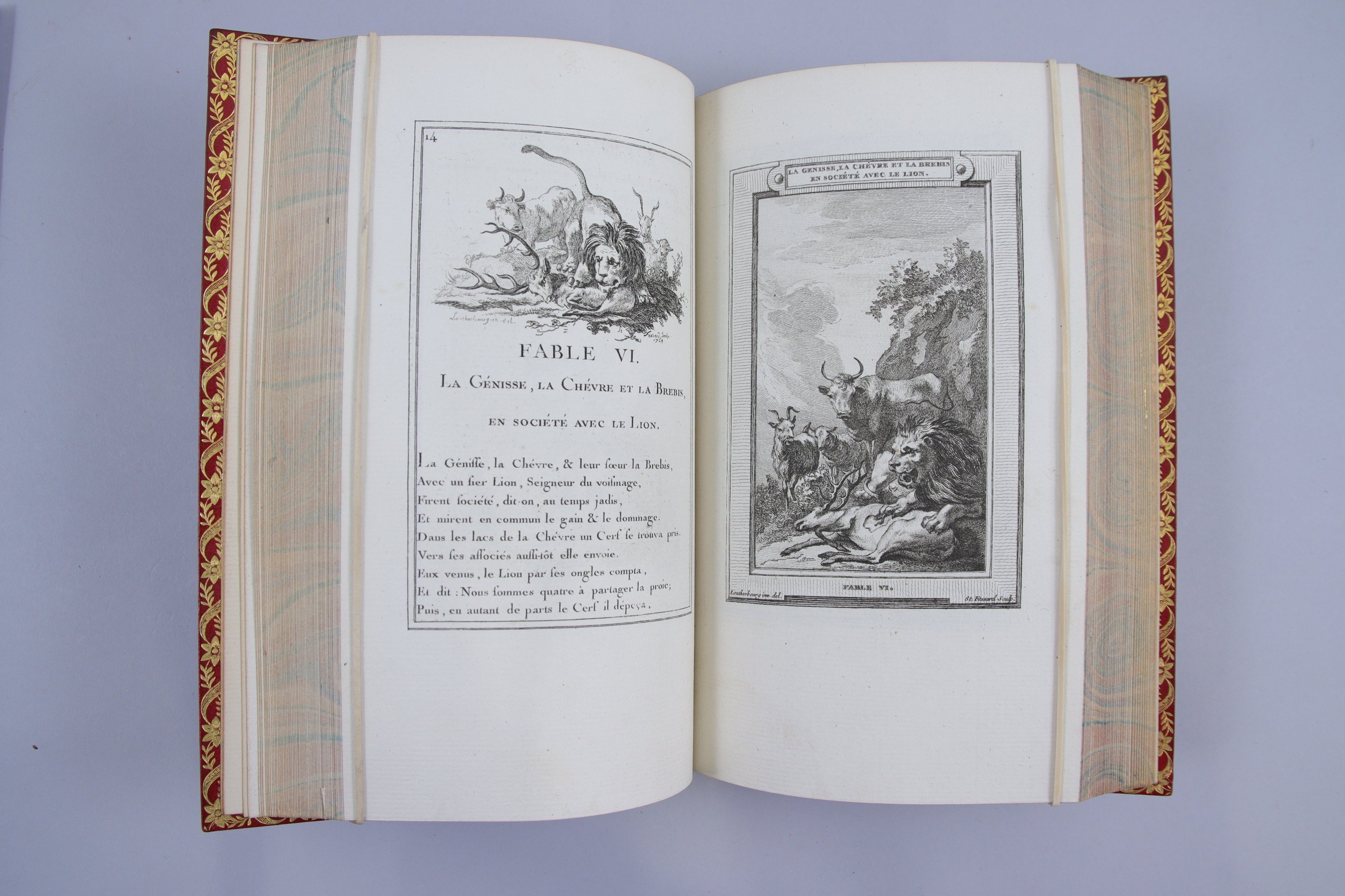 Exemplaire enrichi des 276 gravures de Punt et Vinkeles, tirées sur beau vergé, belles réductions des gravures d'Oudry pour l'édition des Fables à l'adresse de Leiden et Amsterdam, commencée probablement vers 1761. "Commencée en 1761, cette édition traîna sans souscripteurs et sans succès. Le second volume ne parut que 3 ans après, le troisième 9 ans, .le quatrième 14 ans, les deux derniers 25 ans seulement après le premier" (Rochambeau, n°99). Tous les bibliographes (Lacroix, Rochambeau, Cohen) s'accordent pour dire que "le texte [de l’édition de Leiden] est détestable comme impression et comme incorrection" -mais que les gravures sont d'une grande finesse. En tête du vol. I, est placé le frontispice de Vinkeles, d'après Buys, daté 1786 - et mis en vente en 1803... Comme le remarque Cohen (col. 302), qui date cette édition de 1784-1786, "toutes les gravures de cet ouvrage sont très belles". Il ajoute pour tout simplifier que "les exemplaires portant ... la date de 1802 sont de premier tirage".