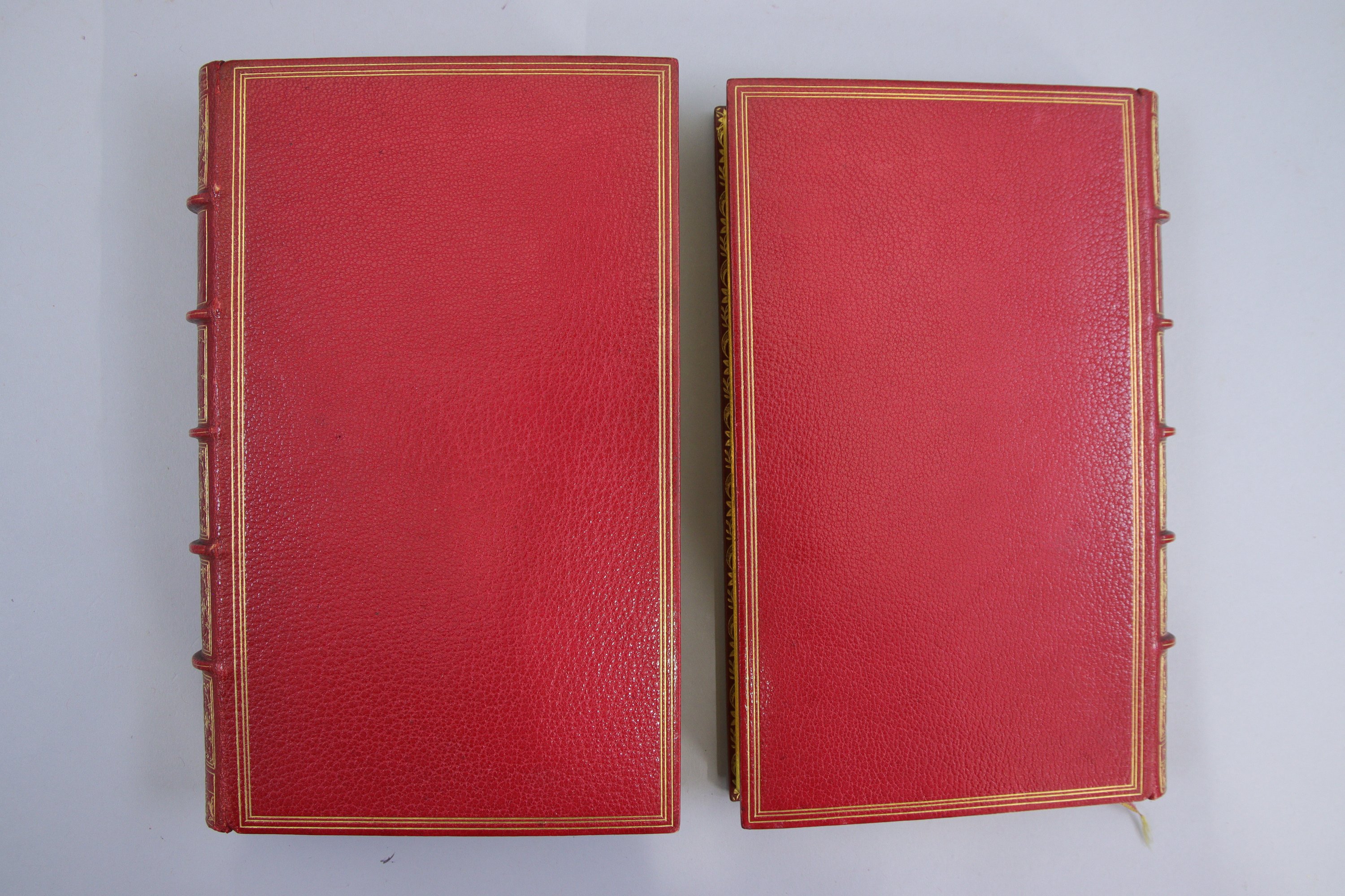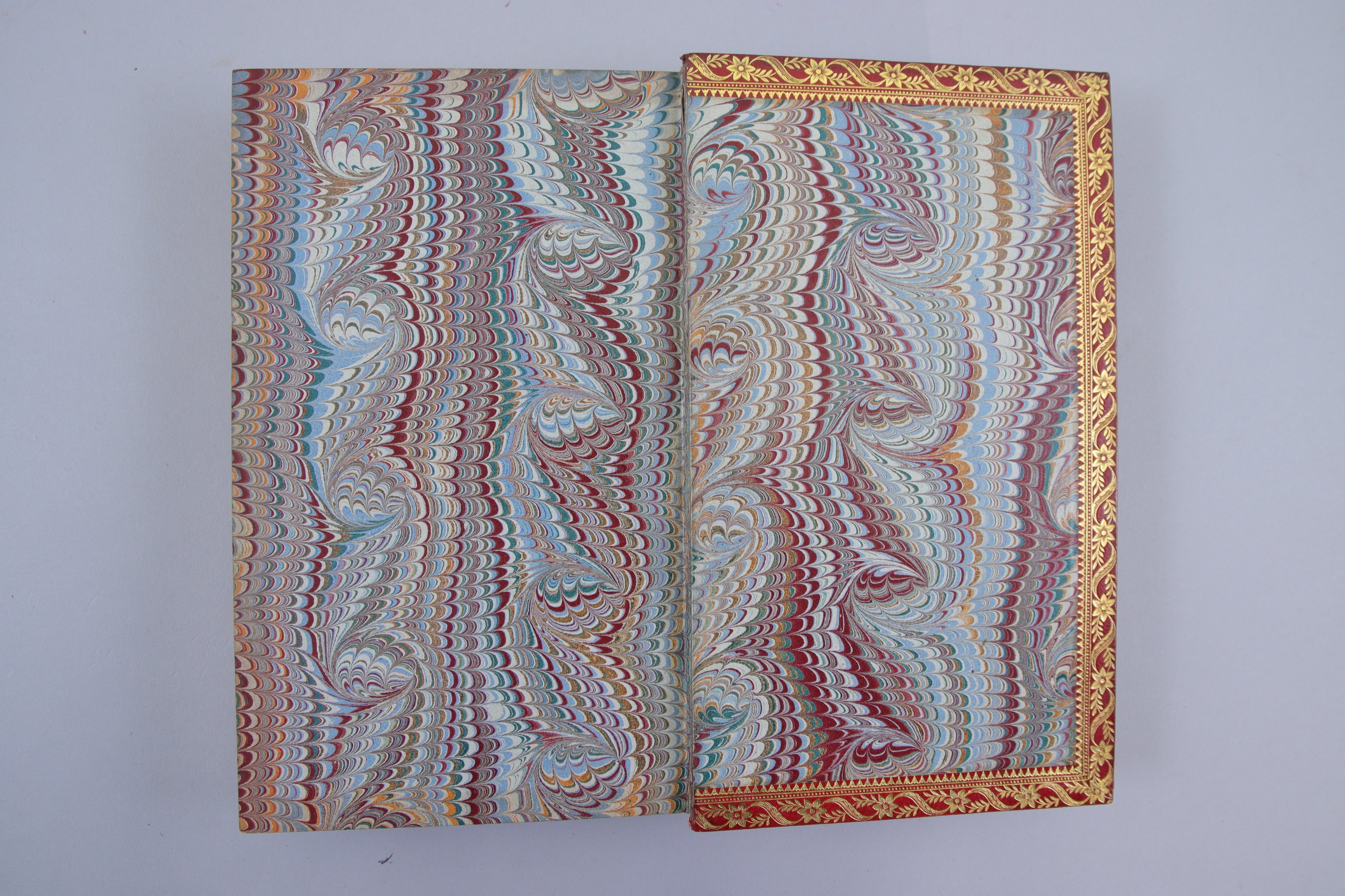 Plein maroquin rouge, triple filet d'encadrement ; dos à 5 nerfs, soulignés d'un filet droit ; riche décor d'arabesques dans les caissons ; filet double sur les coupes ; large rinceau intérieur, bordé de 3 filets variés. Toutes tranches dorées sur marbrure.