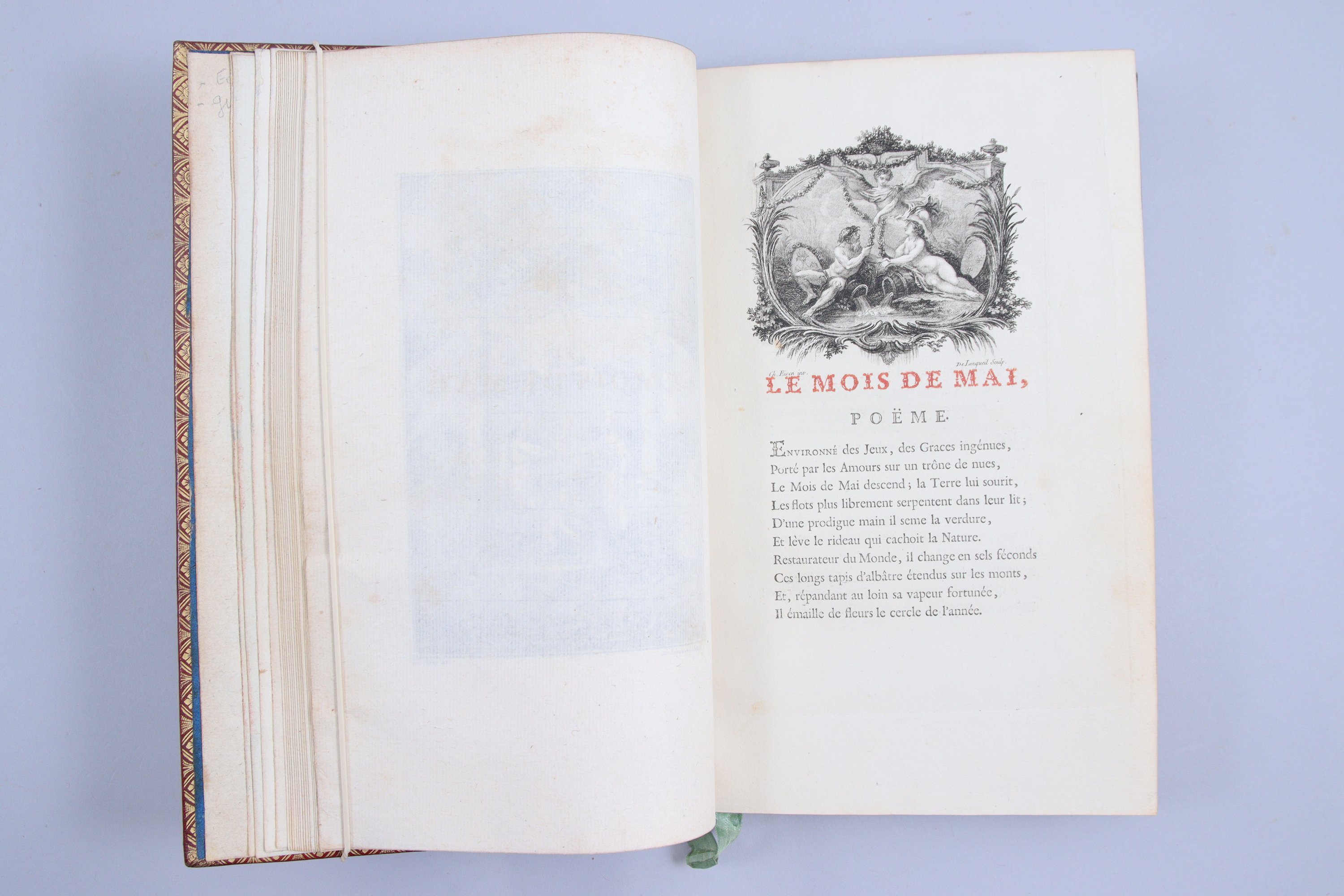 Premier tirage de lédition originale, reconnaissable aux erreurs de pagination dans Le Mois de Mai. Très bel exemplaire sur grand papier de Hollande, à grandes marges, avec les titres en rouge, sans aucune rousseur, du "chef d'oeuvre du XVIIIème siècle" (Cohen).
