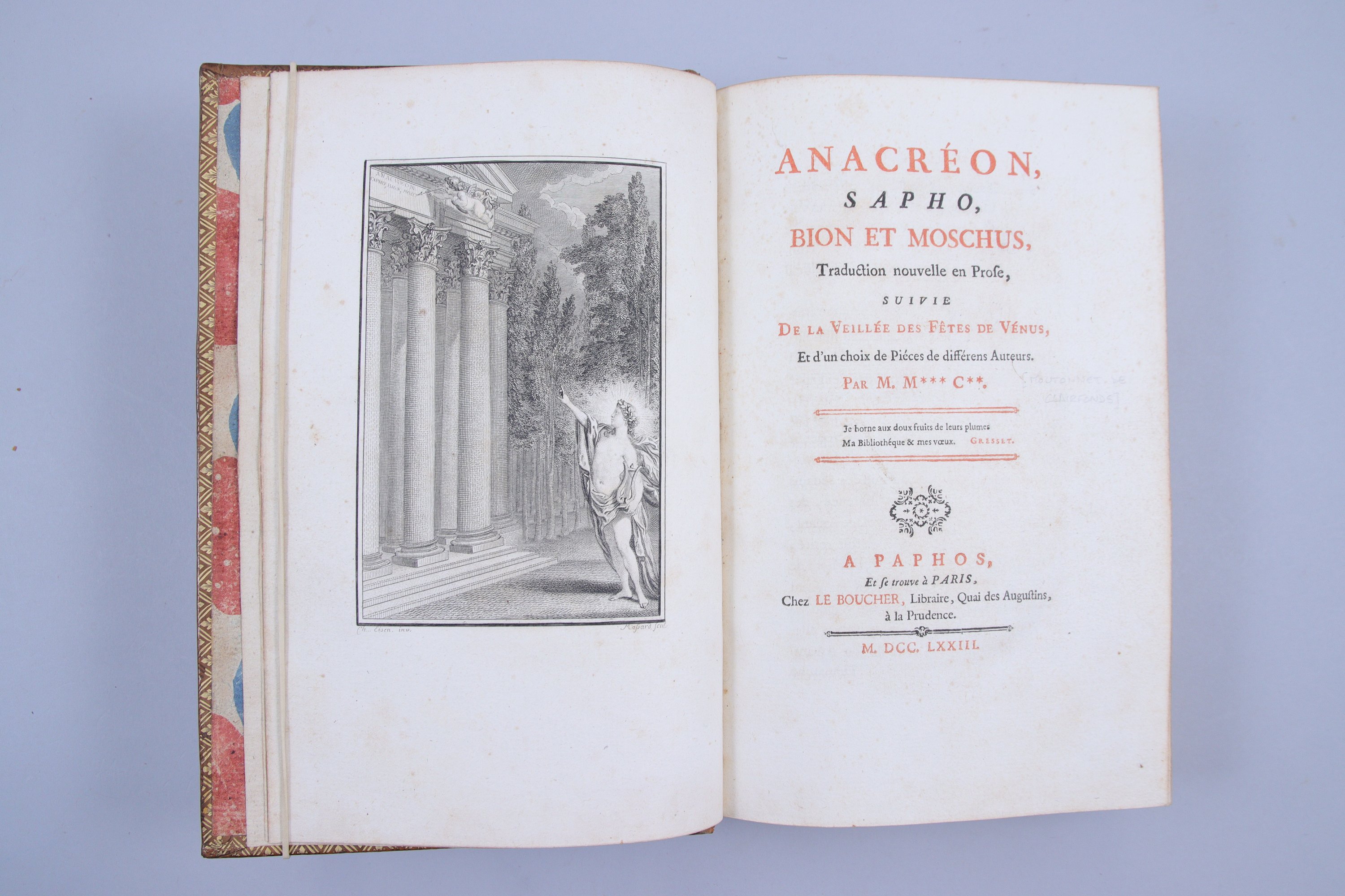 Anacréon, Bion, Sapho et Moschus. Traduction nouvelle en prose, suivie de la Veillée des Fêtes de Vénus et d'un choix de pièces de différents auteurs. Par M. M***C**.