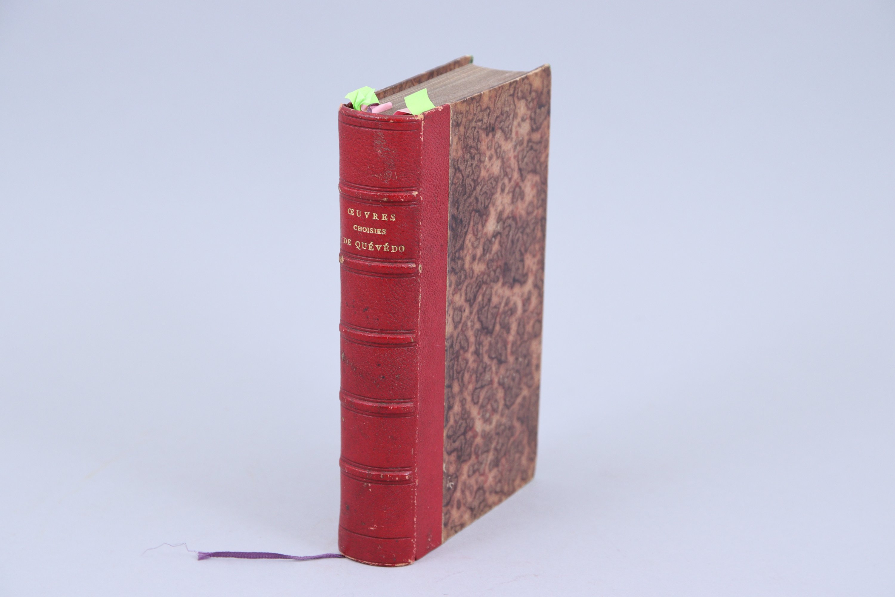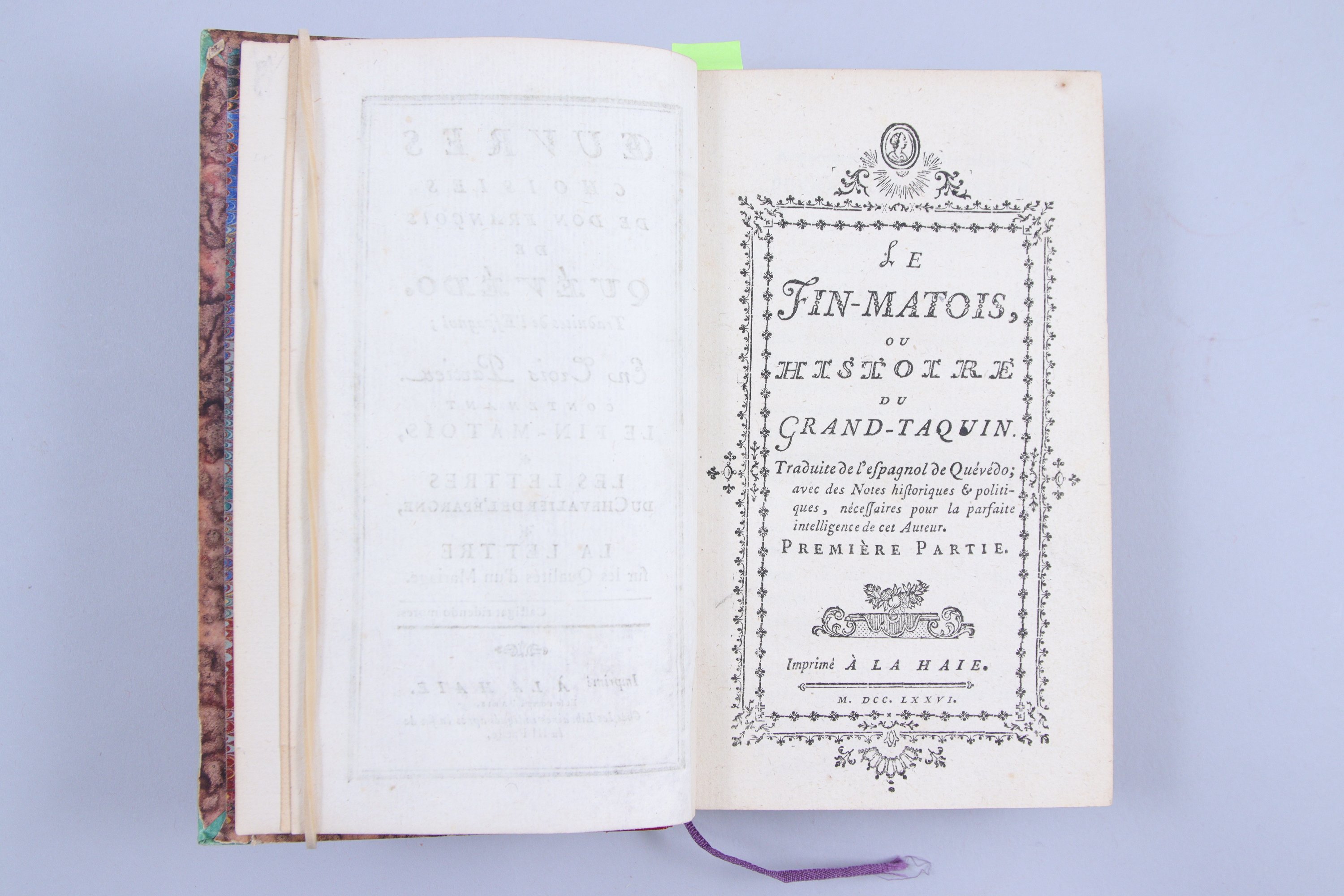 Edition originale. Bien que datée 1776, elle parut en juin 1775, avec le titre général, placé avant le titre du tome I: « Œuvres choisies de Don François de Quévédo … en trois parties, contenant le Fin-Matois, les Lettres du Chevalier de l’Epargne, la Lettre sur les Qualités d’un Mariage. Imprimé à La Haye et se trouve à Paris chez les Libraires indiqués après la fin de la IIIème partie ».