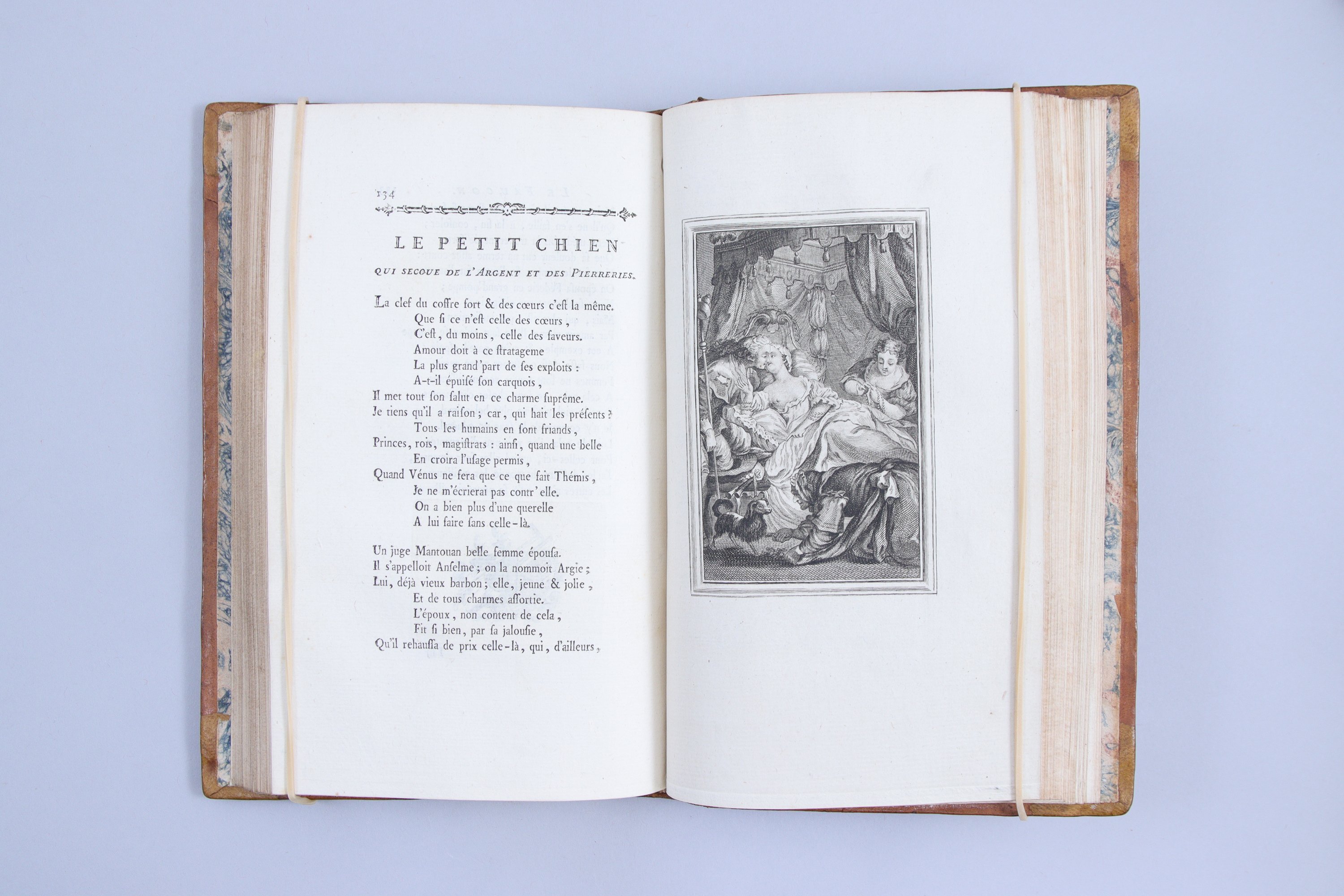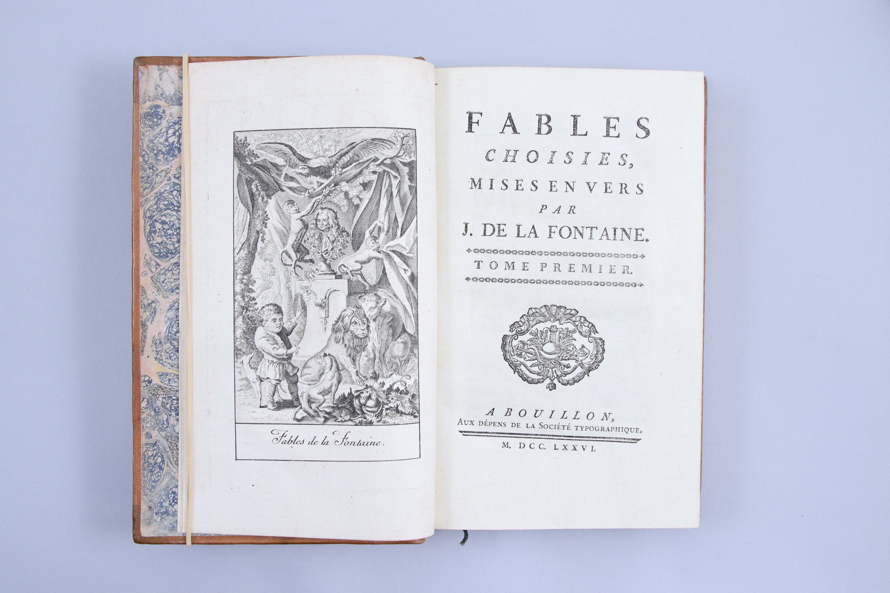 Rare réunion, dans des reliures du temps homogènes, des Fables et des Contes publiés à Bouillon, clandestinement, par Pierre Bouillon.