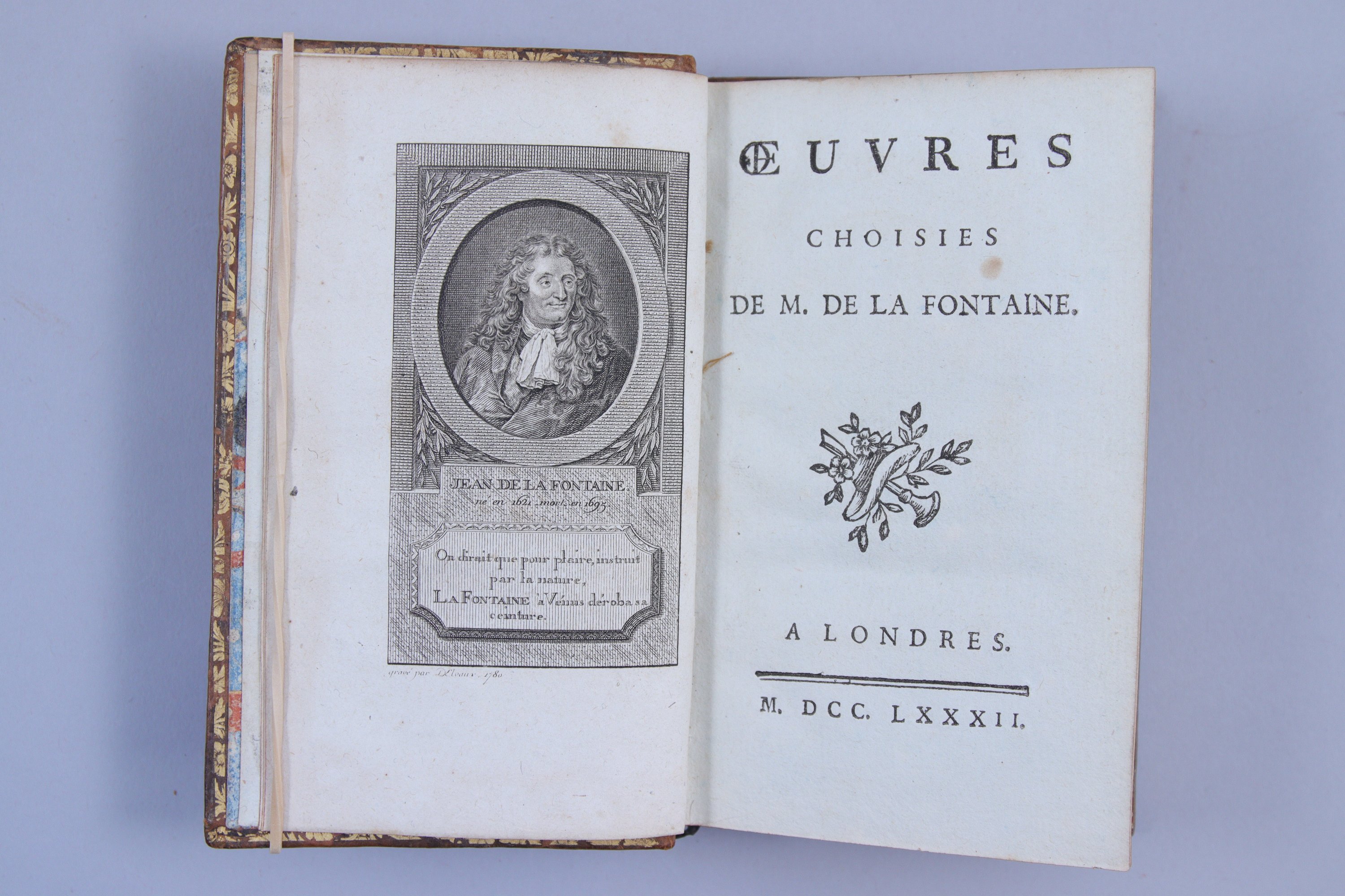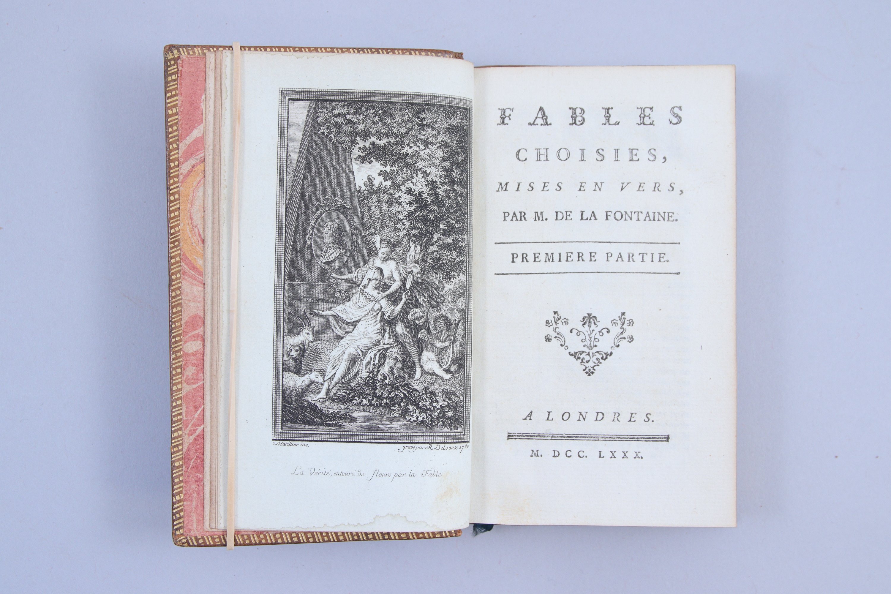 2 parties en 1 vol in-18, veau moucheté, triple filet d'encadrement ; dos orné ; filet sur les coupes, roulette sur les chasses. Toutes tranches dorées.. "Edition Cazin" frappé en queue. Portrait-frontispice de La Fontaine, par Delvaux, daté 1780. (Reliure légèrement frottée)