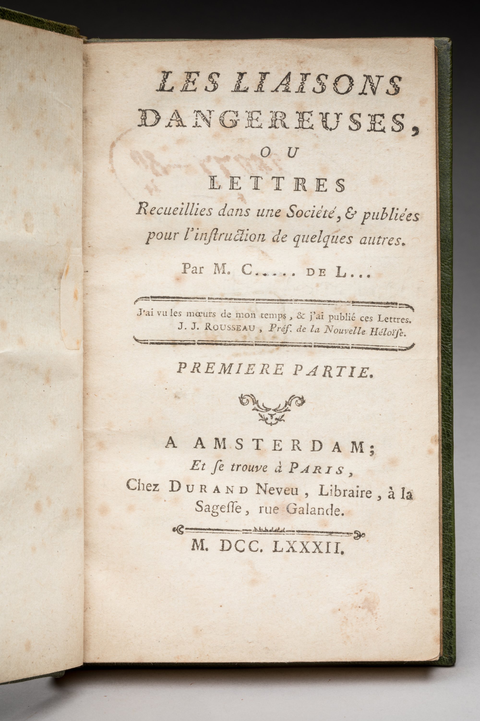 Véritable édition originale des Liaisons Dangereuses, avec le feuillet d'errata. Elle est parfaitement conforme à la description de l'Edition A, Originale. (Max Brun, Bibliographie des éditions des Liaisons Dangereuses portant le millésime 1782, pages 8 à 10)